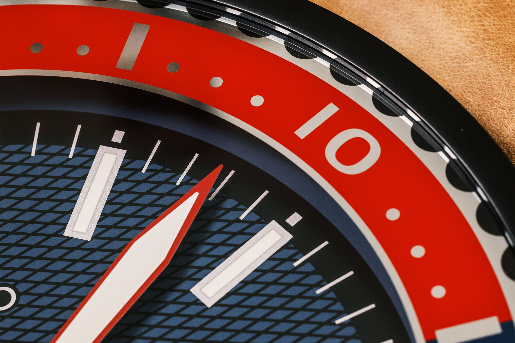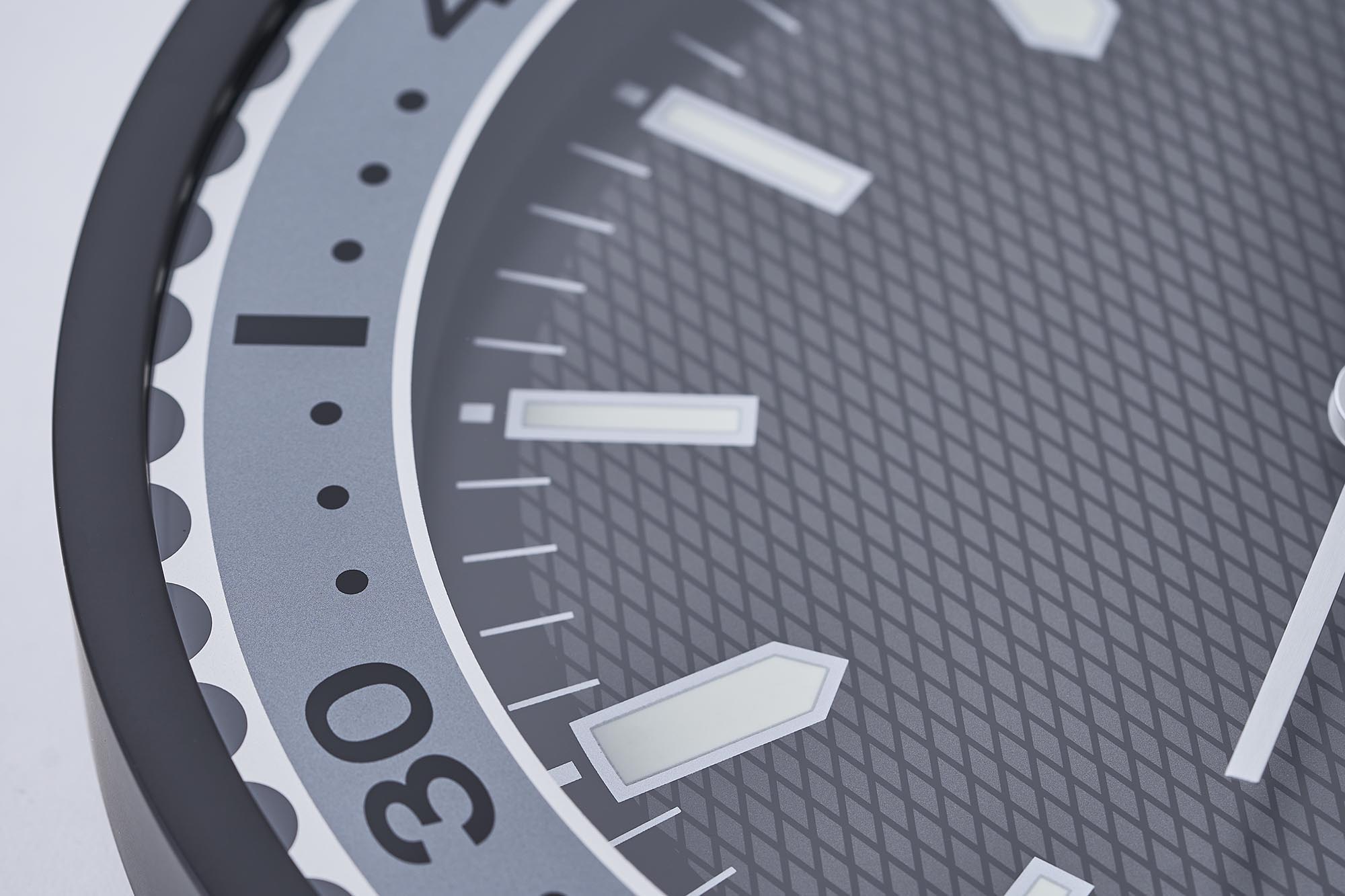Measuring 11.81” in diameter by 1.77” thick, Seiko’s Watch Dial Wall Clock draws its aesthetic inspiration from the brand’s catalog of fan-favorite dive watches, although it is not a direct recreation of any one specific model. The shape of the hour markers is a mix between a few different famous Seiko dive watch dials, while the frame that surrounds the decorative dive-style bezel is highly reminiscent of the iconic shroud that defines Seiko’s various “Tuna” watches.