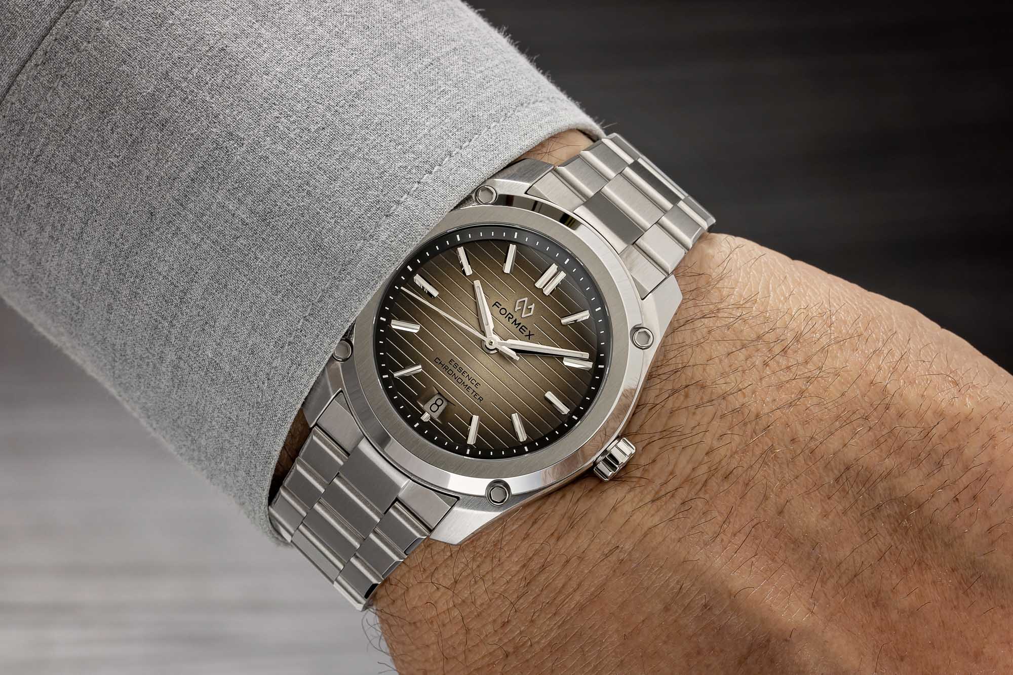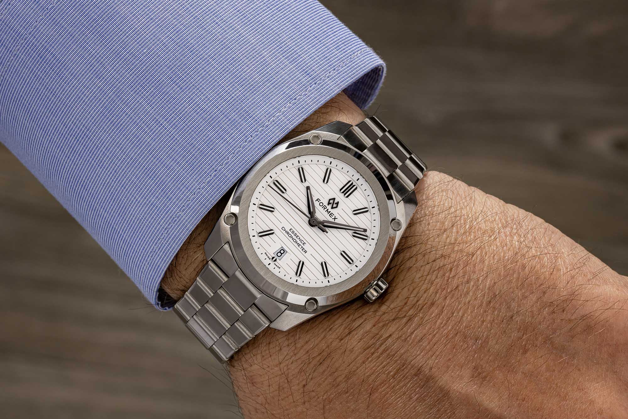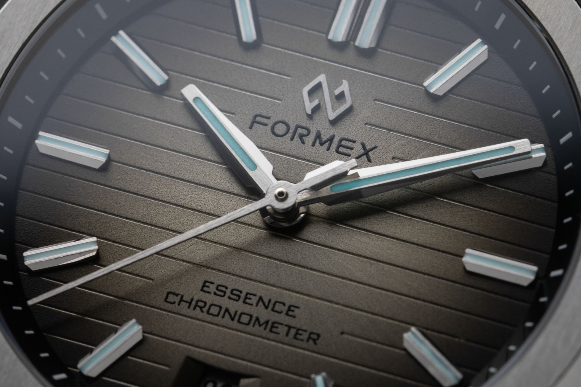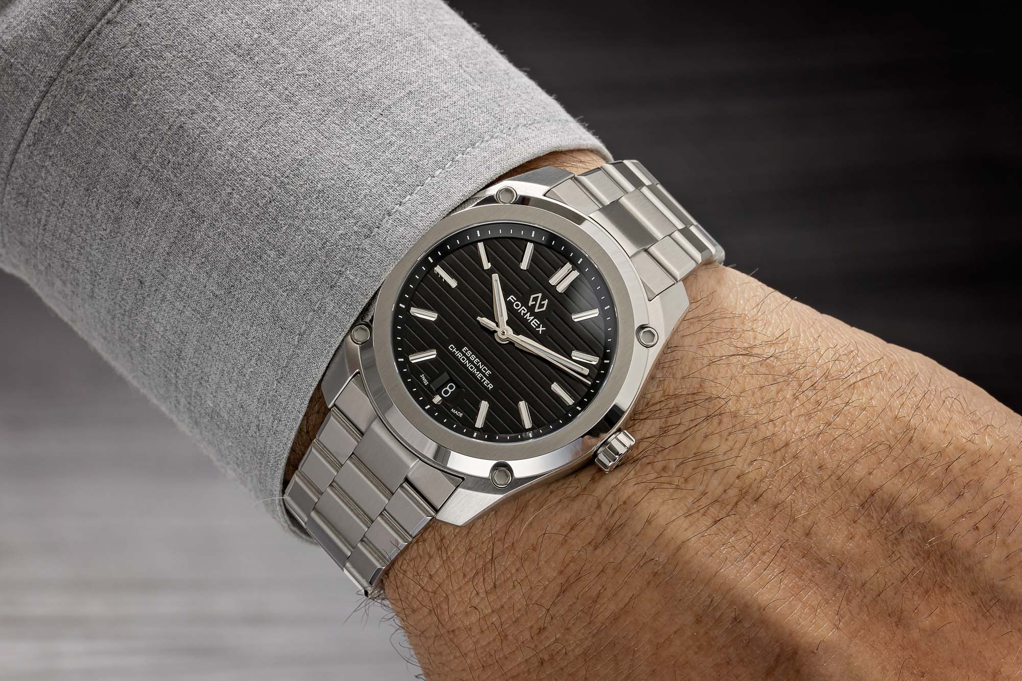 Its horizontally brushed dial features CNC-machined grooves, applied indices, and a beveled date window at 6 o’clock. The stainless steel case blends brushed surfaces with polished accents and integrates Formex’s patented suspension system, providing both comfort and shock resistance. A box-shaped sapphire crystal with anti-reflective coating ensures clarity from every angle, while the exhibition caseback reveals the decorated Swiss movement within.