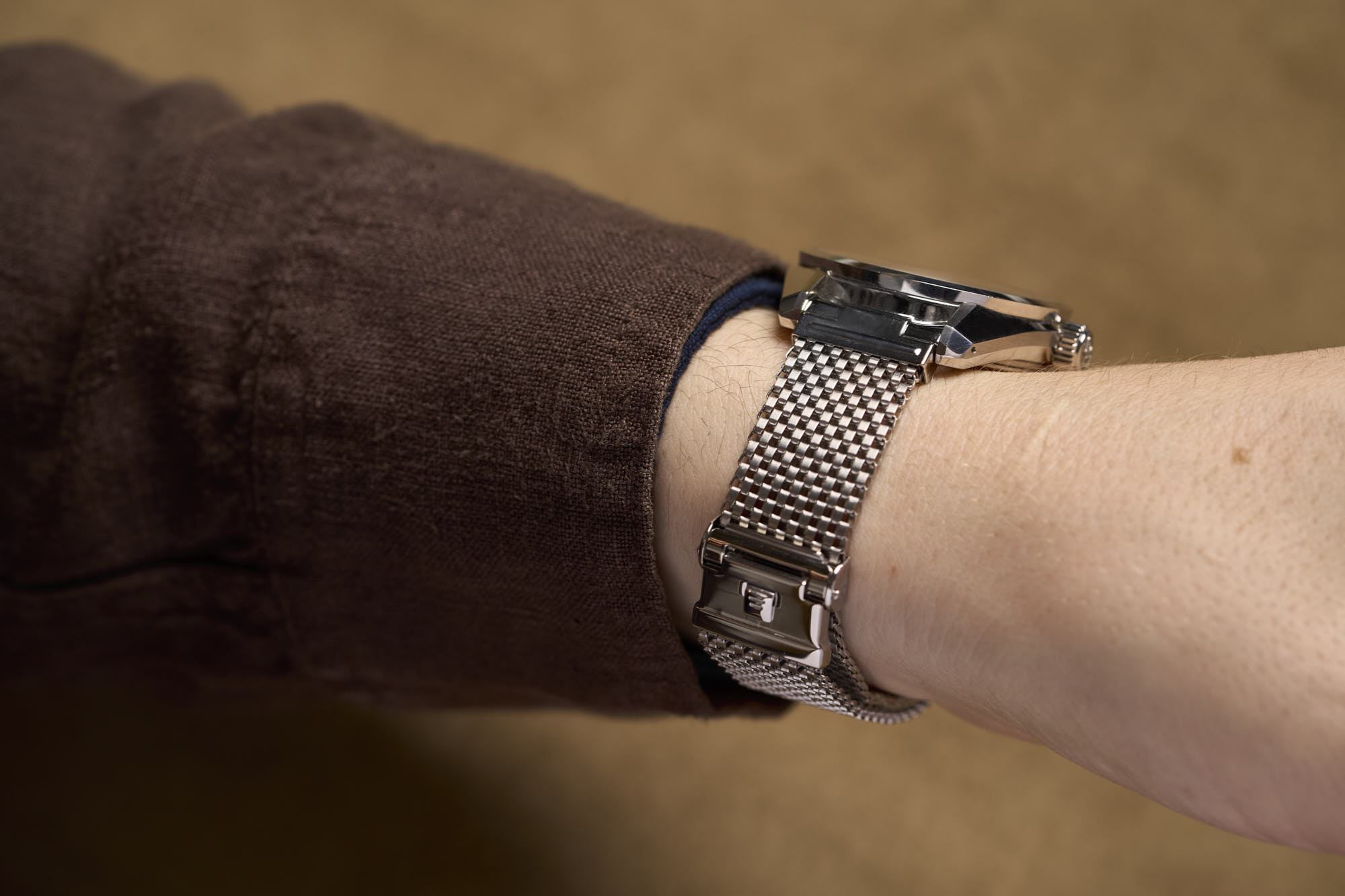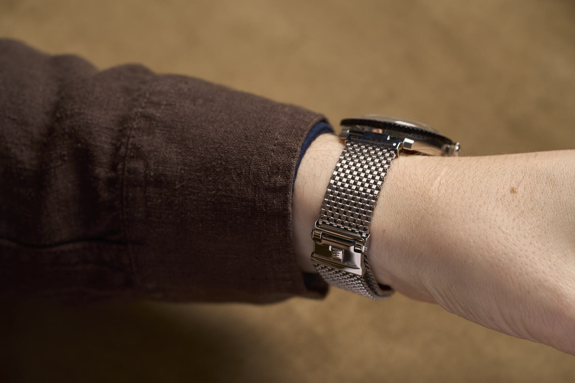 The present wide version Komfit band has all the features that popularized the bracelet with NASA astronauts, but the width has been increased to more contemporary proportions. In particular, this wide version Komfit band has an 18mm wide central mesh portion, and spring-loaded end pieces that expand to fit watches with lugs up to 22mm (it can compress inward to fit watches with lugs as narrow as 19mm). The bracelet is otherwise identical to the classic Komfit -- with its square-patterned mesh, beautifully decorated spring-loaded end pieces, forward-facing clasp, and ability to be easily sized in micro-increments for the perfect fit.