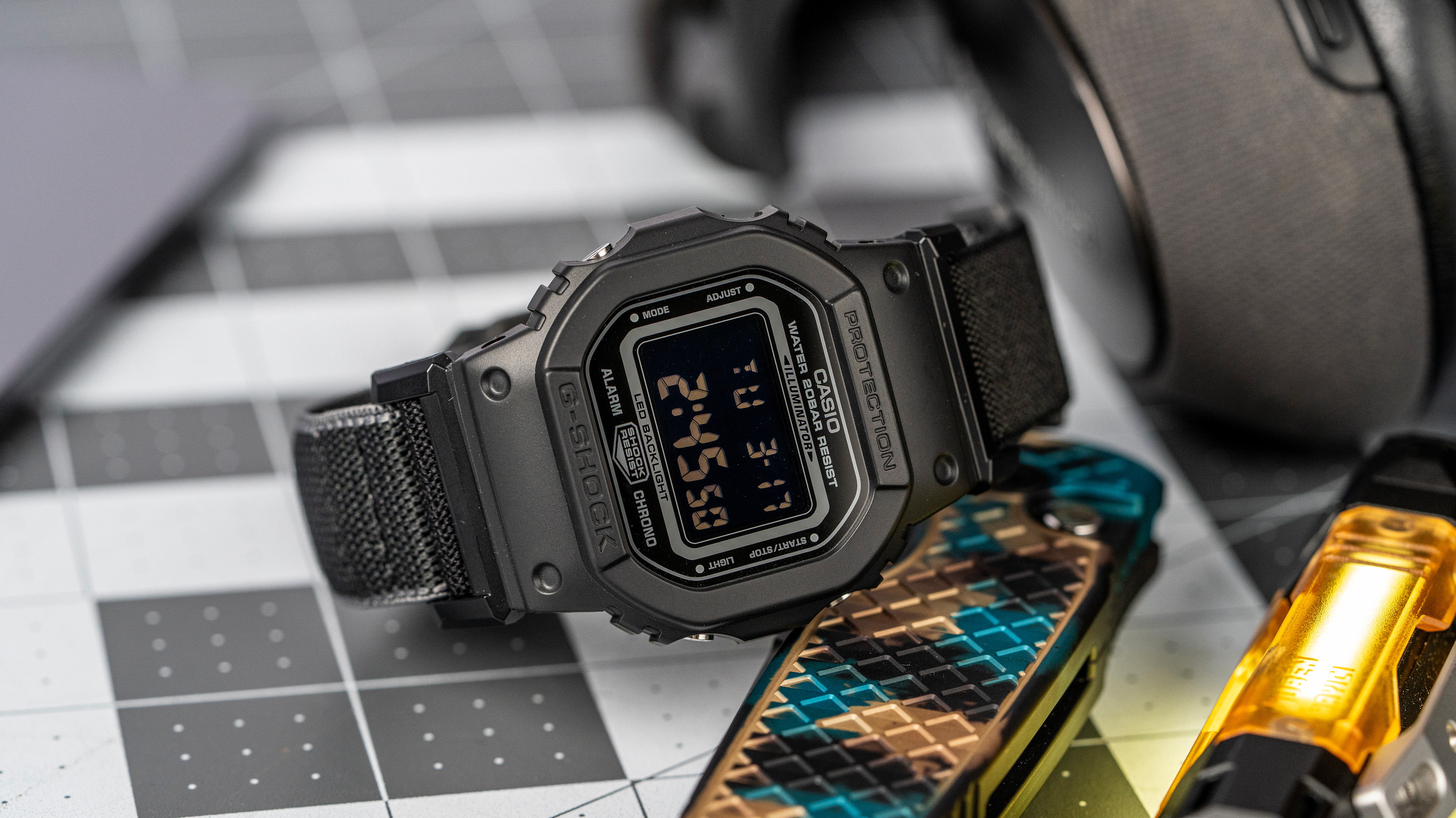 The G-SHOCK DW-5600MNC Series is the first official collection from Casio to feature a factory-installed FIDLOCK® magnetic buckle system. This fastening technology, frequently utilized in high-end technical apparel and cycling gear, uses magnets to guide the clasp into position before a mechanical lock secures it. The watch utilizes a specialized stretch cloth band made from a polyester and polyurethane blend that can expand up to 2.7 times its original length. This elasticity allows the watch to be worn directly on the wrist or over the sleeve of a jacket during outdoor activities.
