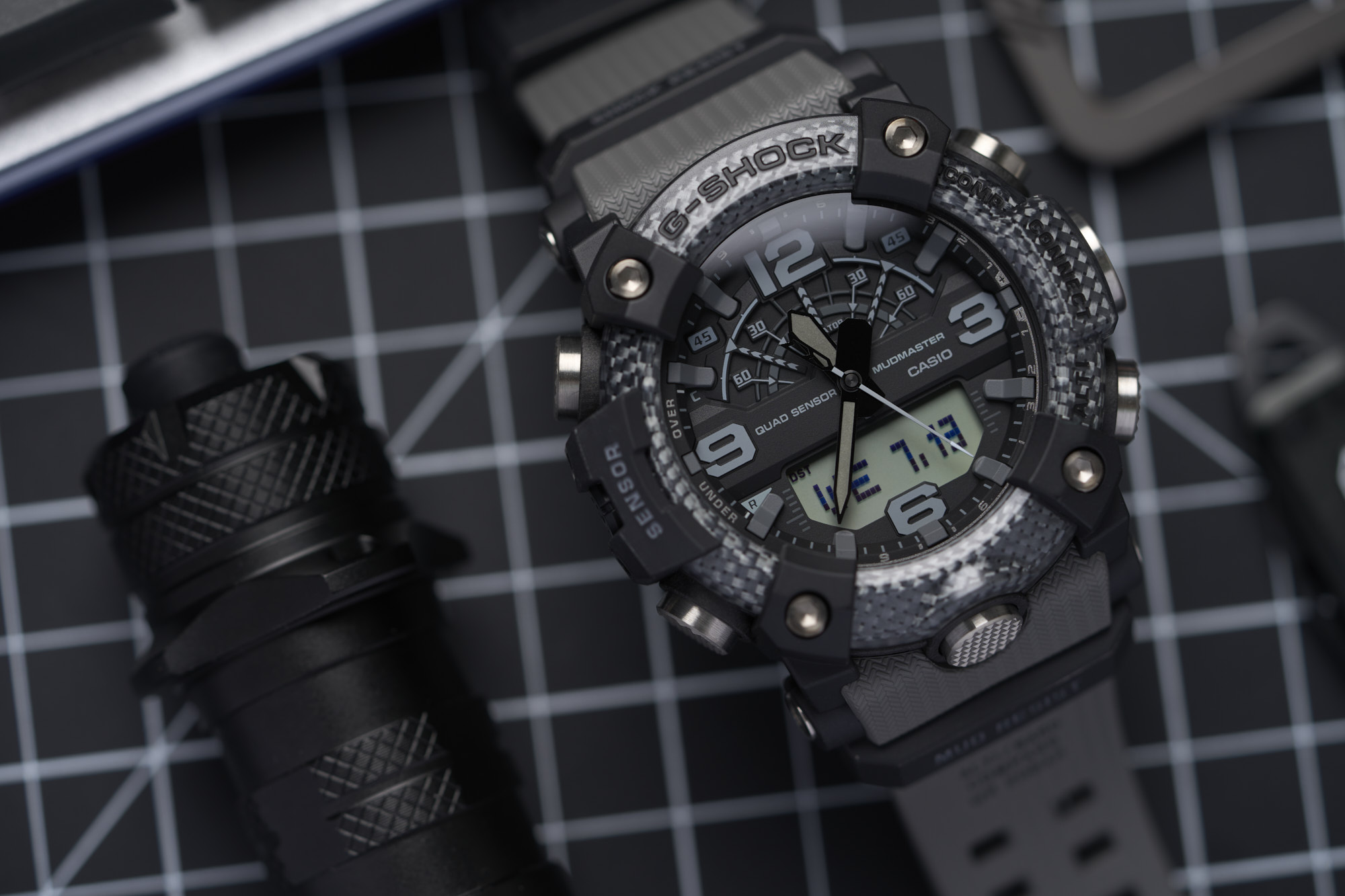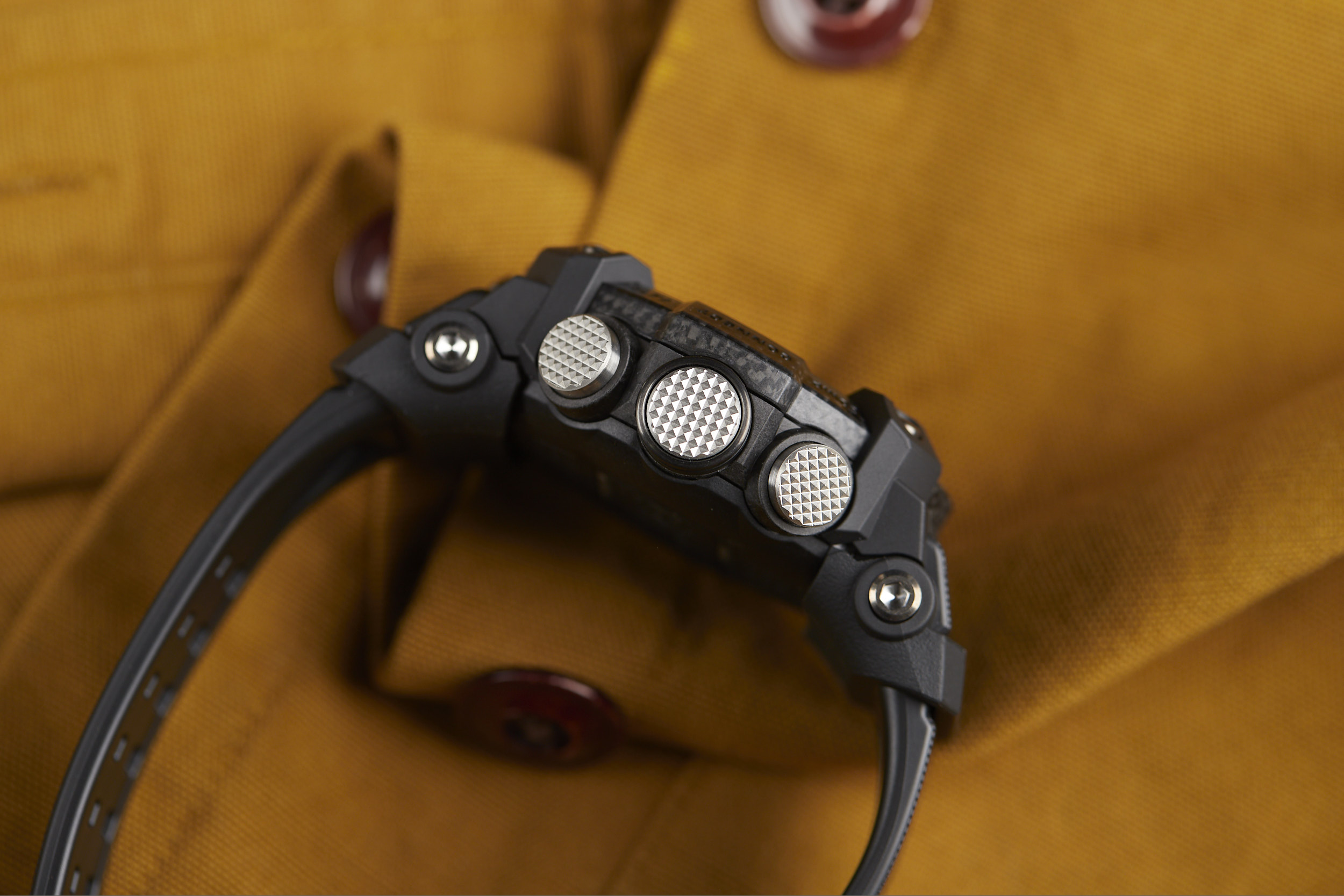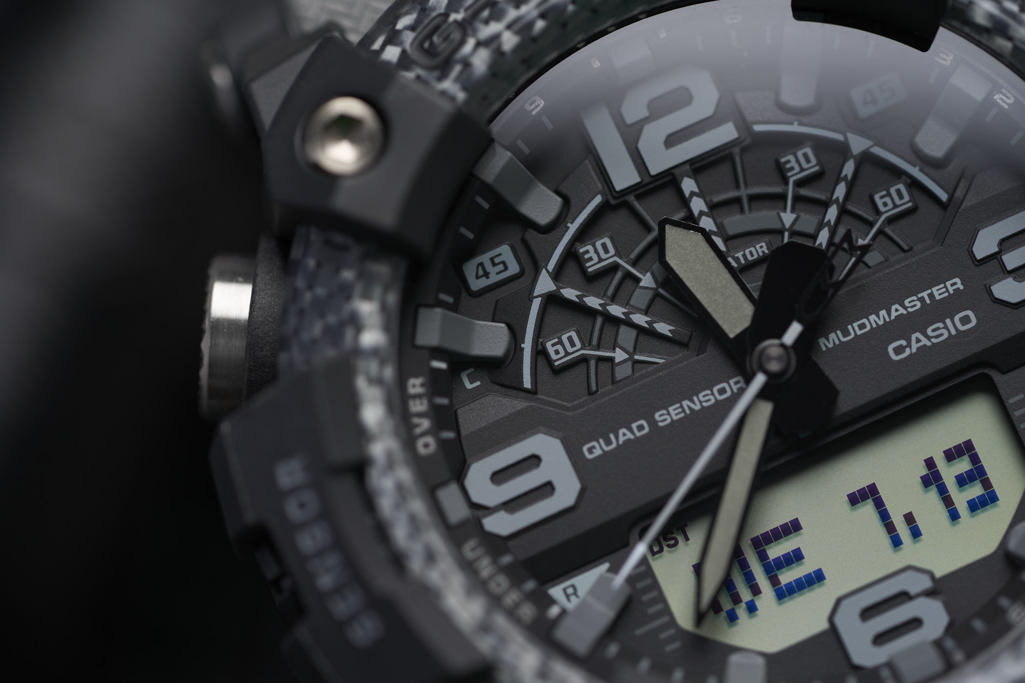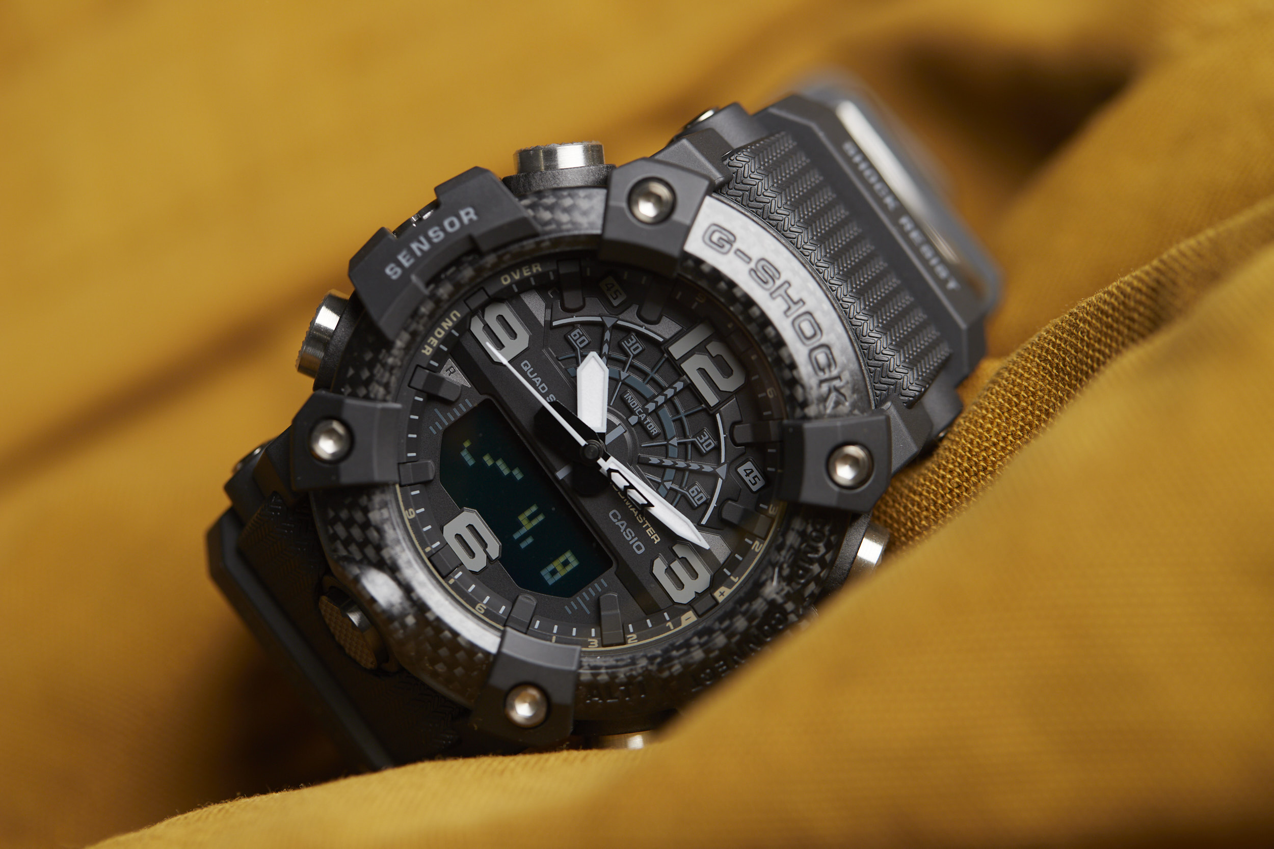 Measuring in at a bold 53.1mm wide by 55.4mm lug-to-lug with a thickness of 19.3mm, the Mudmaster makes quite the statement. It’s not just large for the sake of being large, as the case houses the G-SHOCK “Quad Sensor” - an array of tools including a thermometer, altimeter/barometer, digital compass, and step counter. Metal button pipes for each of the six buttons make for a tighter seal to keep out mud and debris, while a dual-layer caseback further ensures protection from the elements.