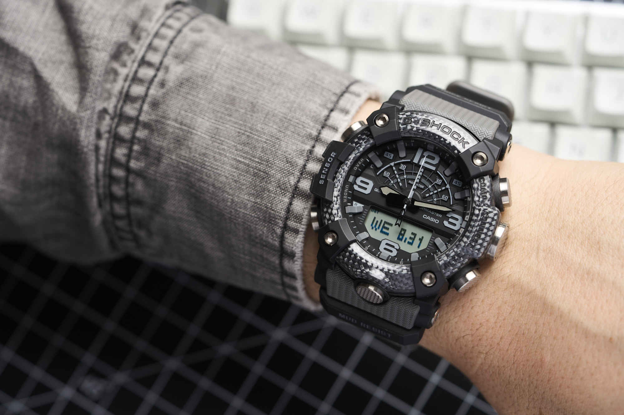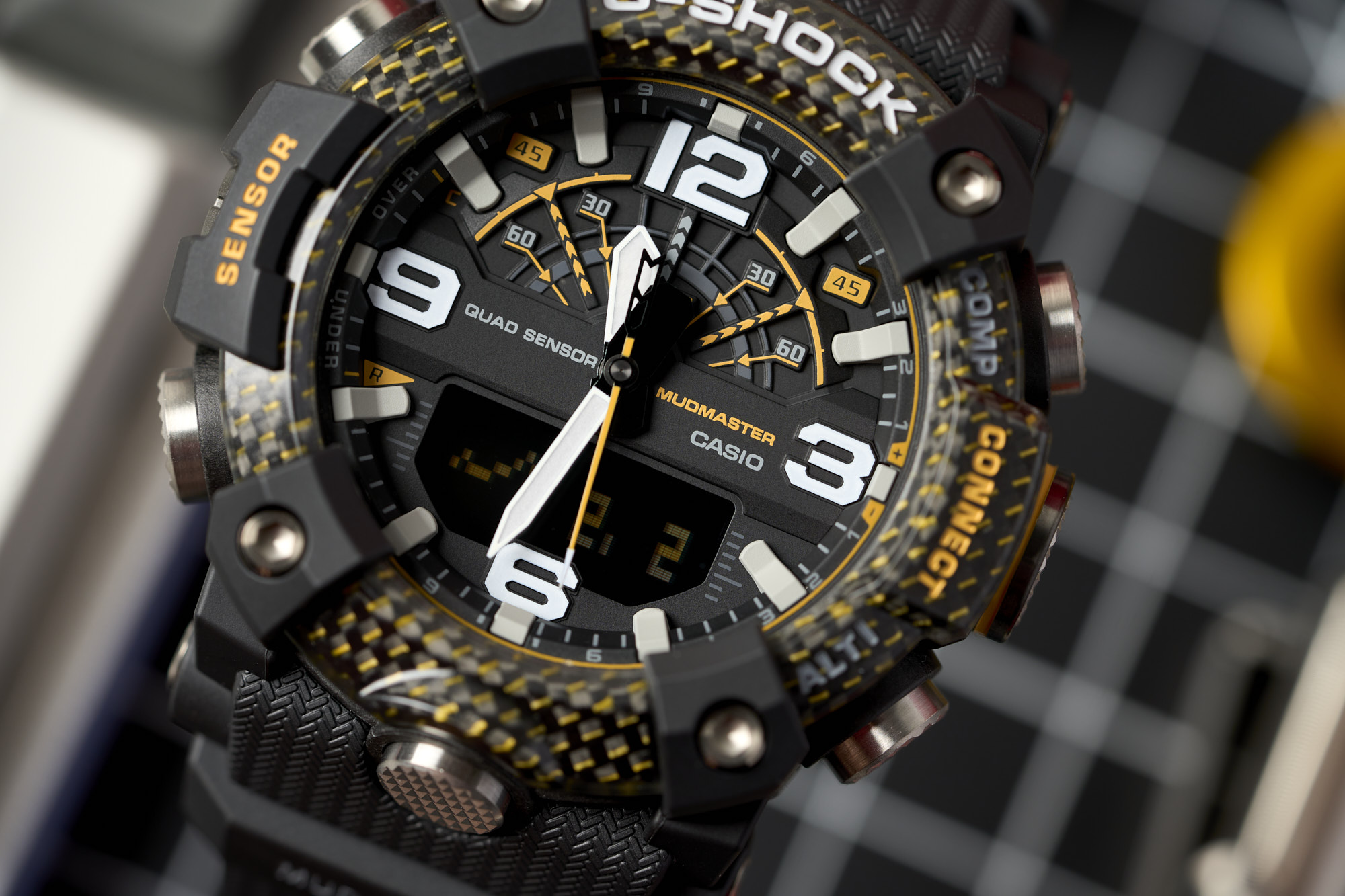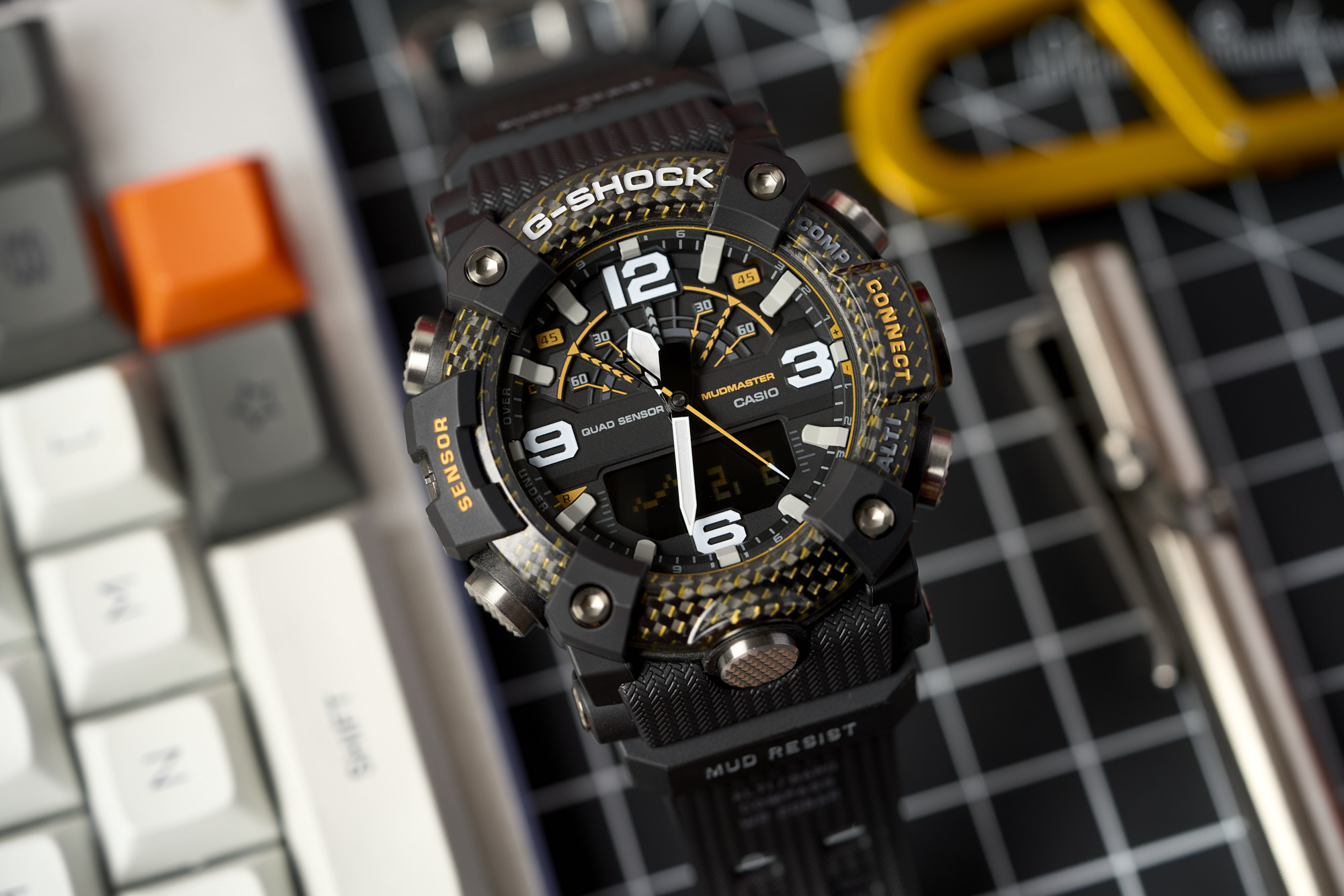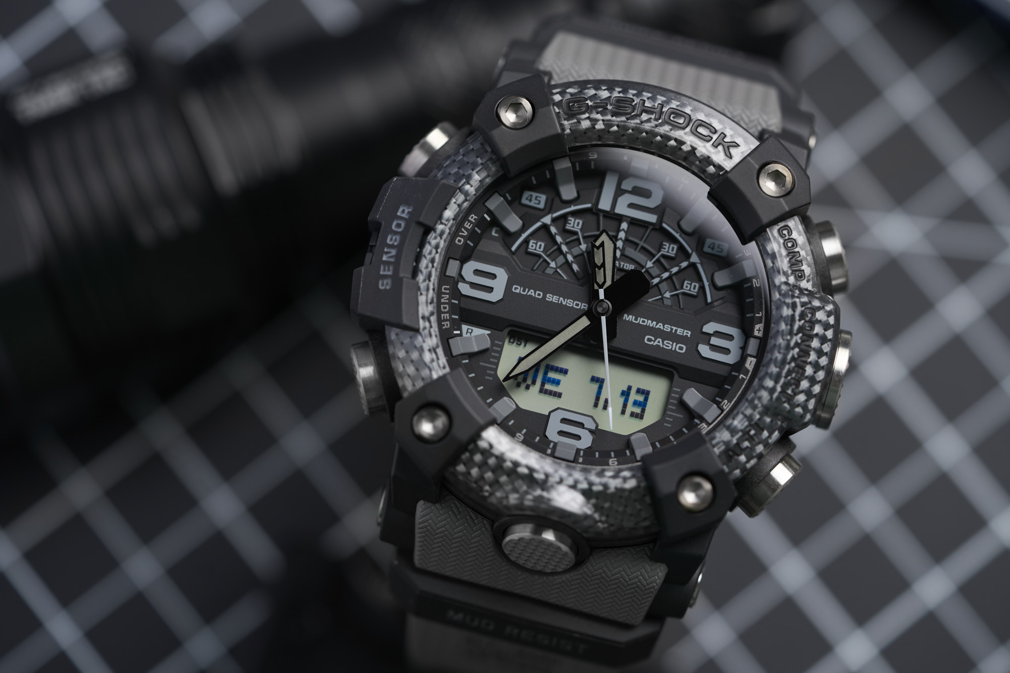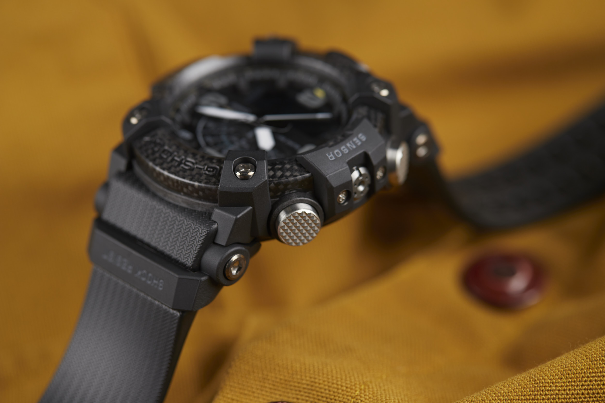 Measuring in at a bold 53.1mm wide by 55.4mm lug-to-lug with a thickness of 19.3mm, the Mudmaster makes quite the statement. It’s not just large for the sake of being large, as the case houses the G-SHOCK “Quad Sensor” - an array of tools including a thermometer, altimeter/barometer, digital compass, and step counter. Metal button pipes for each of the six buttons make for a tighter seal to keep out mud and debris, while a dual-layer caseback further ensures protection from the elements.