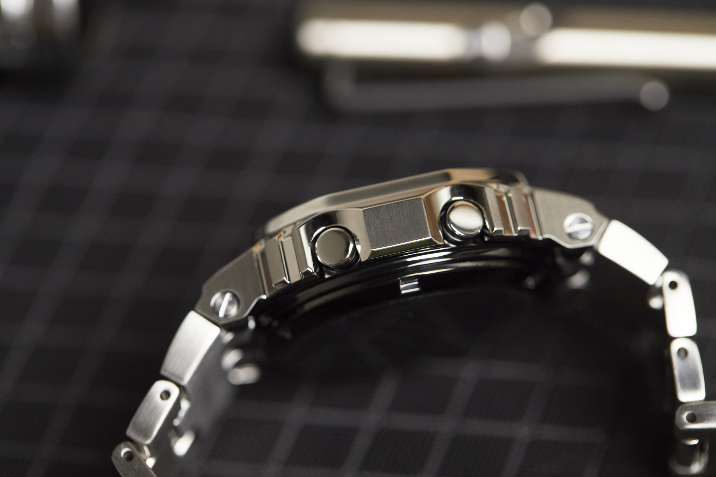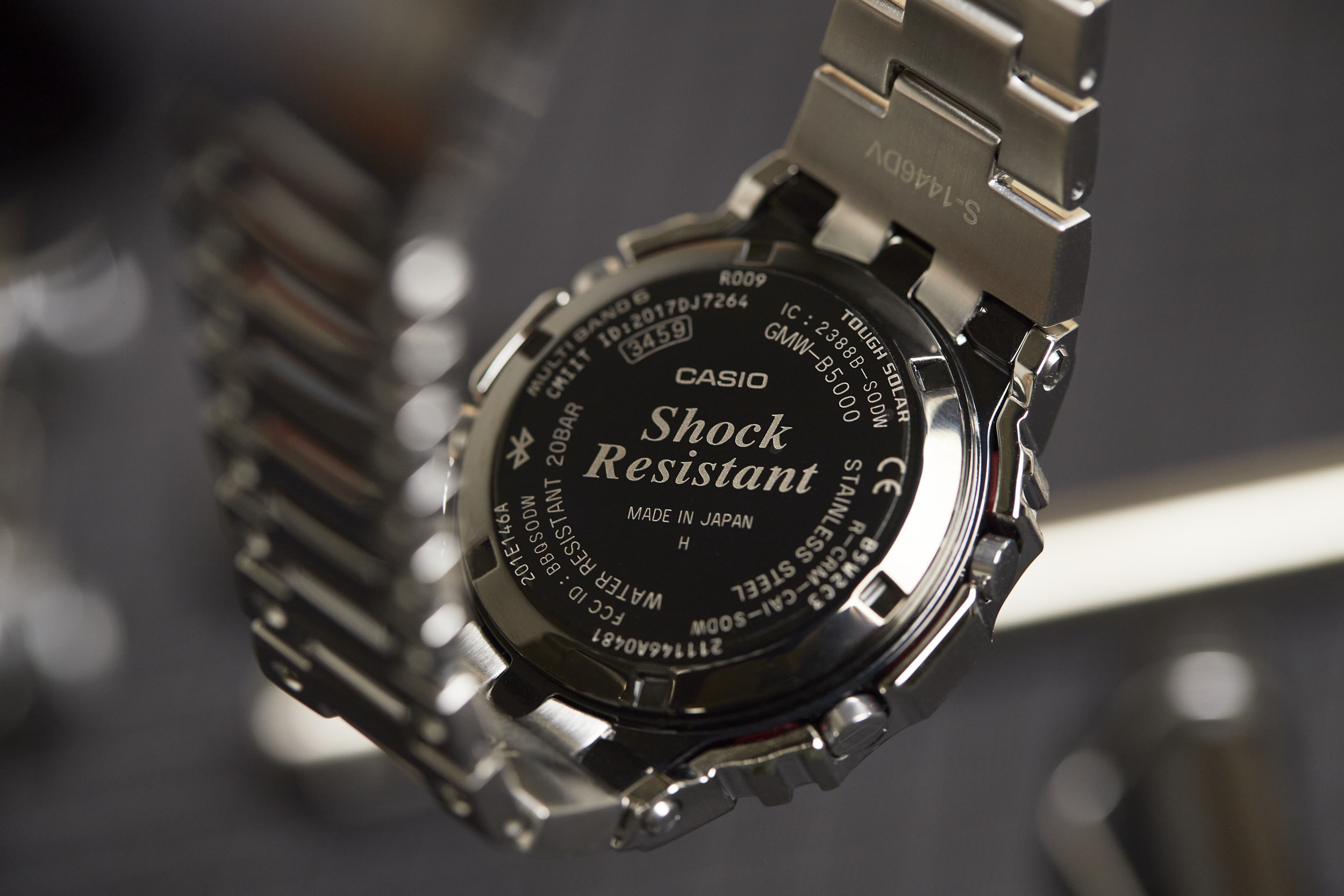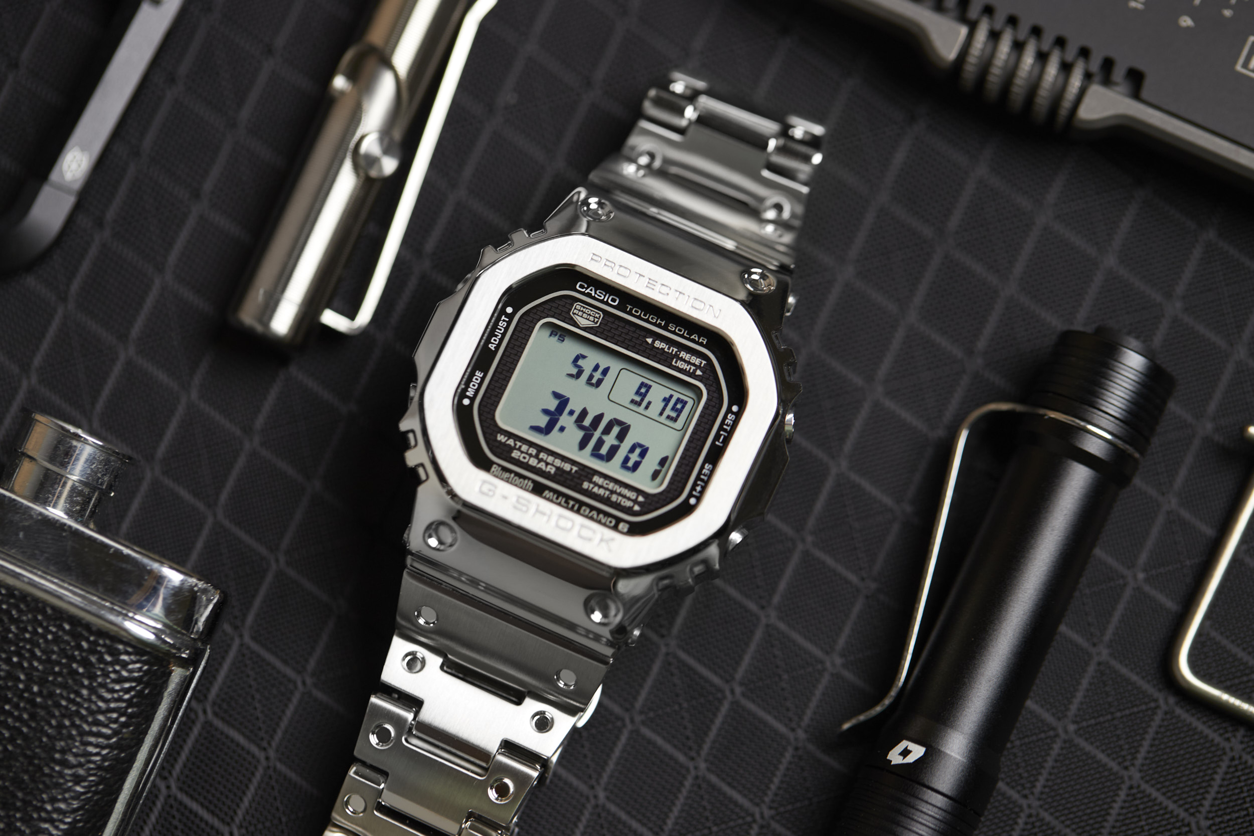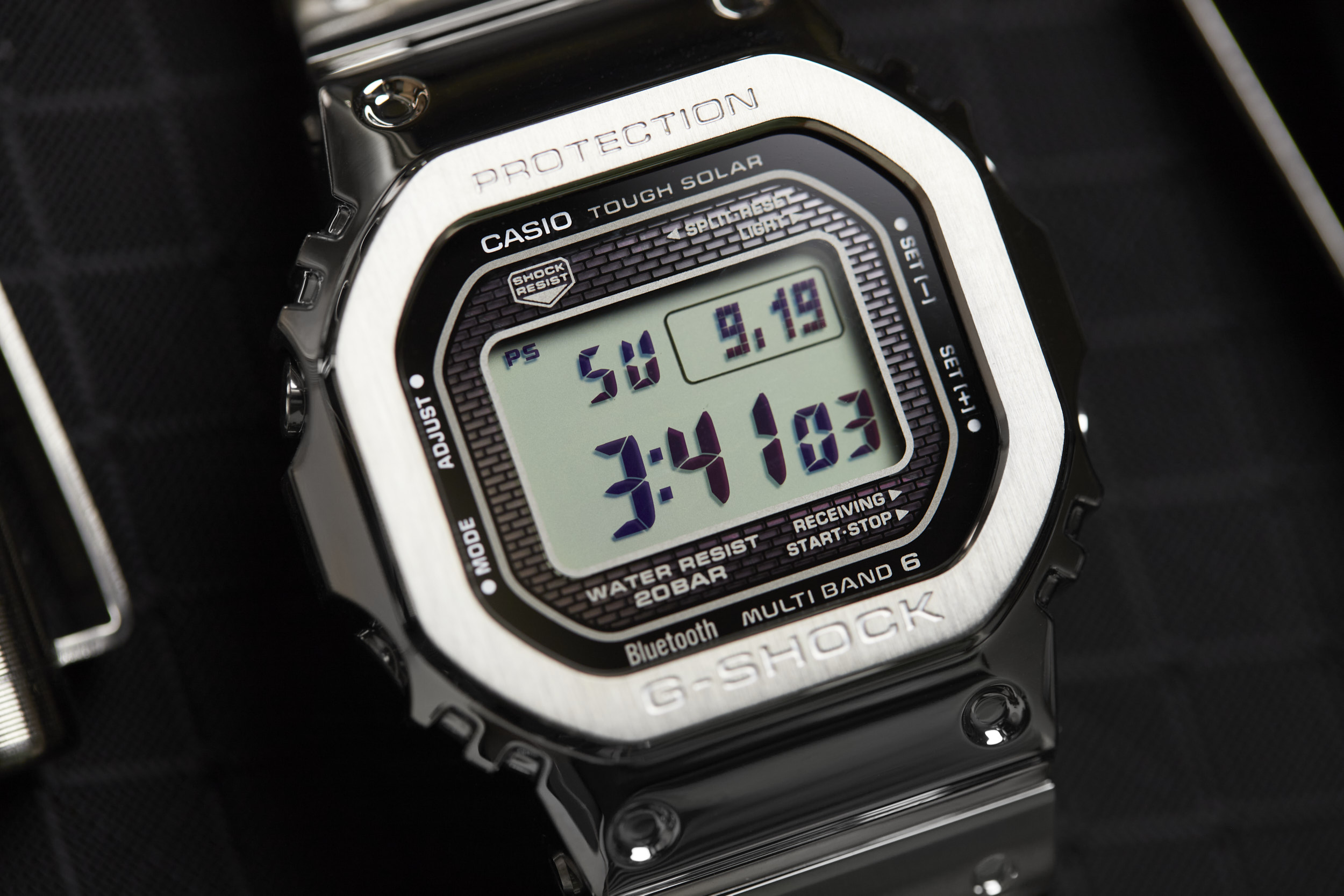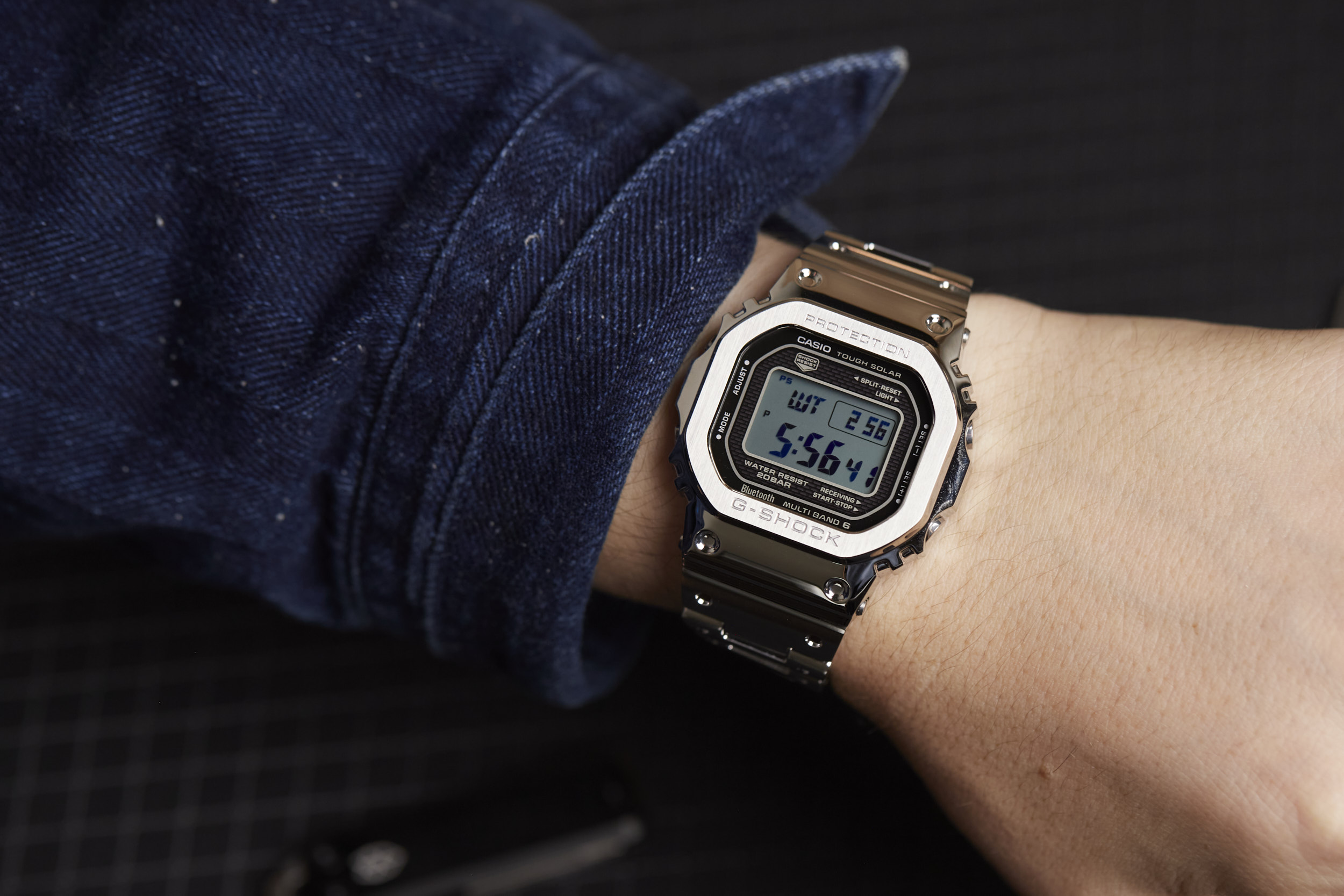 The G-SHOCK GMWB5000 continues the Metal Series line with its bold reimagining of the original square G-design. As you’d expect, the Metal Series features a full metal case with a matching metal bracelet and push-button deployment clasp. Shedding its traditionally resin outer layer does not make this G-SHOCK any less shock resistant. The GMWB5000 also has a 200M water resistance rating, similar to its resin counterparts. Covering the backlit LCD display is mineral glass.