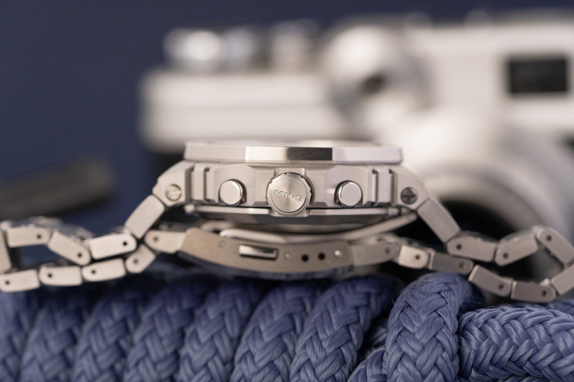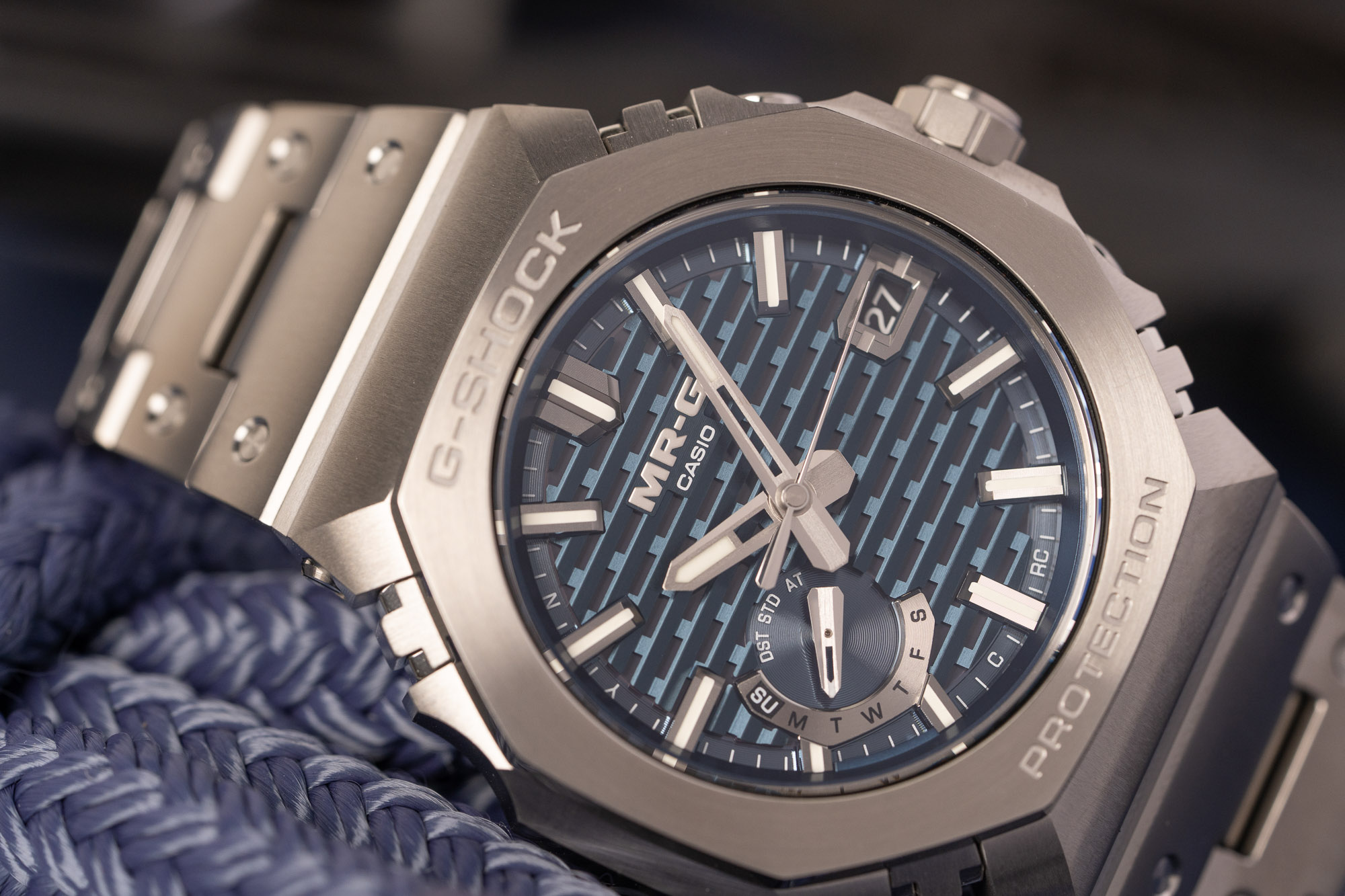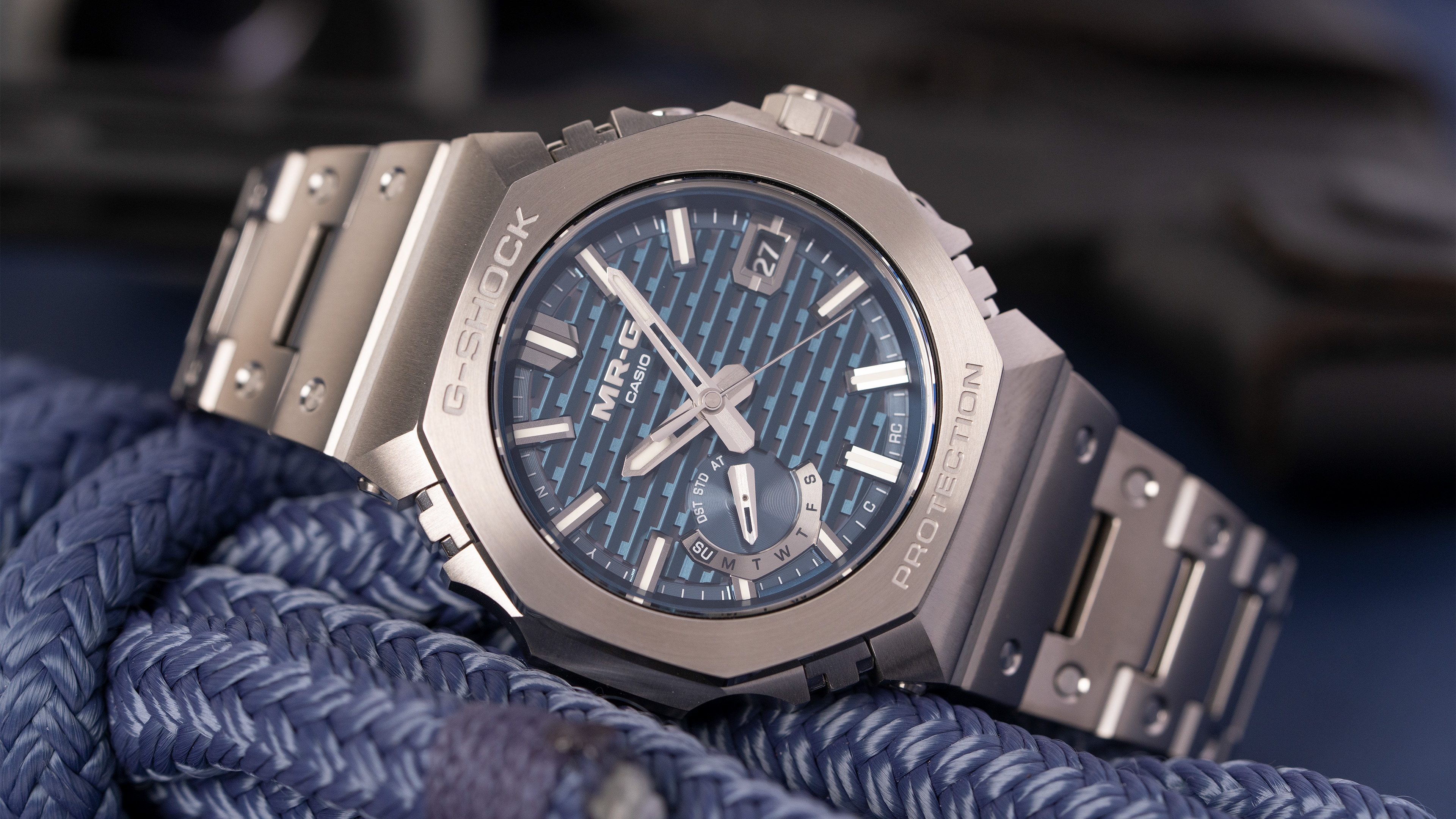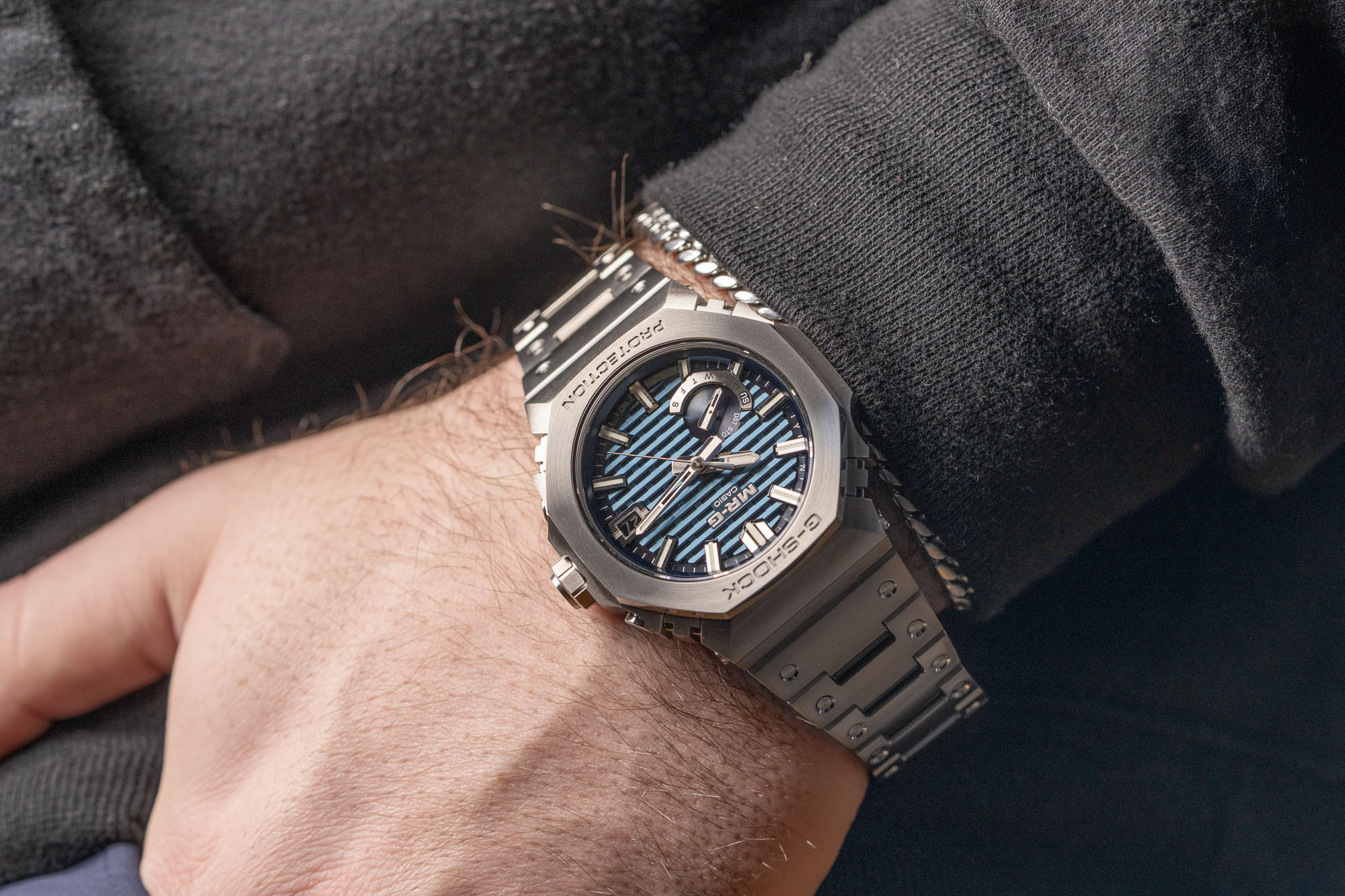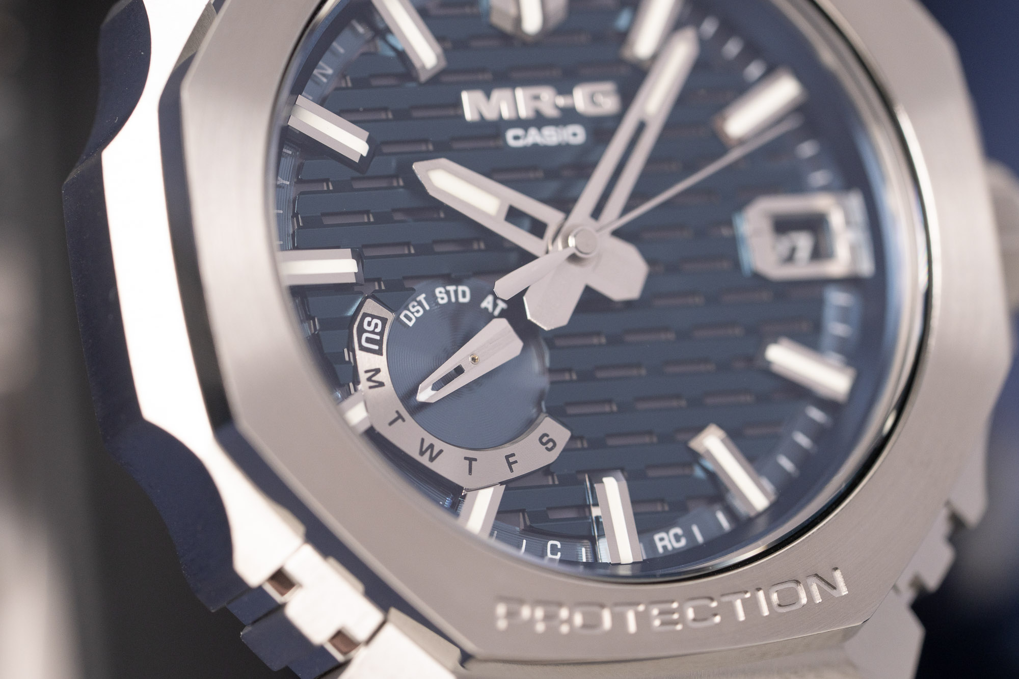 The watch's construction is a masterclass in metal craftsmanship, featuring an intricate 44.4mm case and octagonal bezel comprised of 27 individual components. Every part is meticulously hand-polished to a distortion-free mirror finish before being treated with a titanium carbide (TiC) coating for superior scratch resistance. To ensure the legendary toughness of the MR-G line, the state-of-the-art Multi-Guard Structure incorporates specialized buffers between these components, providing outstanding shock absorption while maintaining a slim, refined profile.