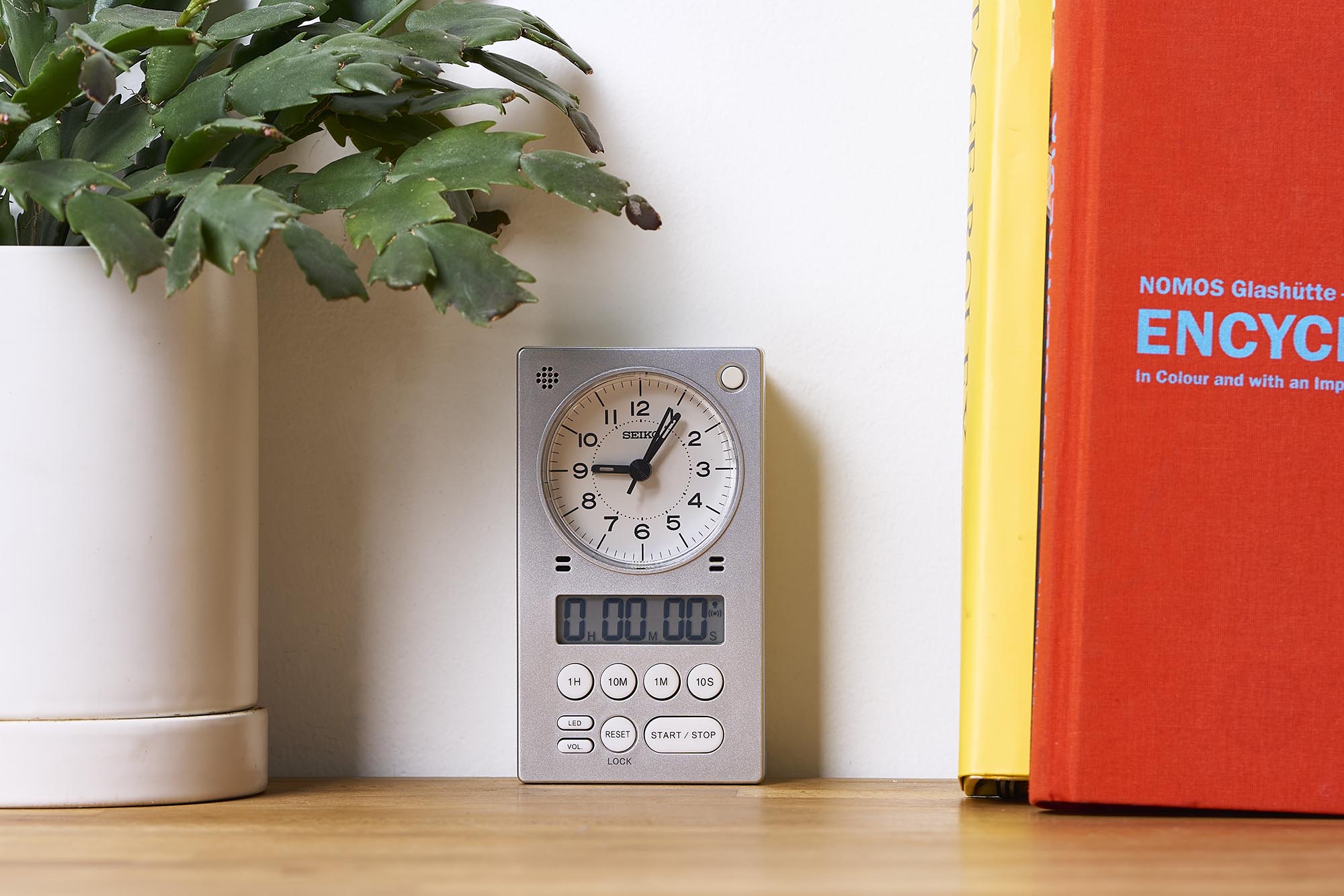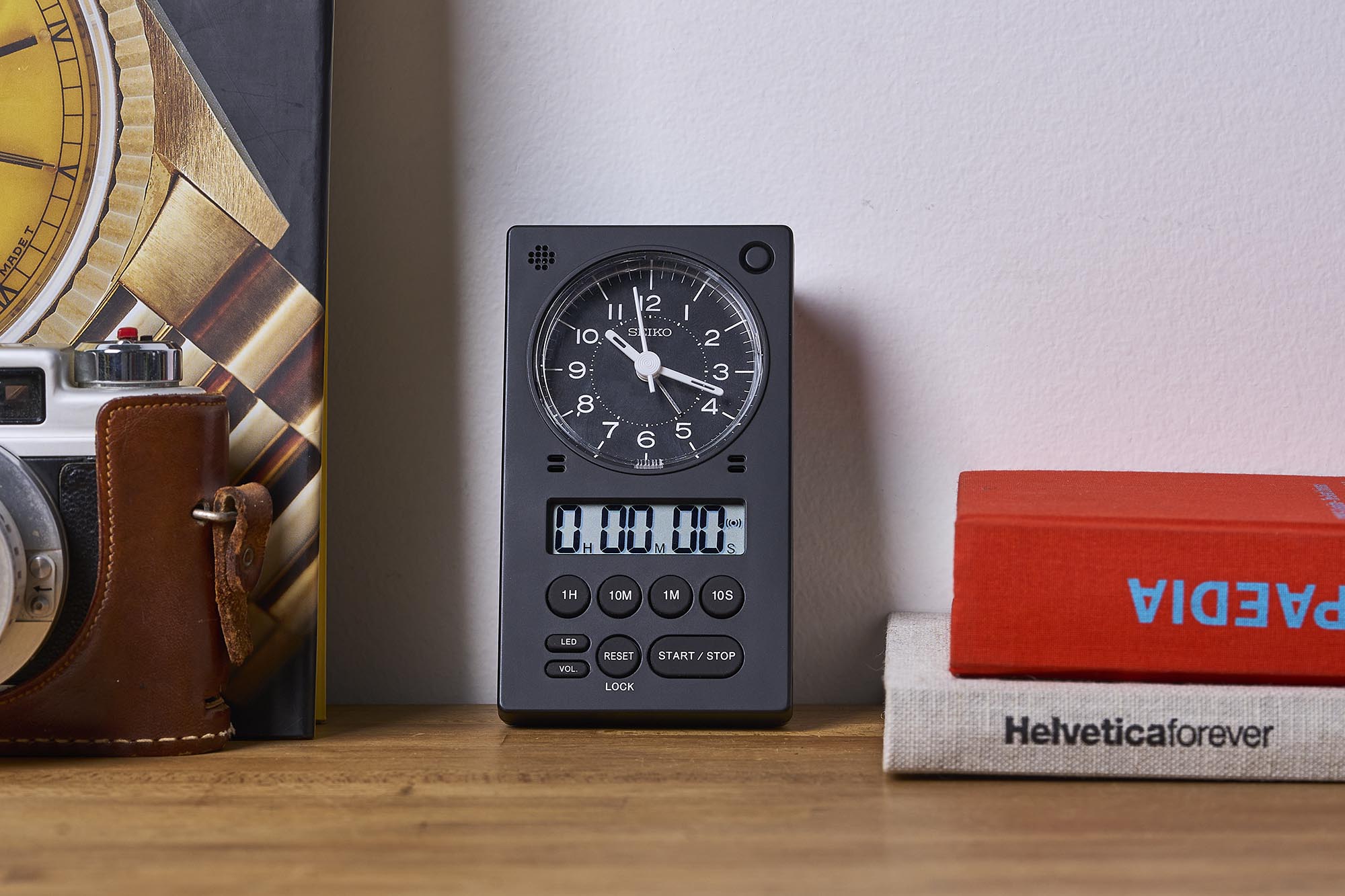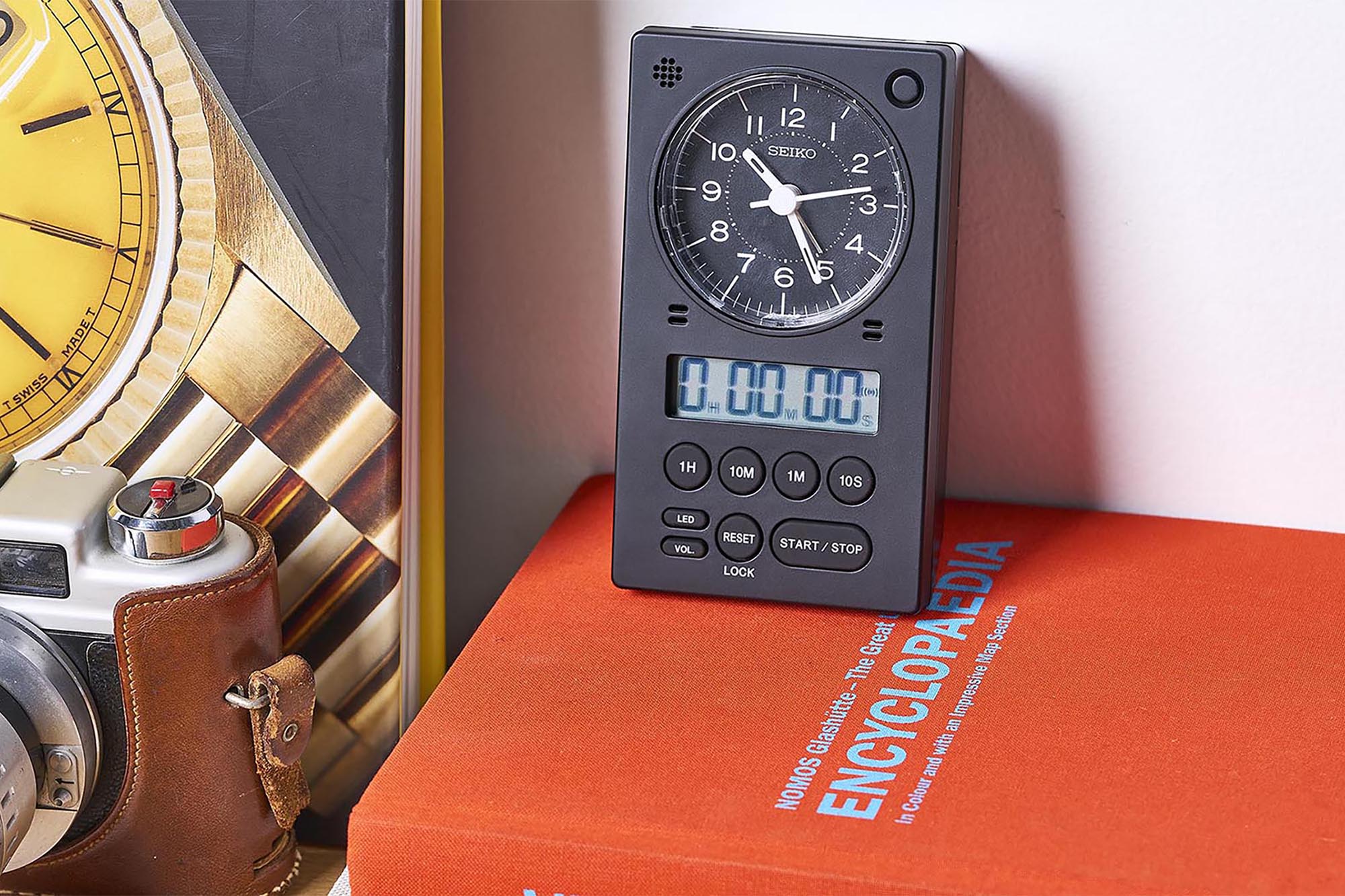 Seiko is known the world over as a watchmaker but has veritable expertise in all things time-telling. Seiko’s clock catalog is wide ranging and includes both analog and digital variations of all sorts of styles. The QHE190 references are clever three-in-one solutions that are ideal in the kitchen or office space.