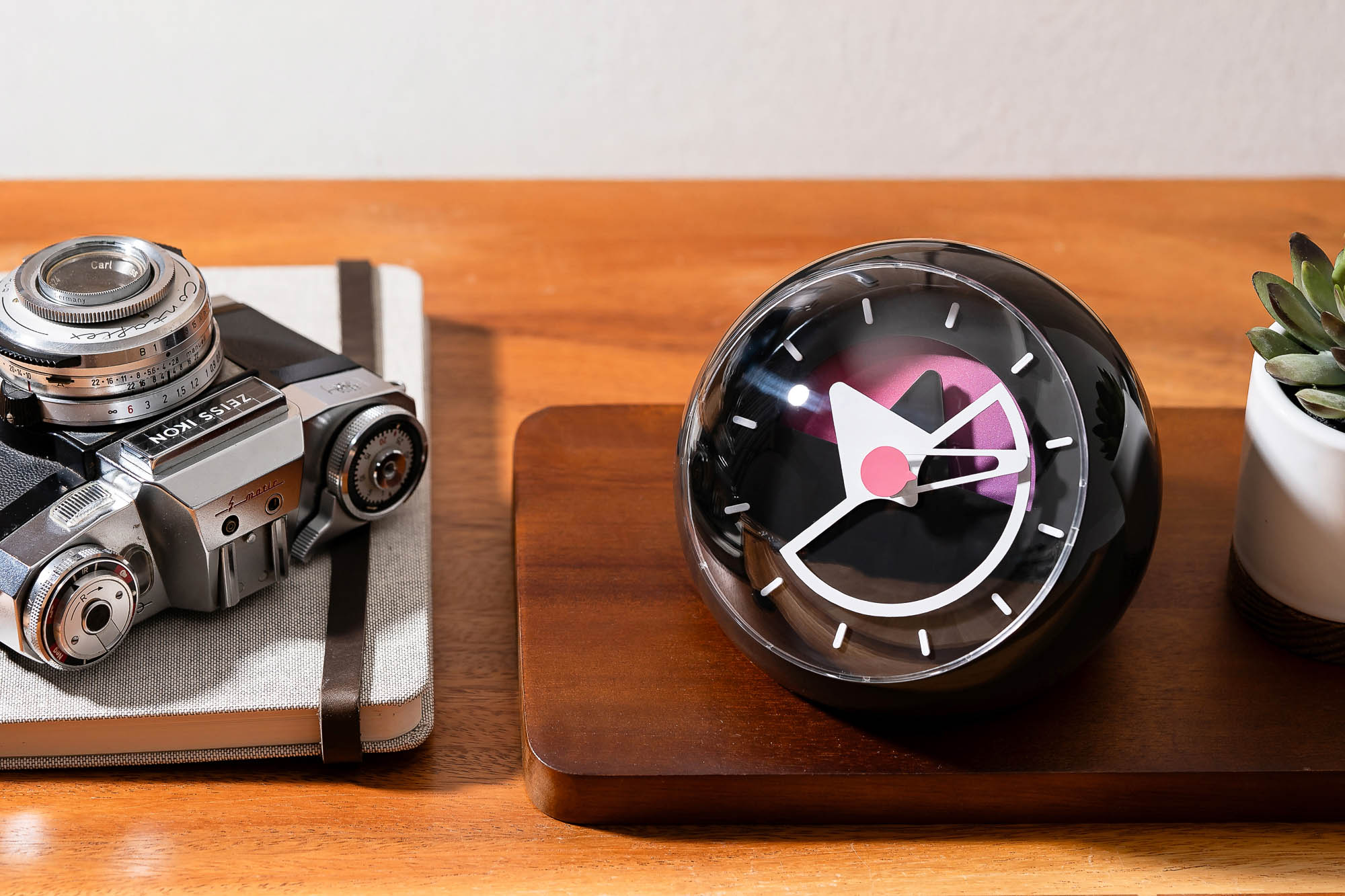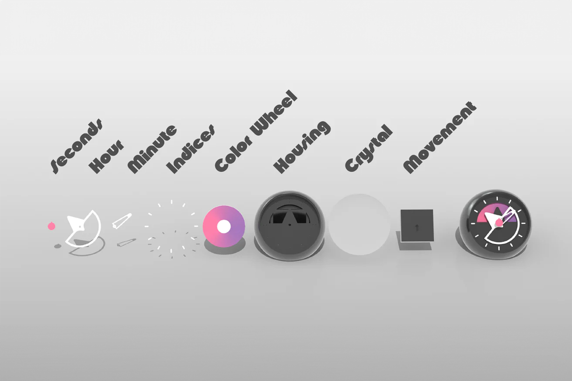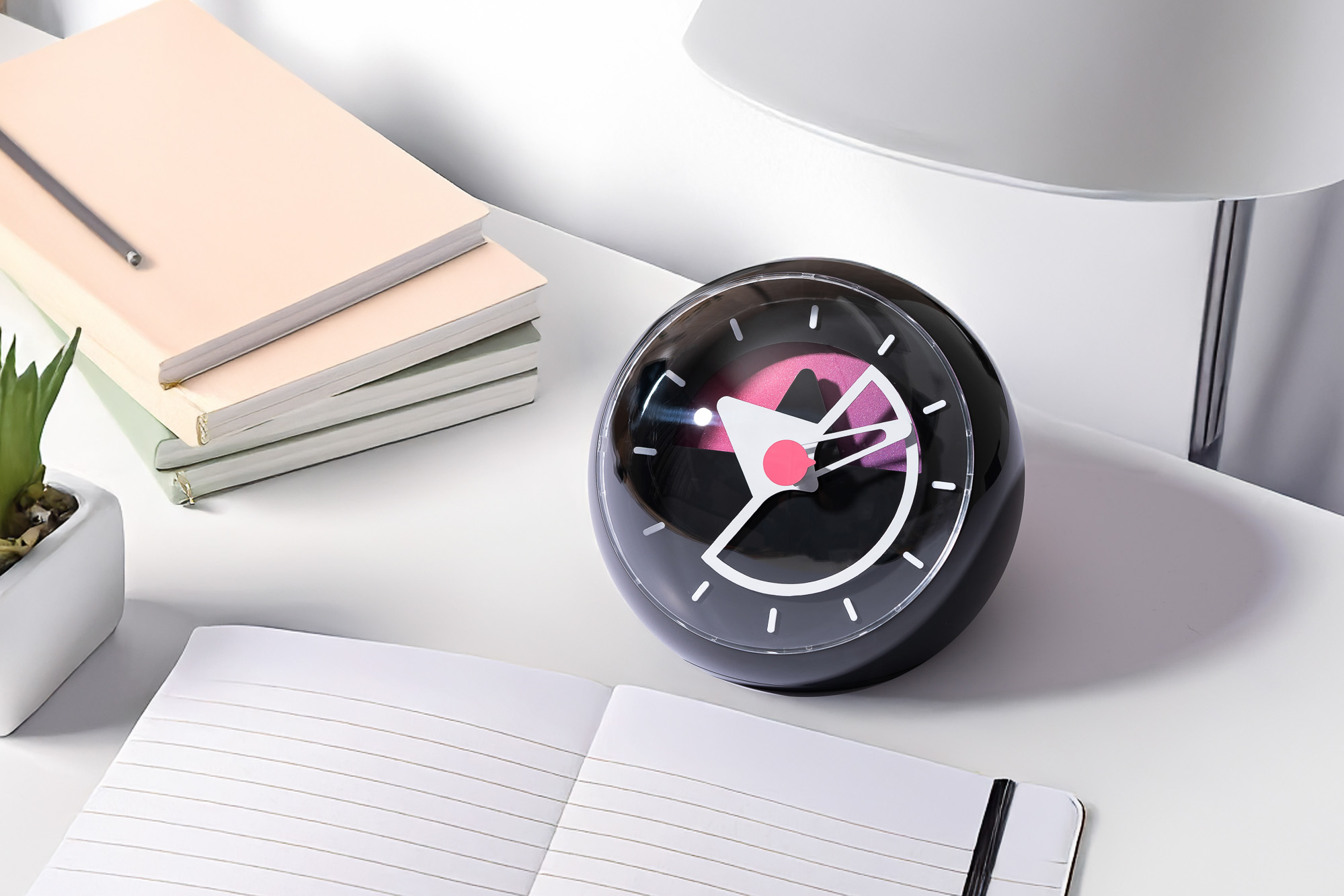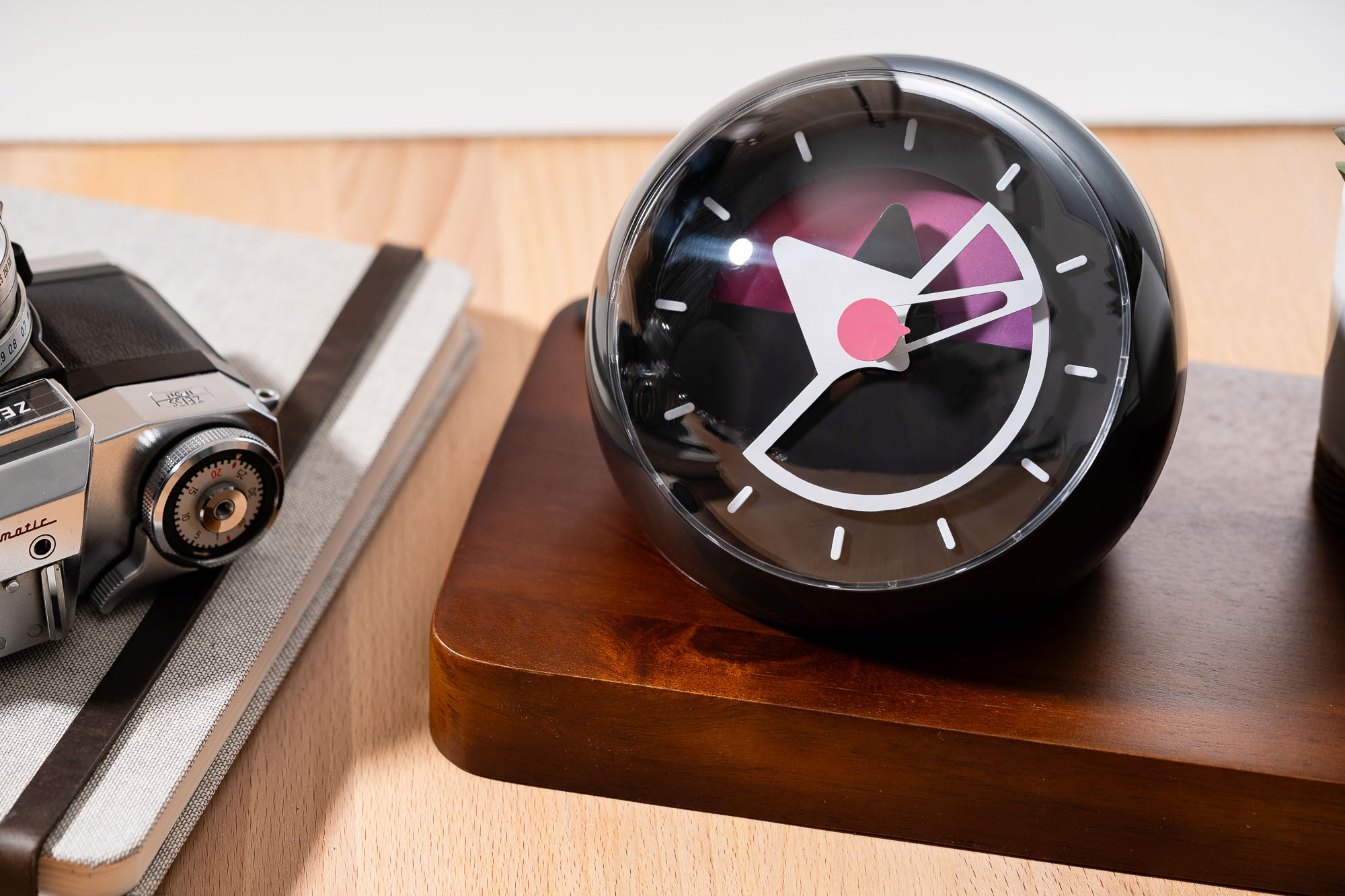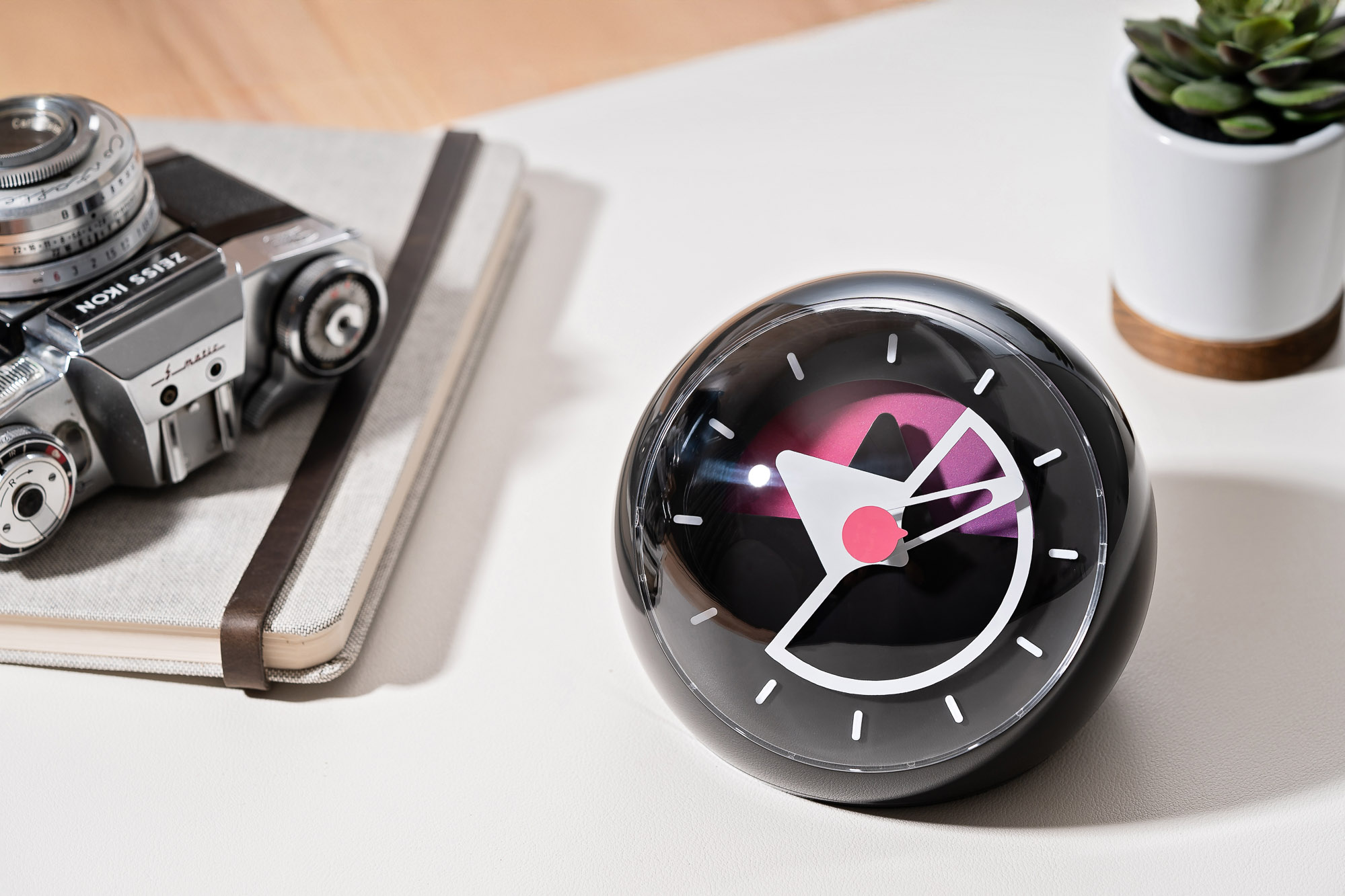 The Layer Three Desk Clock transforms the brand’s signature multi-layer dial design into a stylish desktop companion. Its rounded design offers a unique addition to your work surface. At 100mm x 123mm, it is well-sized for visibility while placing a premium on space. With the pink center representing seconds, the long skeletonized hand representing minutes and the large triangular hand representing hours. Sō Labs has also cleverly added a colorful gradient wheel to the movement’s hour shaft, allowing for an ever-changing appearance across the day.