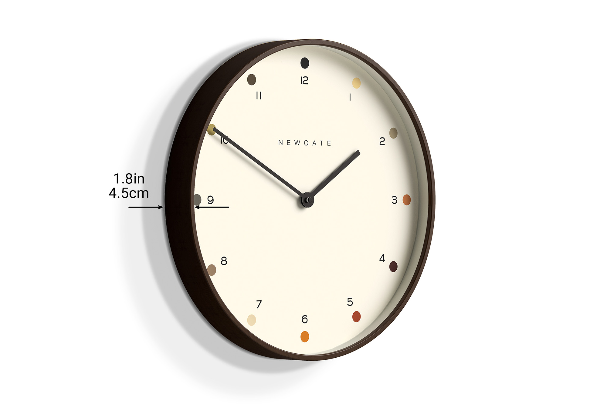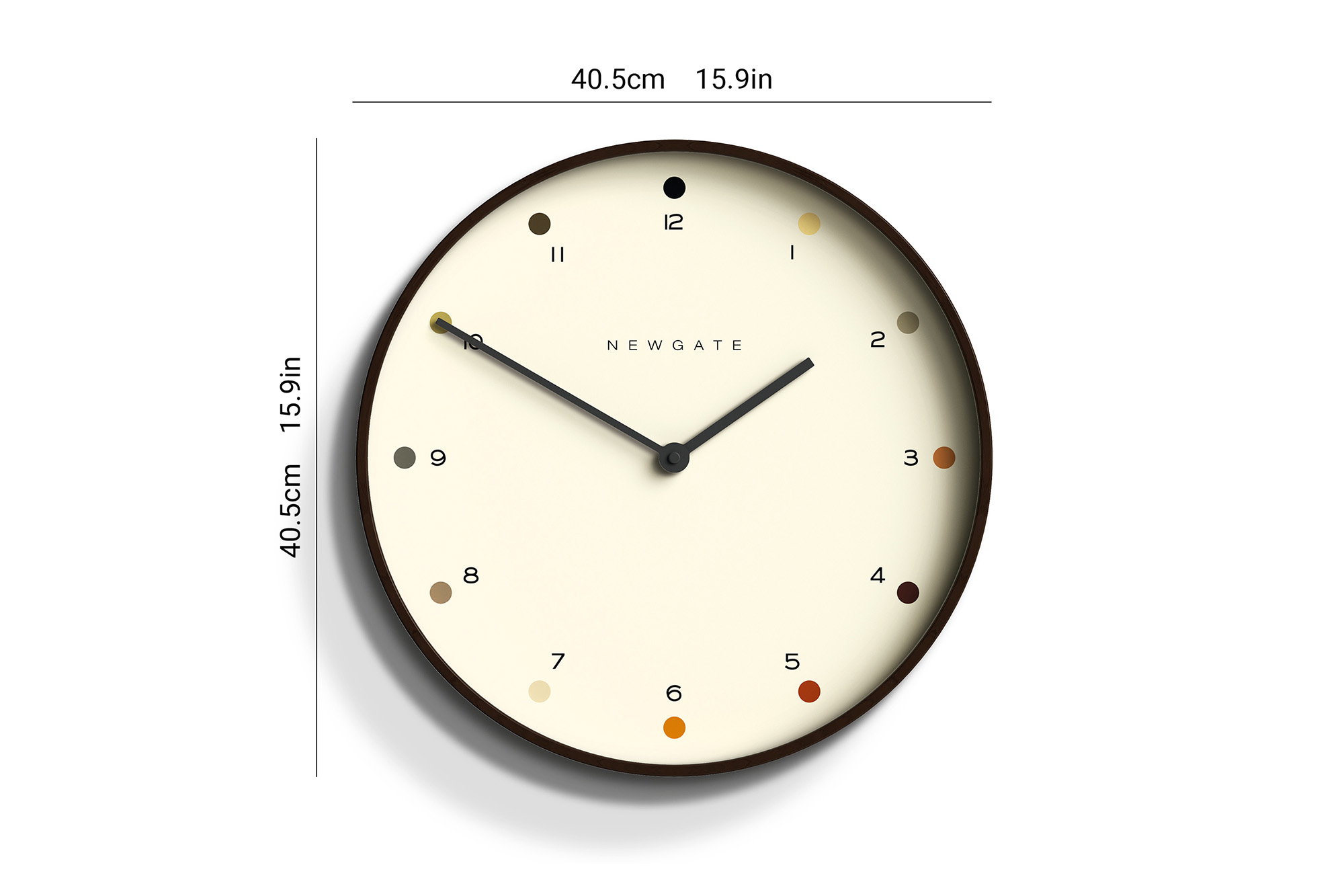 The minimalist dial is accented with colorful dots in place of traditional numerals, paired with sleek black metal hands. Measuring 16 inches in diameter, the clock combines a sturdy plywood case with a protective glass lens. It operates with a reliable quartz silent sweep movement, ensuring no ticking noise, though a very quiet whirring may be heard in a completely silent room if you have particularly sensitive hearing. The dark plywood finish enhances its modern aesthetic, making it a versatile addition to various decor styles.