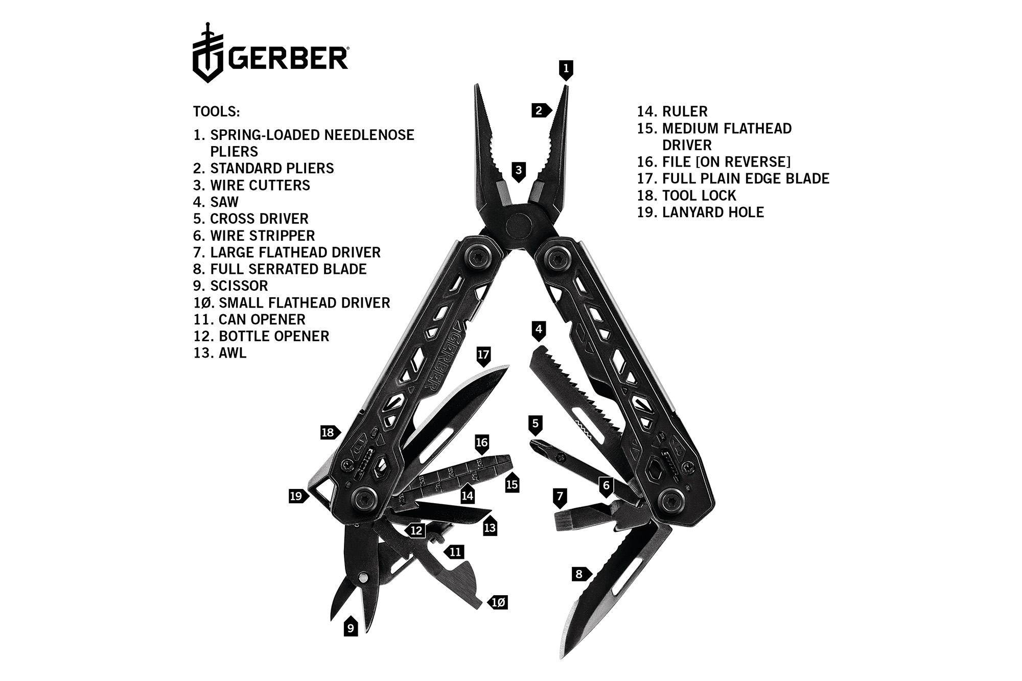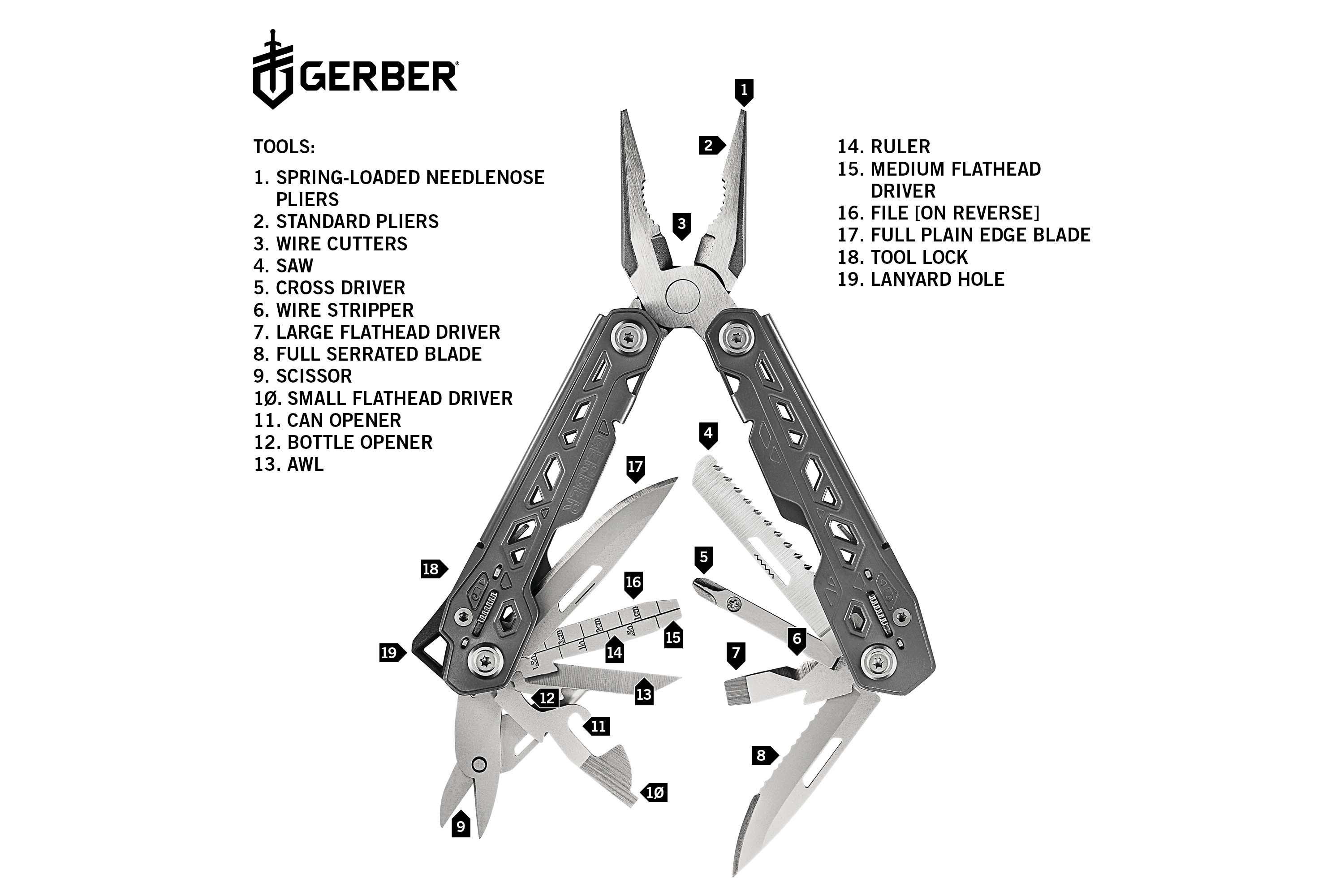 • Features:Needle nose plier, regular plier, wire cutter, 2.25” Fine blade, 2.25” Serrated blade, scissors, saw, real cross driver, small medium large flathead driver, can opener, bottle opener, awl, file, ruler and wire stripper