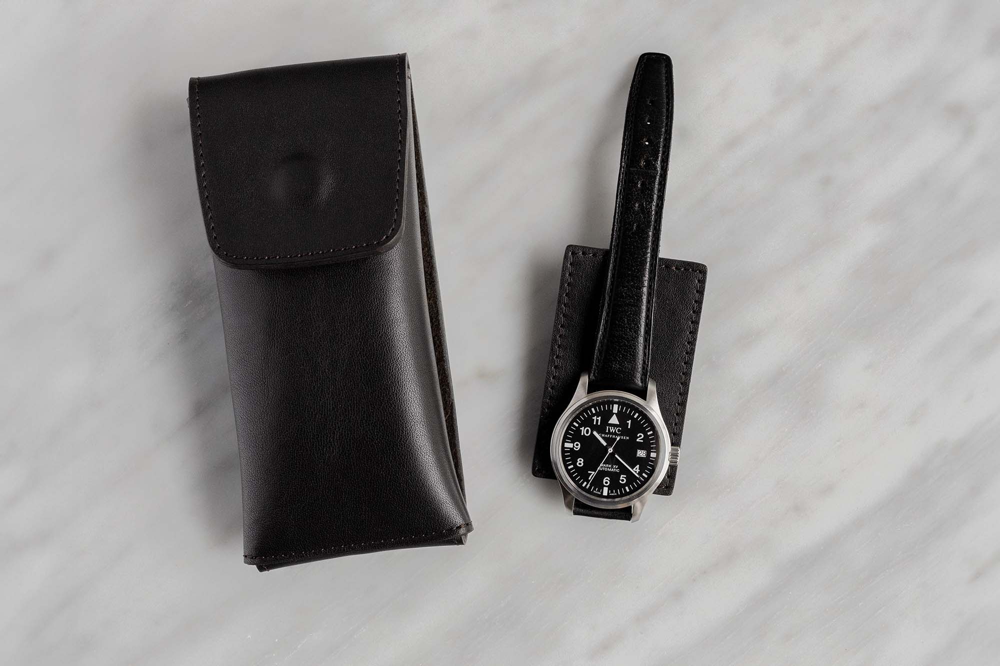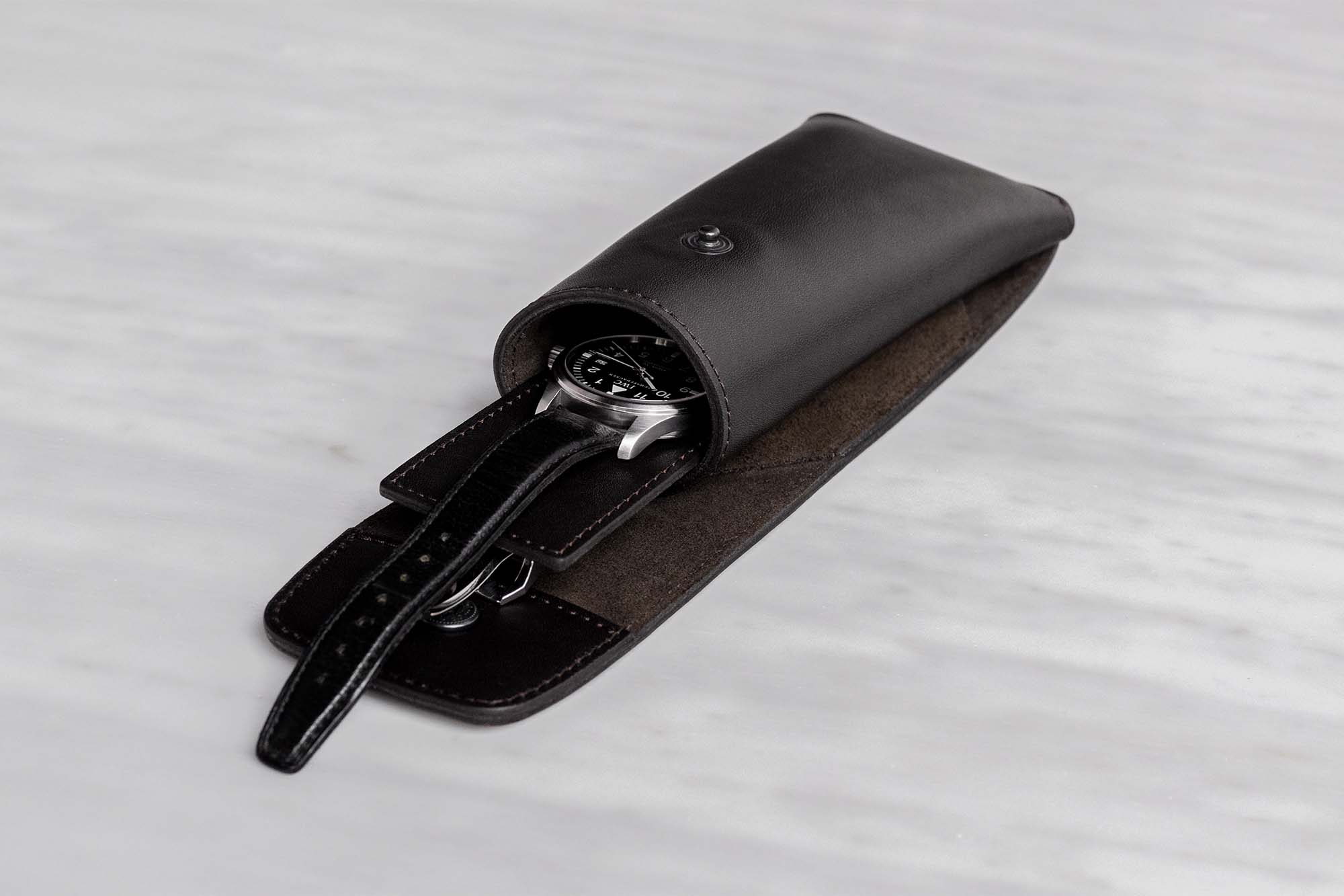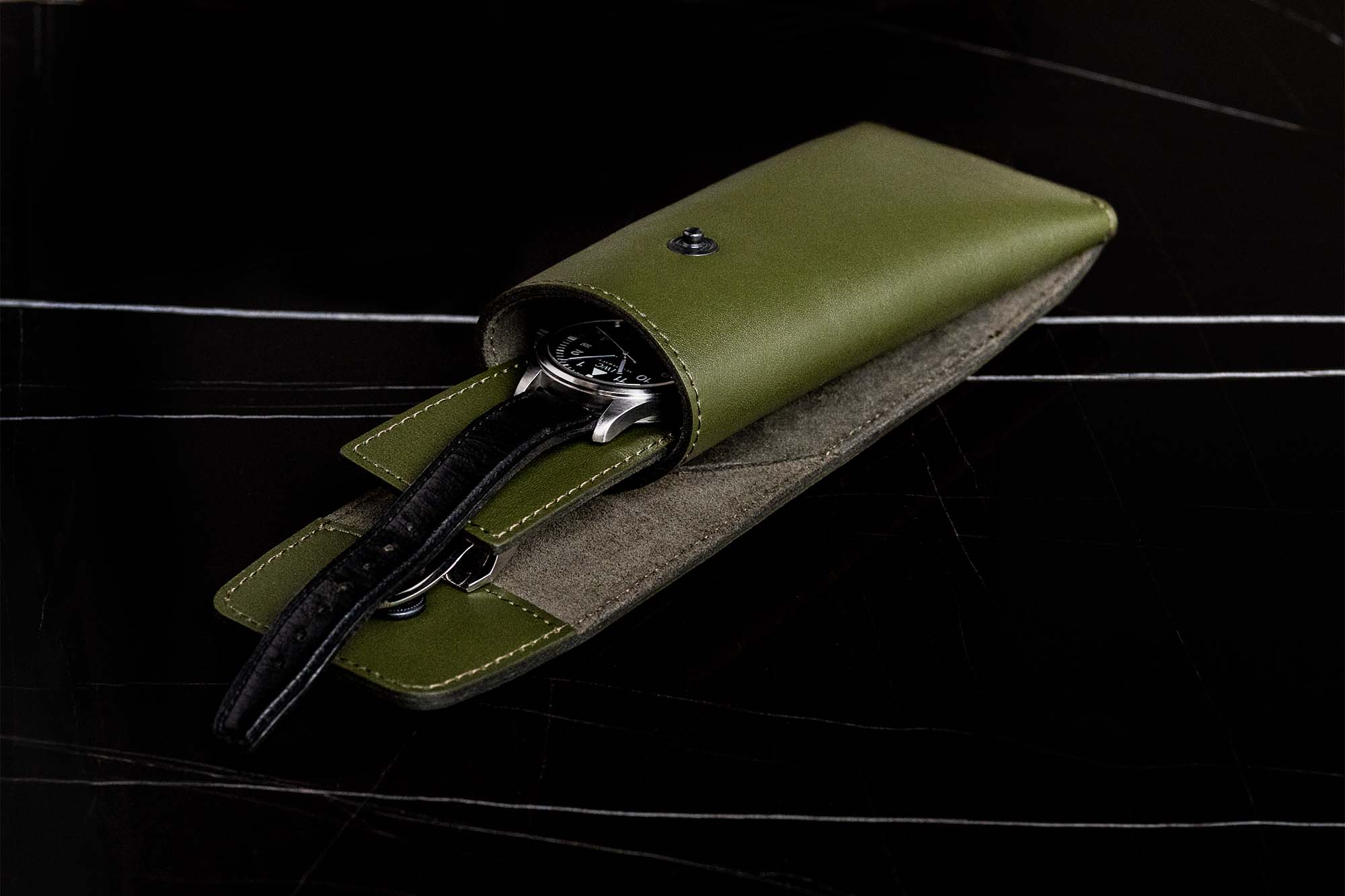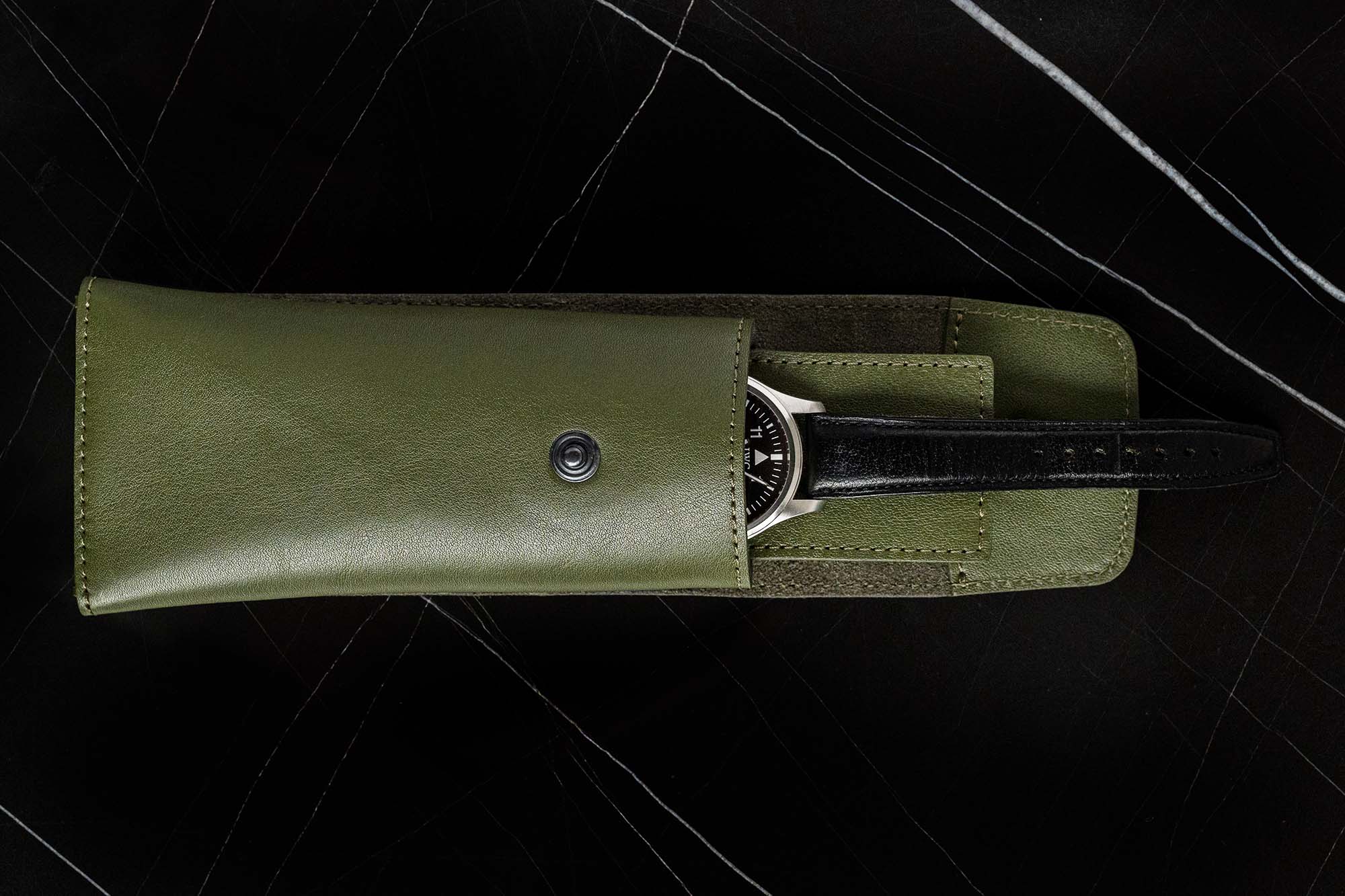The watch pouch is designed to hold one timepiece. The pouch features a single pocket made of Italian full-grain Nappa leather lined with Italian waterproof suede. An extra layer of backing extends to the snap closure and is X-stitched together with German Ritza thread. A leather watch rest lined with suede protects the caseback of your watch.