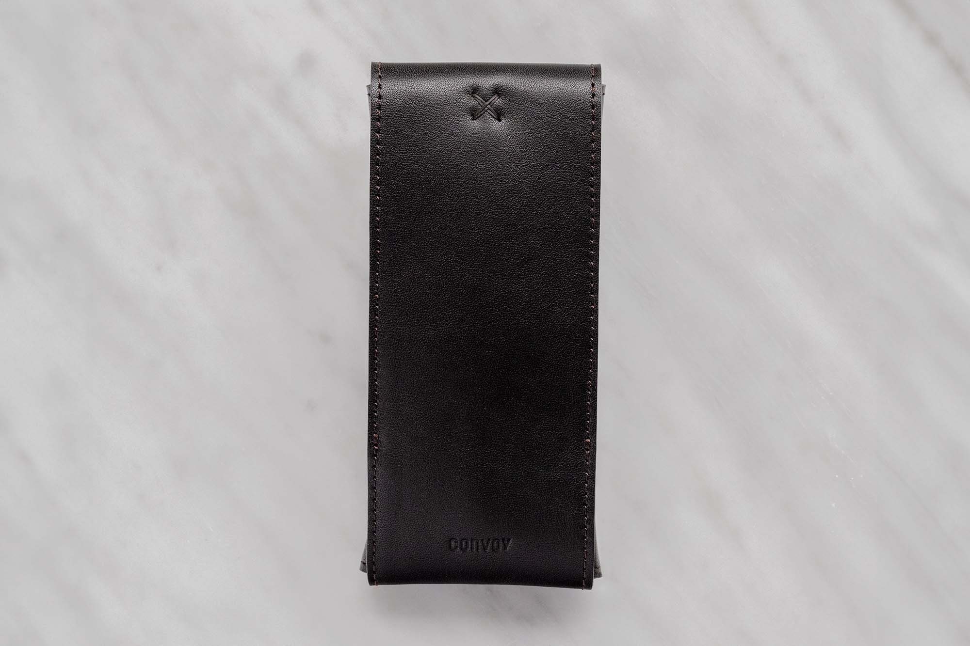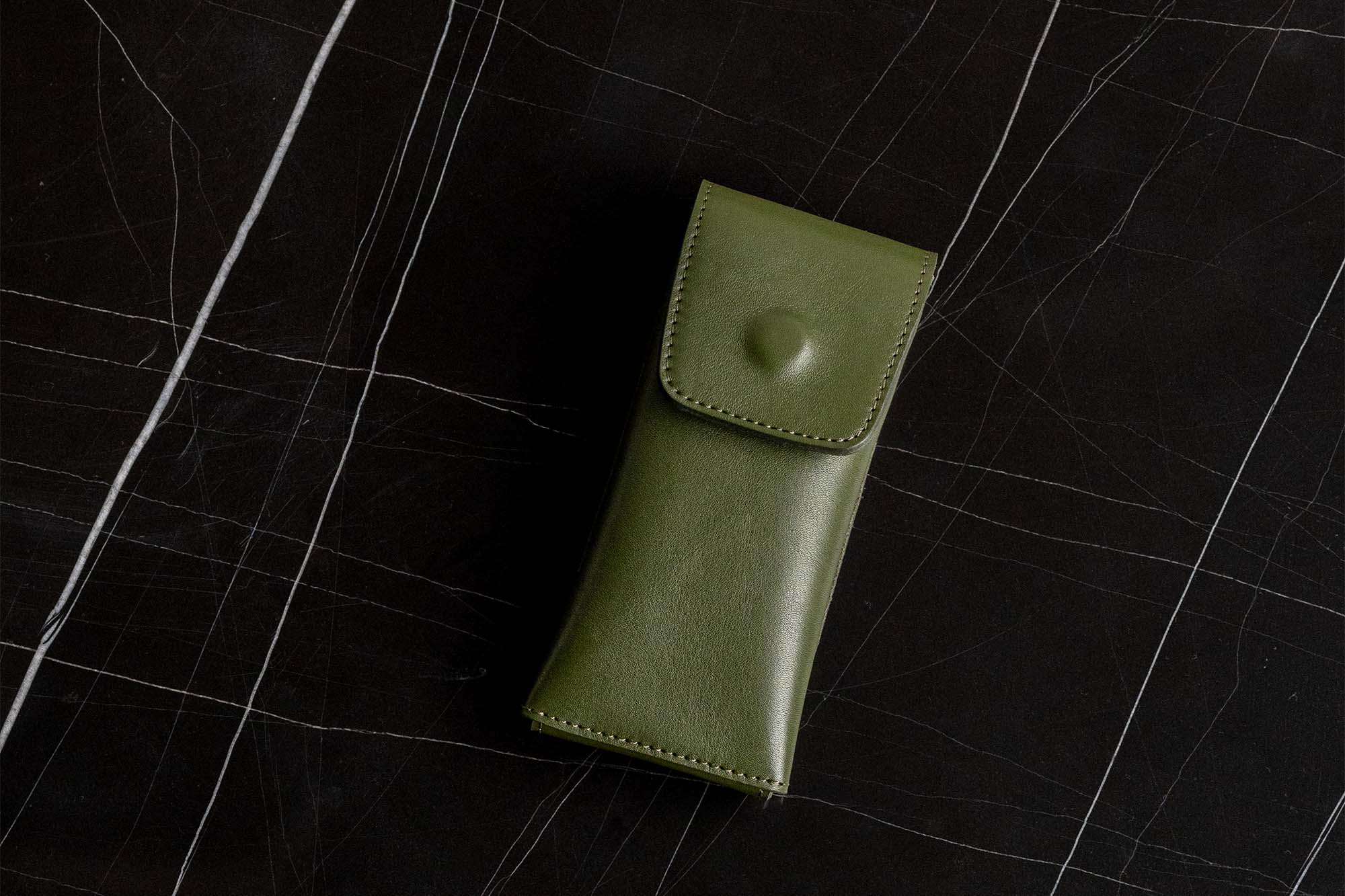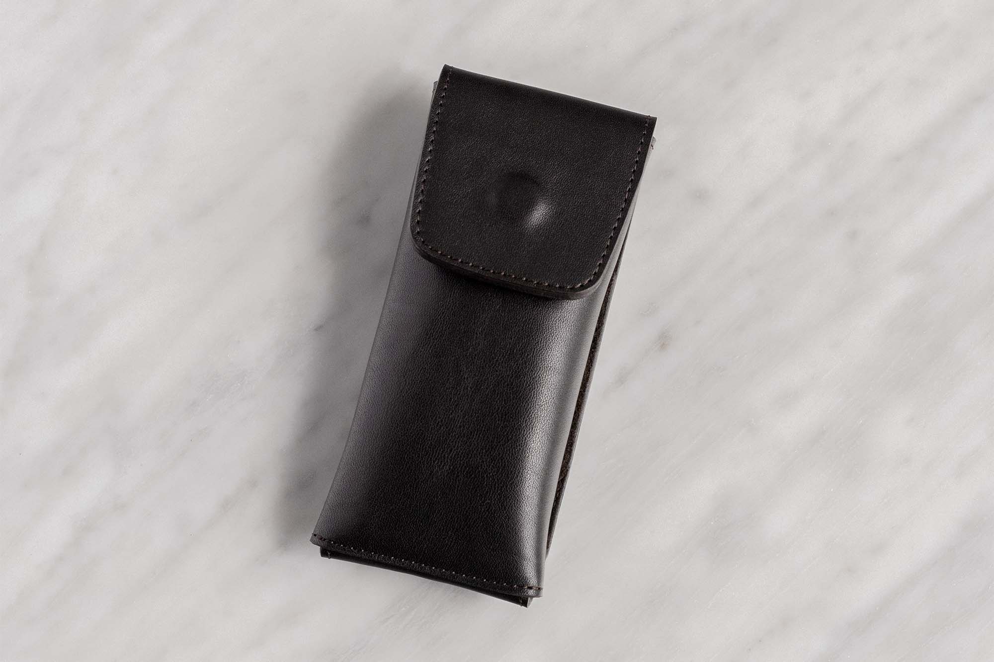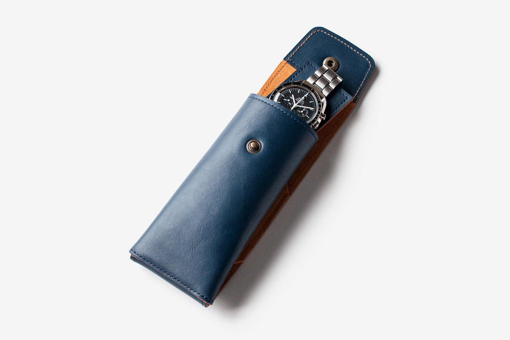 The watch pouch is designed to hold one timepiece. The pouch features a single pocket made of Italian full-grain Nappa leather lined with Italian waterproof suede. An extra layer of backing extends to the snap closure and is X-stitched together with German Ritza thread. A leather watch rest lined with suede protects the caseback of your watch.