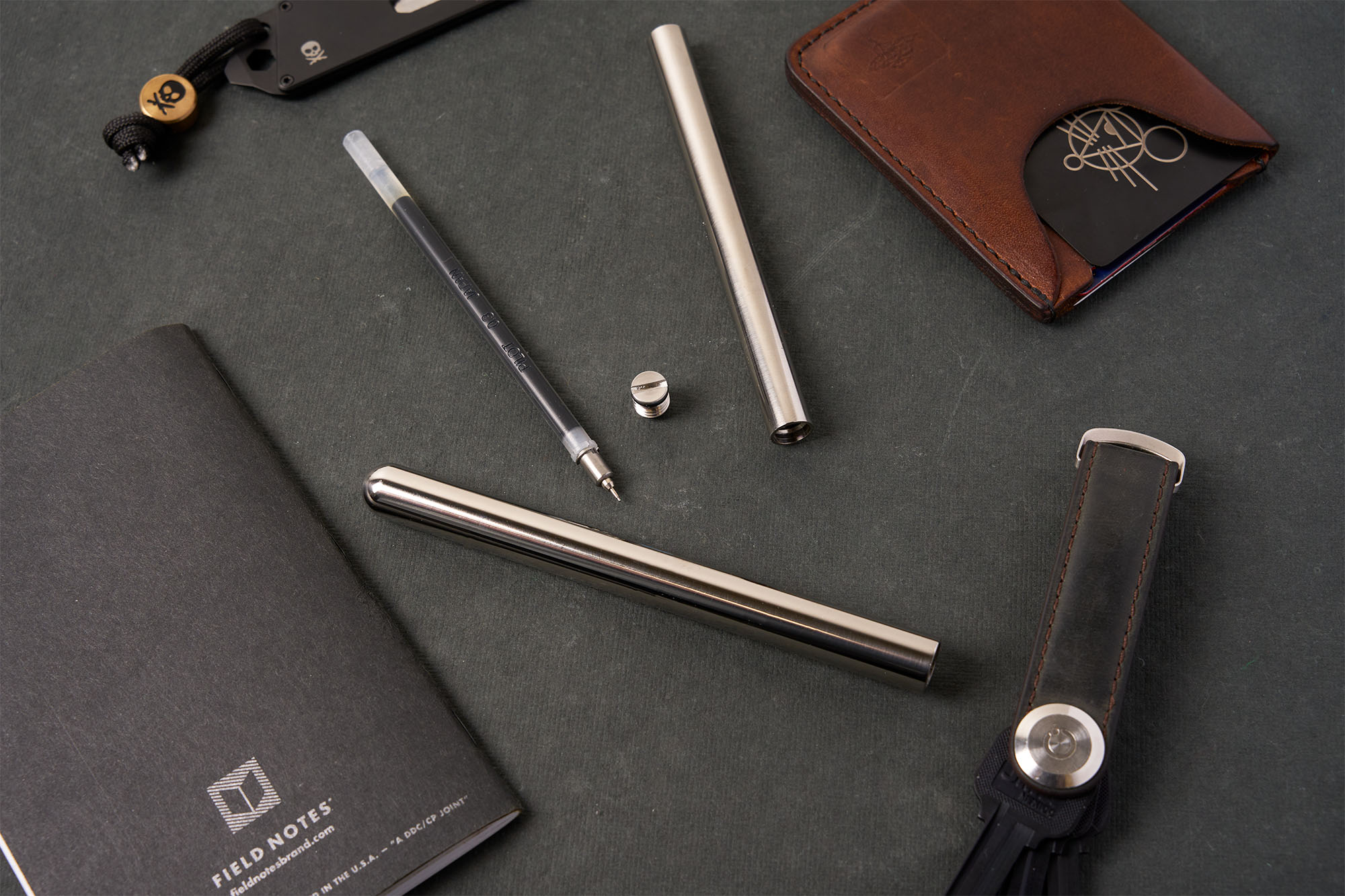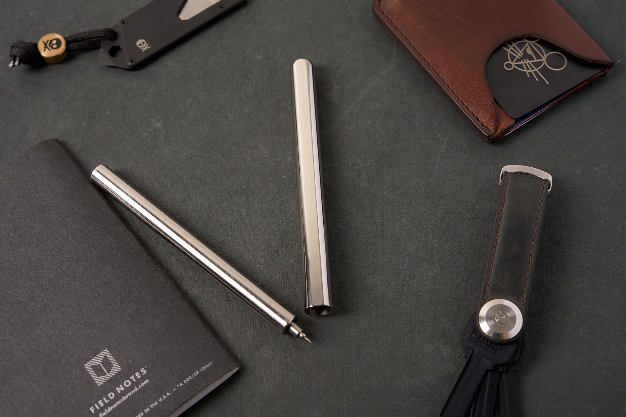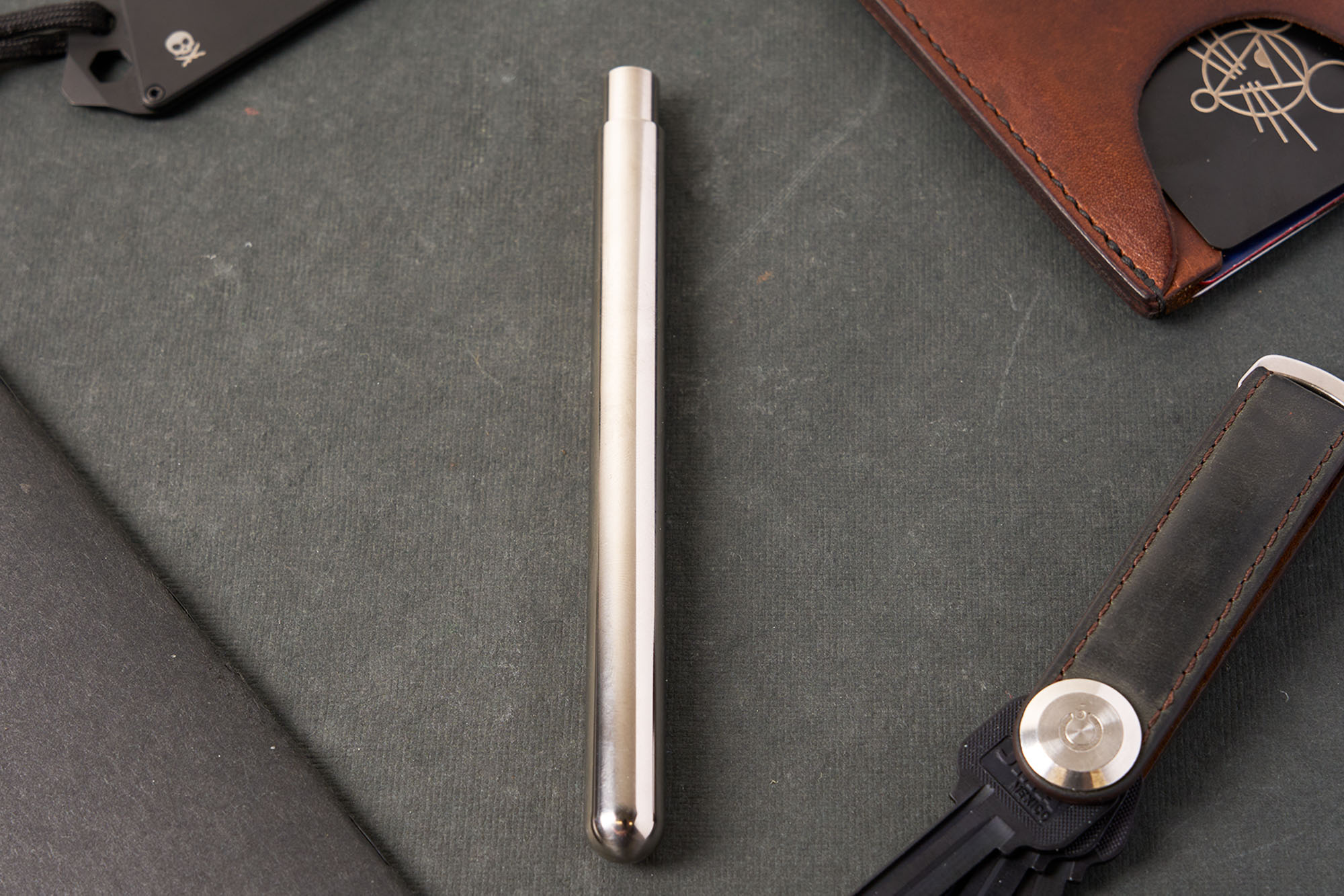 The CW&T Pen Type-B exemplifies the notion that achieving simplicity isn’t as simple as it seems. Though a minimal, clean, two-piece design consisting of a sleeve and a pen, both expertly machined in the USA from grade 5 titanium, Type-B succeeds because of its precision craftsmanship and hidden details. First, the cylindrical sleeve features a flat side preventing it from rolling away: clever. Next, inside the sleeve is an N52 neodymium magnet to secure the pen body, as well as a rubber tip protector: smart. The cylindrical pen body has a stepped tip for visibility and a hidden logo on the back of the screw that holds in the ink cartridge.