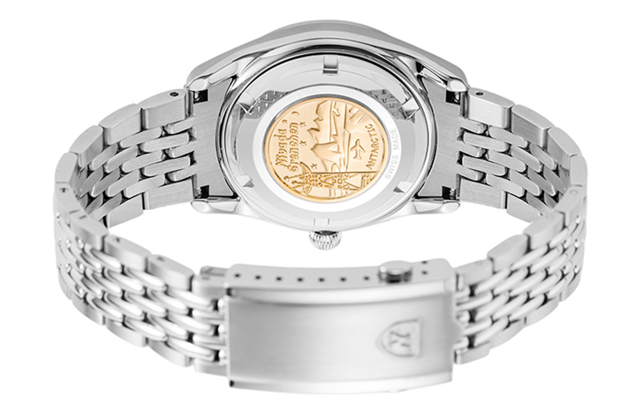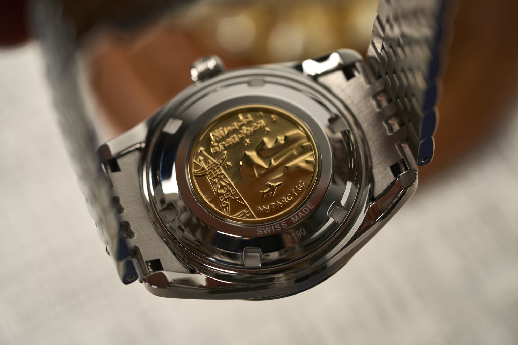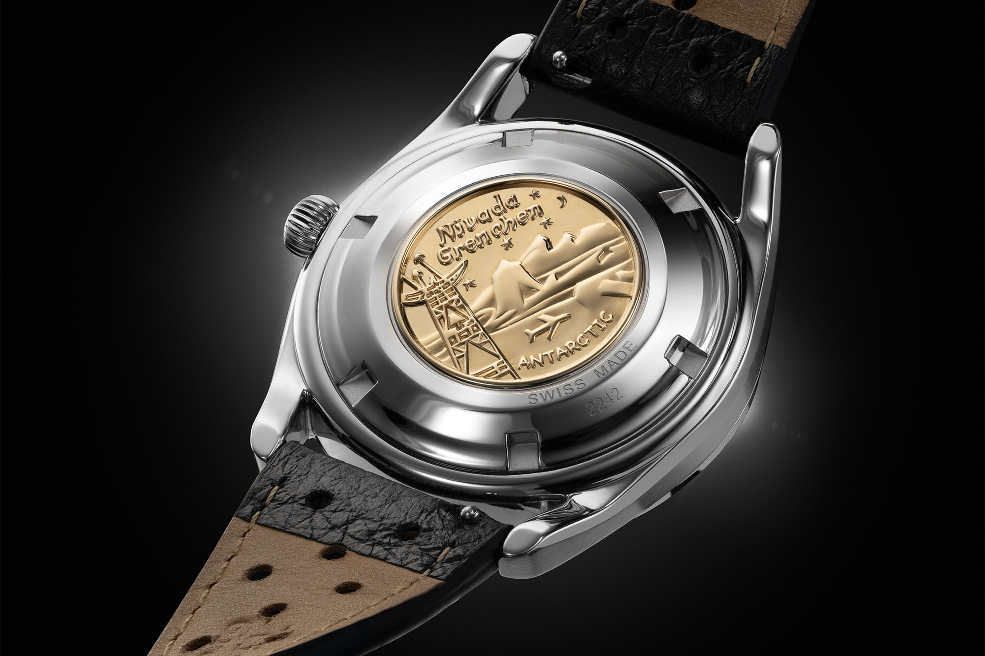 Inside the Super Antarctic is the self-winding SOPROD P024, which is based on the ETA-2824. It has 25 jewels, as marked on the dial, beats at 4Hz (28,800 vph), and offers hacking seconds. It can also be hand-wound. The screw-in caseback is decorated with a gold medallion depicting an aircraft during Operation Deep Freeze I.
