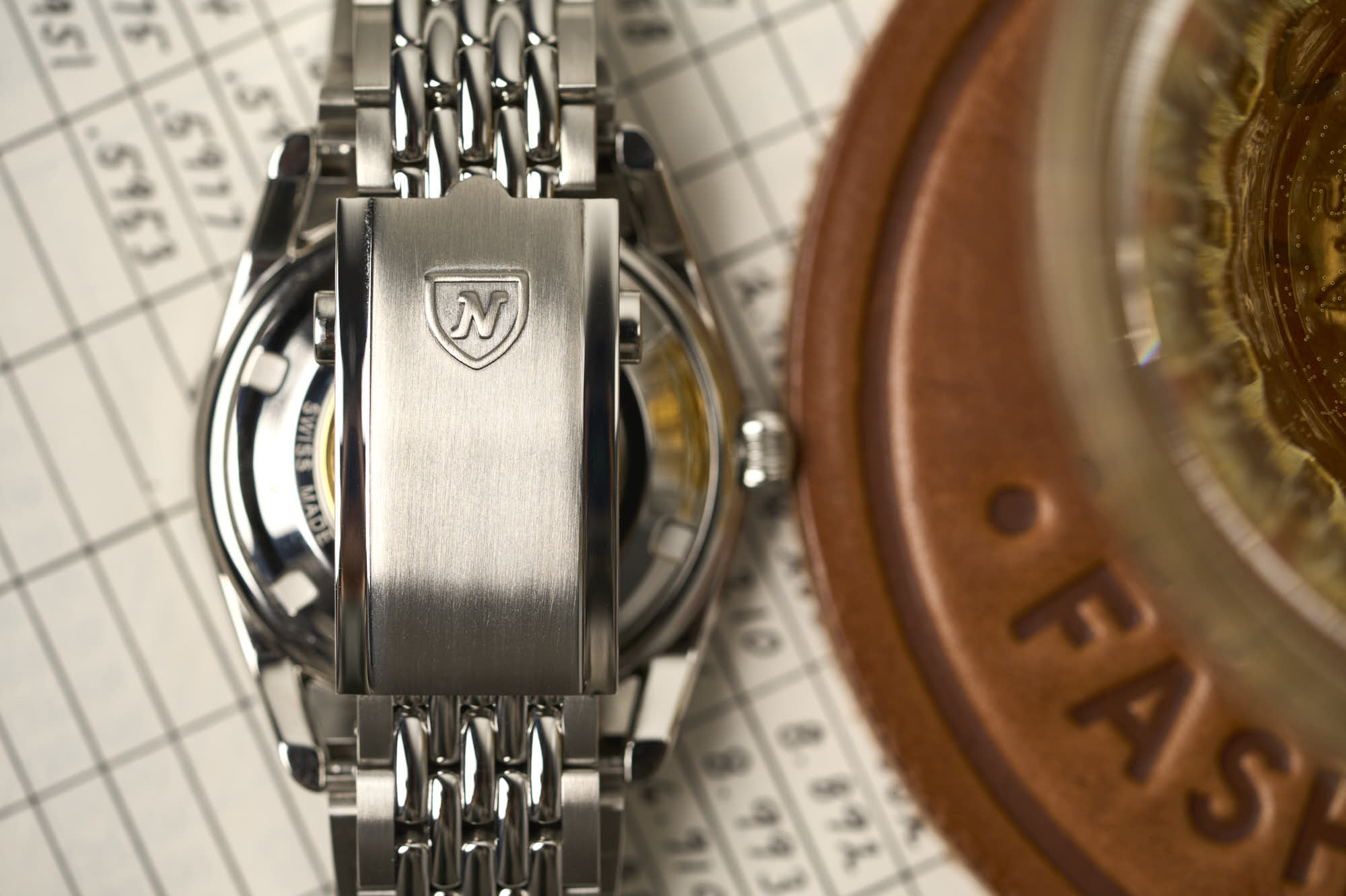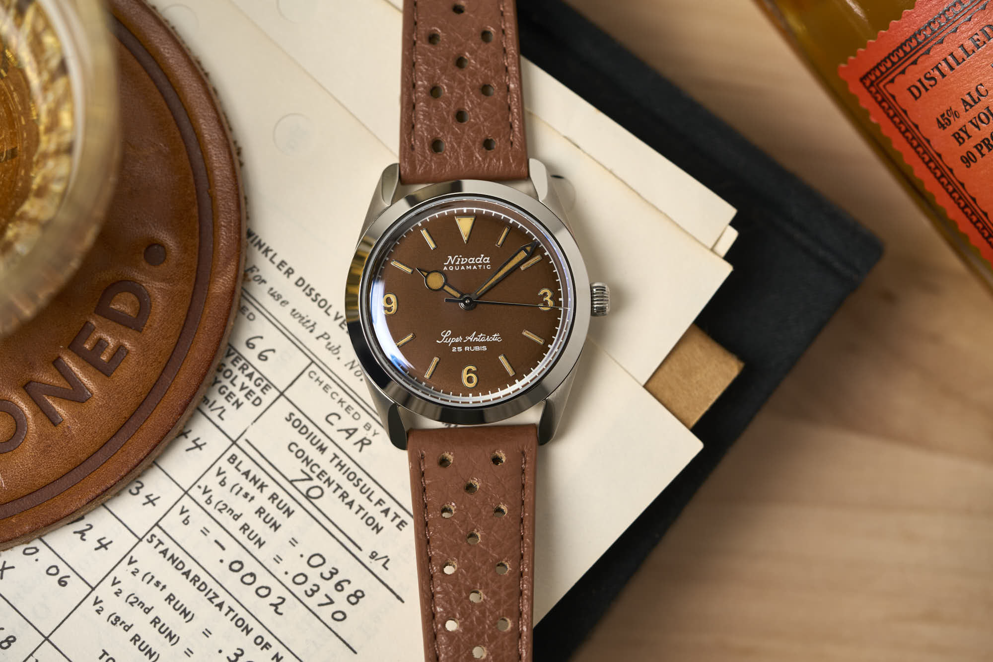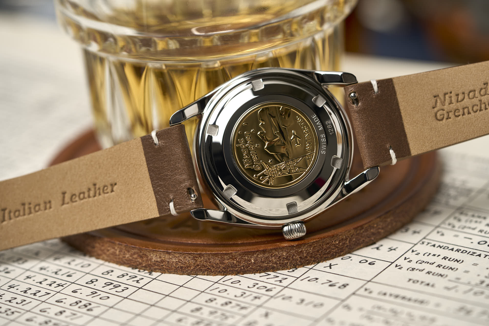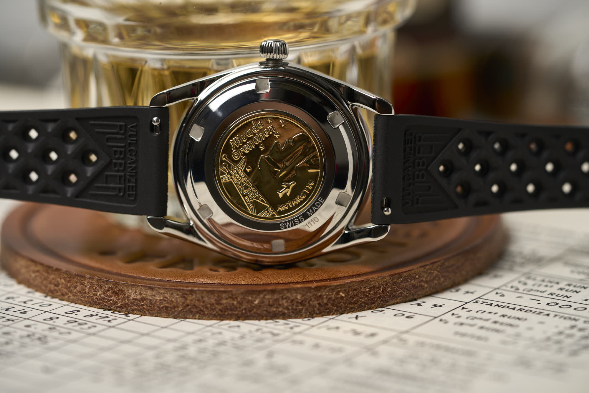 Inside the Super Antarctic is the self-winding SOPROD P024, which is based on the ETA-2824. It has 25 jewels, as marked on the dial, beats at 4Hz (28,800 vph), and offers hacking seconds. It can also be hand-wound. The screw-in caseback is decorated with a gold medallion depicting an aircraft during Operation Deep Freeze I.