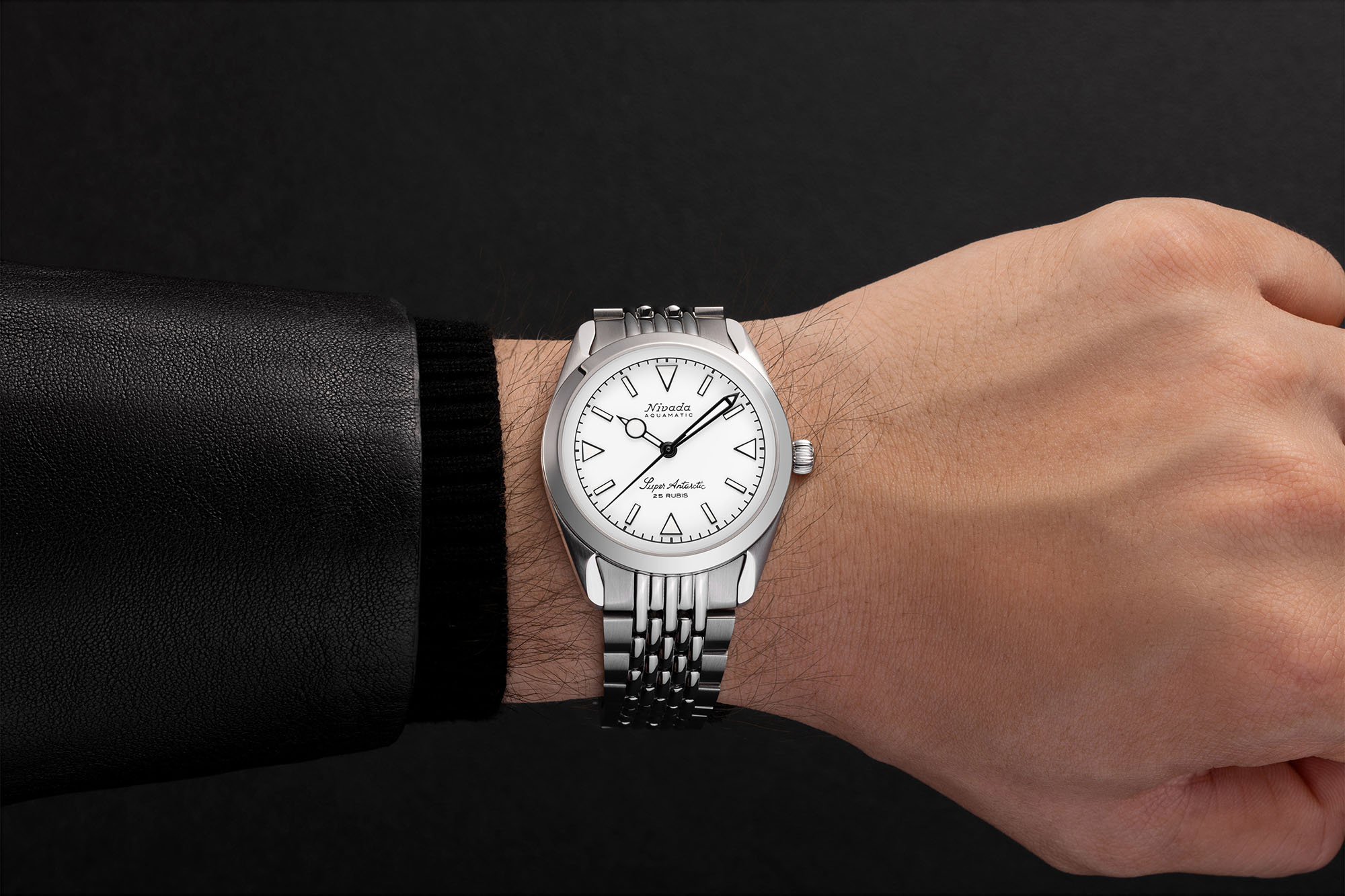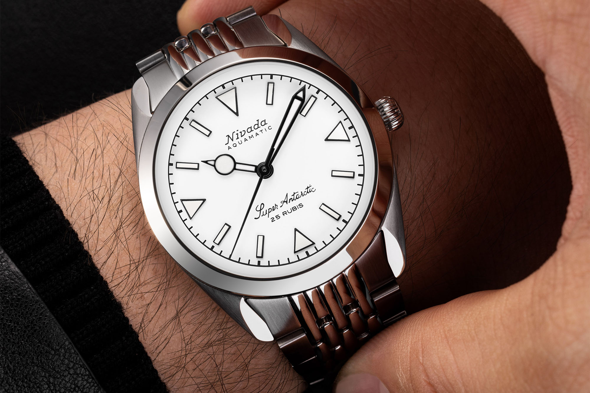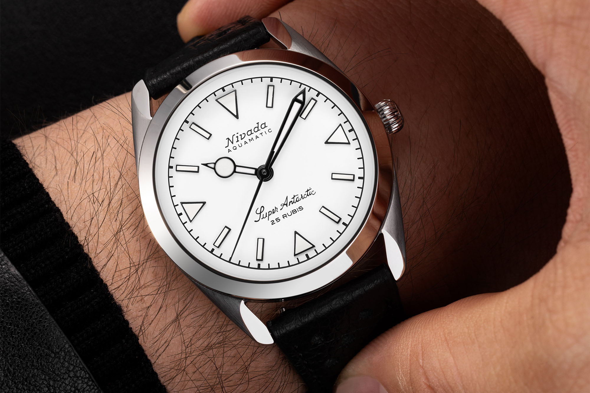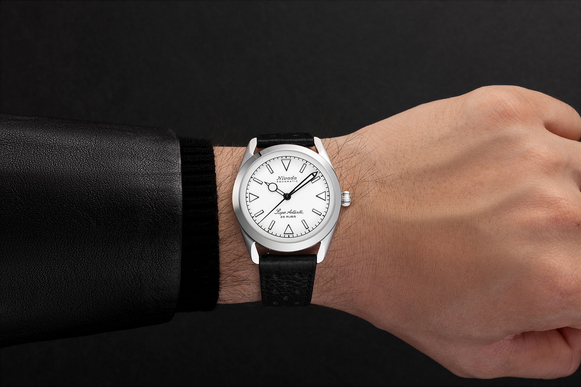 The Super Antarctic’s stainless steel case measures 38mm across, 45mm lug to lug, and 12mm thick, with finishing being a mixture of both brushed and polished. The Dial colors range from a matte black, tobacco brown or white and are decorated with applied stick and triangle hour markers. On some options, you will even find a 3-6-9 version.