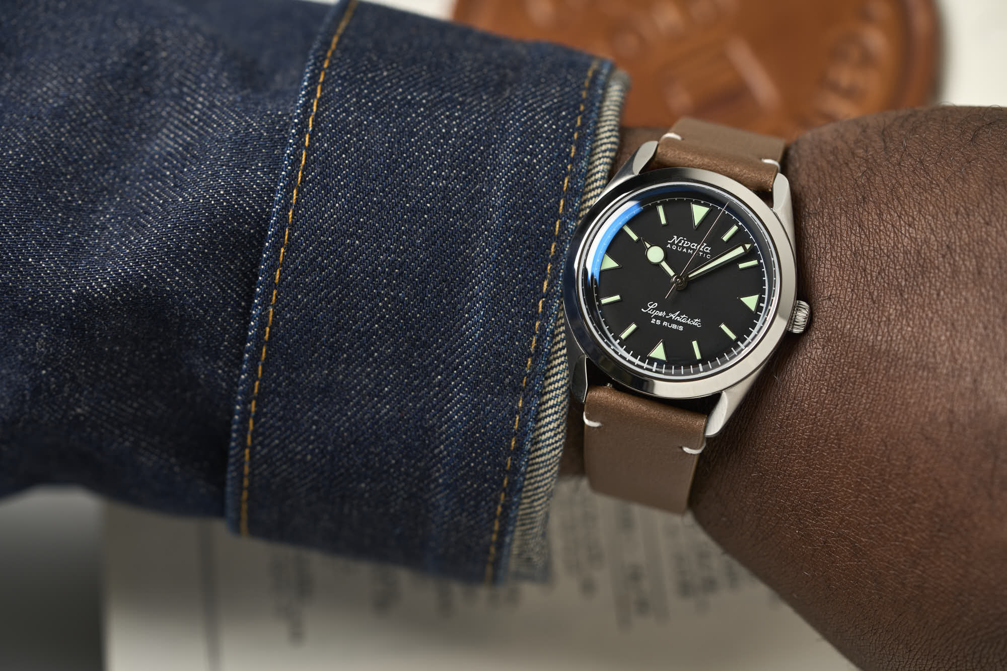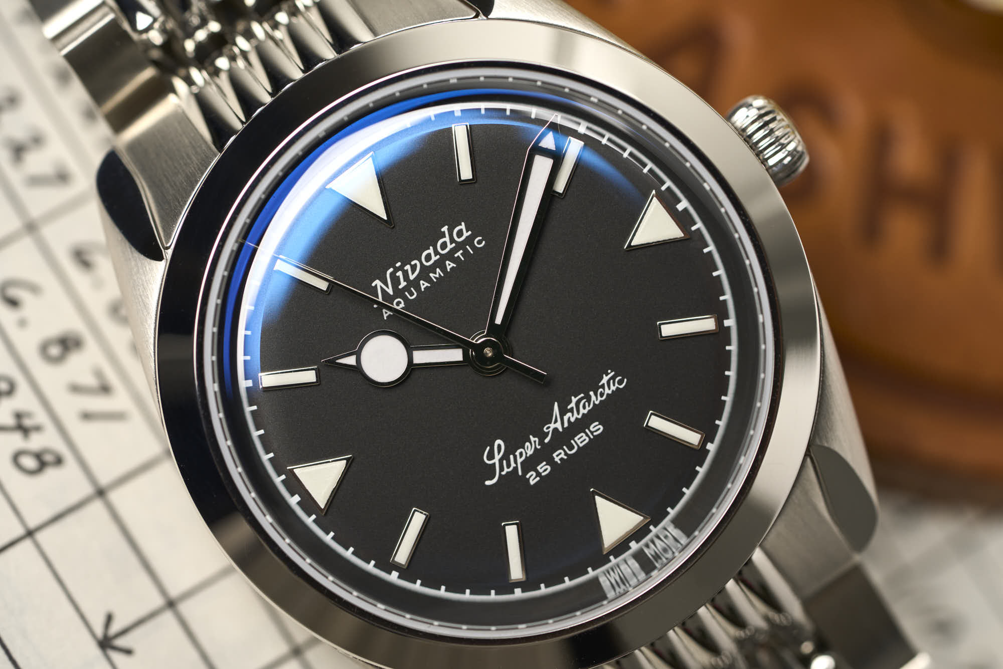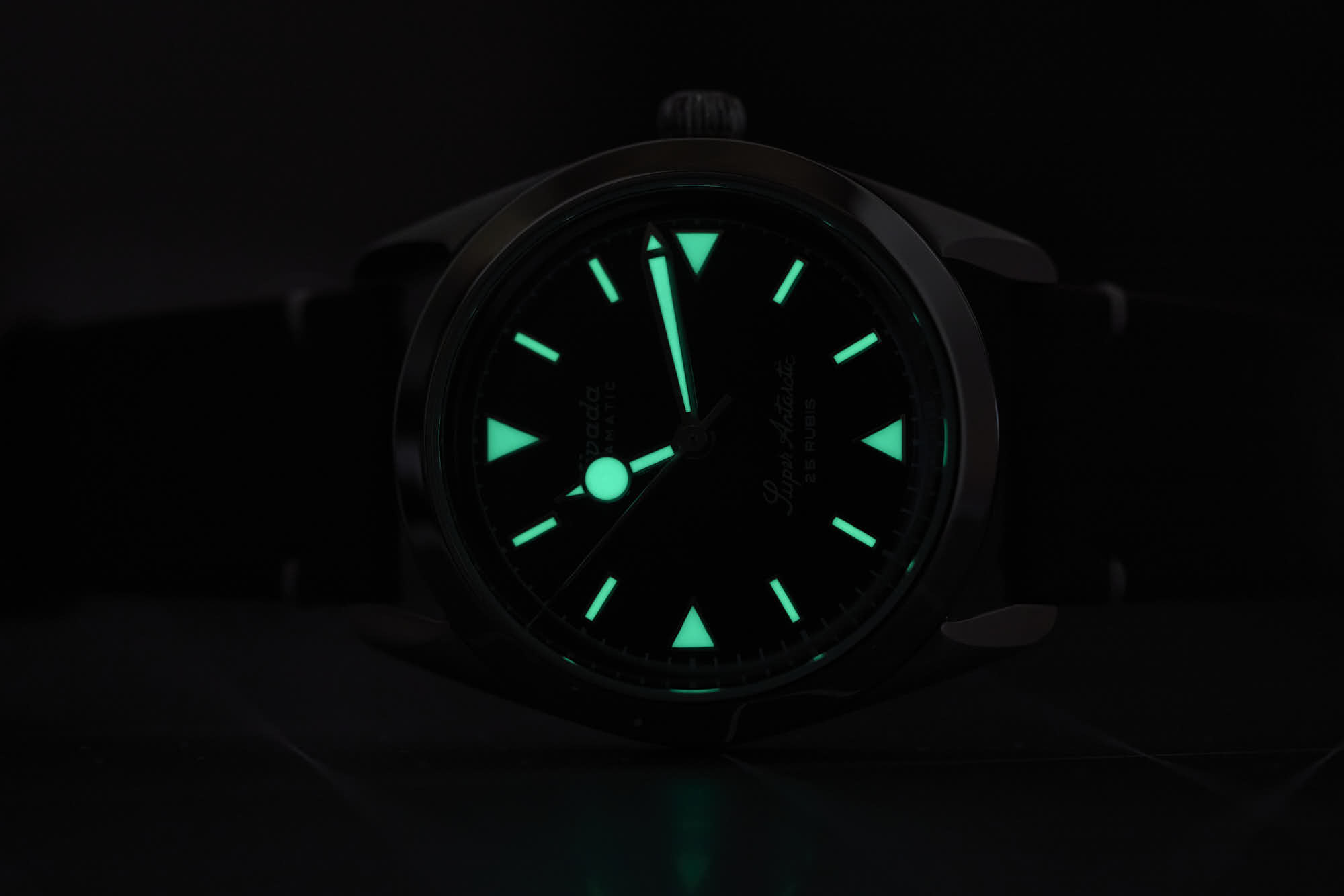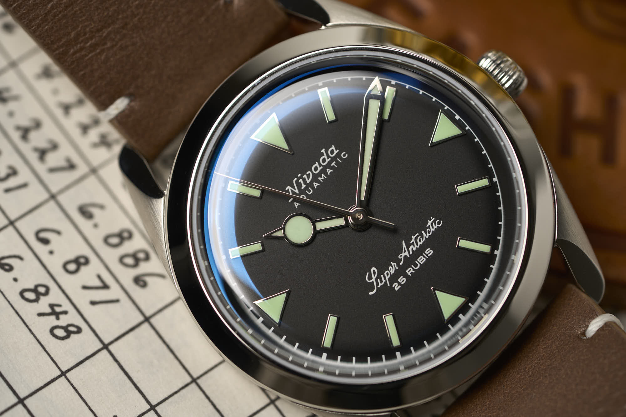 The Super Antarctic’s stainless steel case measures 38mm across, 45mm lug to lug, and 12mm thick, with finishing being a mixture of both brushed and polished. The Dial colors range from a matte black, tobacco brown or white and are decorated with applied stick and triangle hour markers. On some options, you will even find a 3-6-9 version.