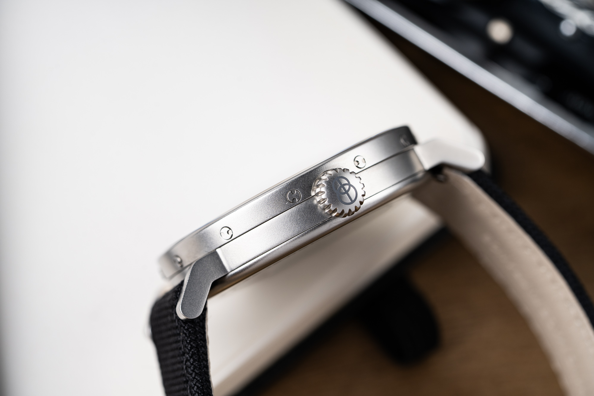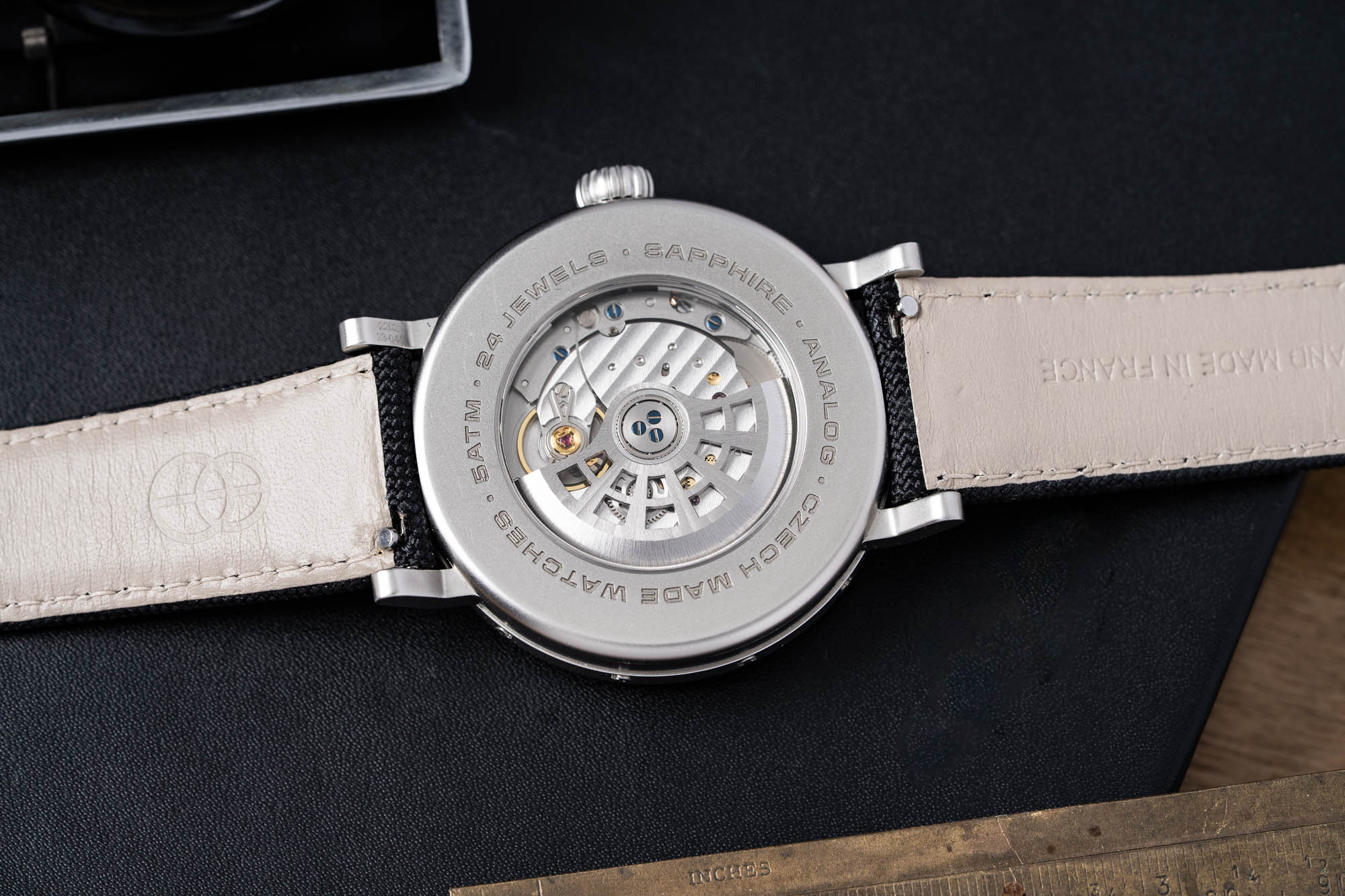 The dial, designed by Czech typographer Radek Sidun, features oversized relief markers that echo the forms found on early mechanical flip clocks by Elektročas and Pragotron. The typography, case, and hands come together with brutalist clarity — framed in a 42mm sandblasted stainless steel case and topped with an anti-reflective sapphire crystal. On the reverse, a large sapphire caseback offers a full view of the decorated Swiss-made La Joux-Perret G100 automatic movement, known for its 65-hour power reserve.