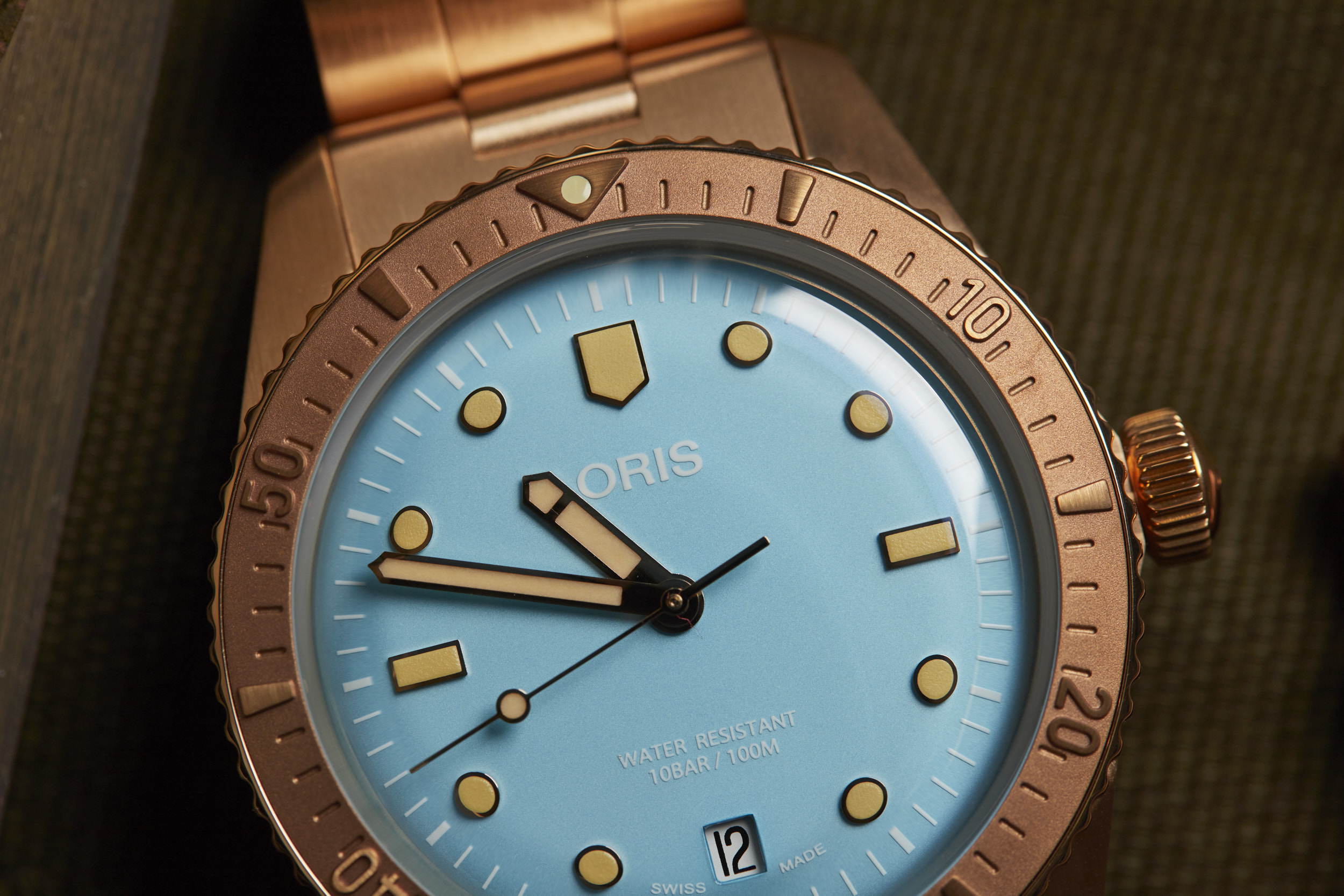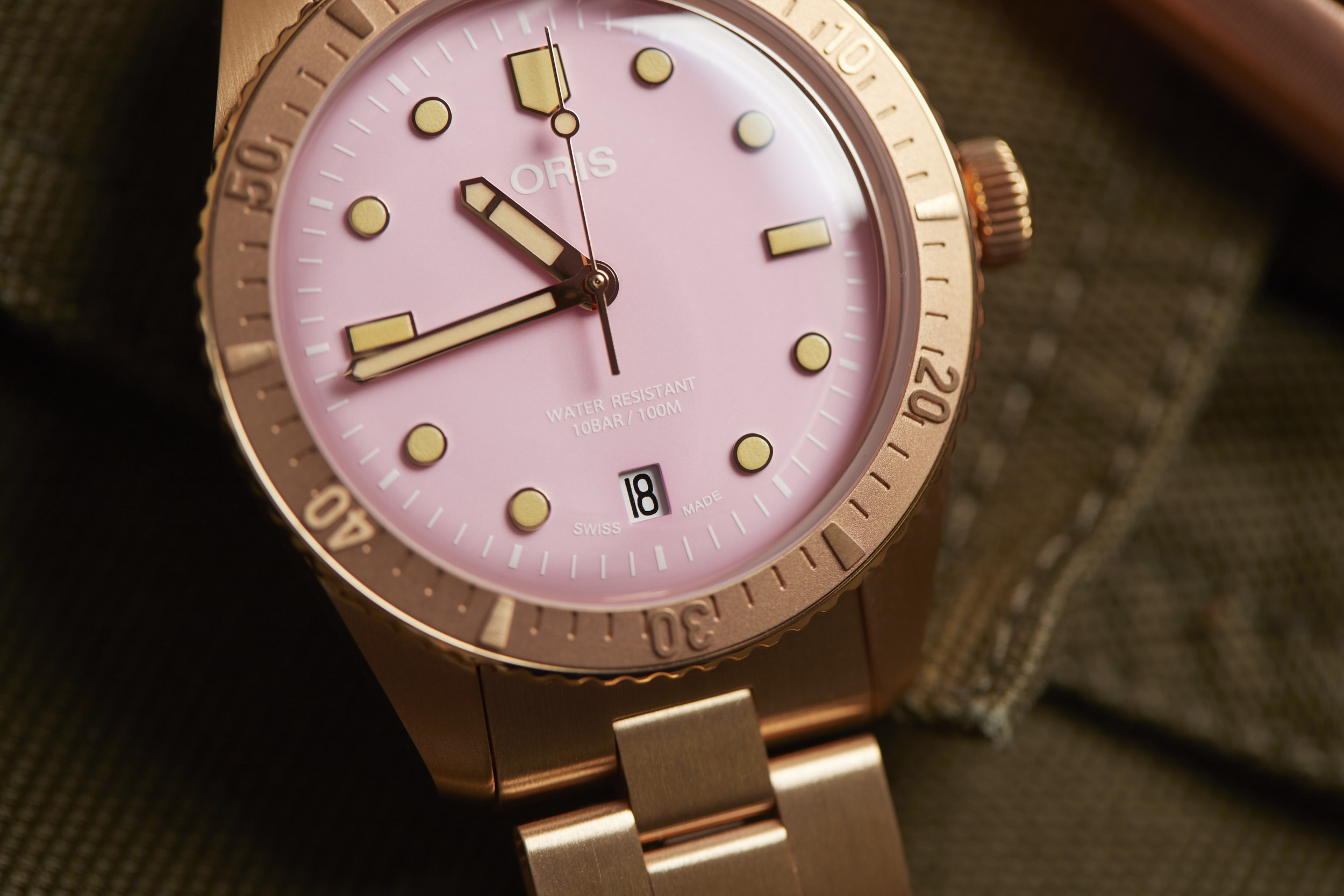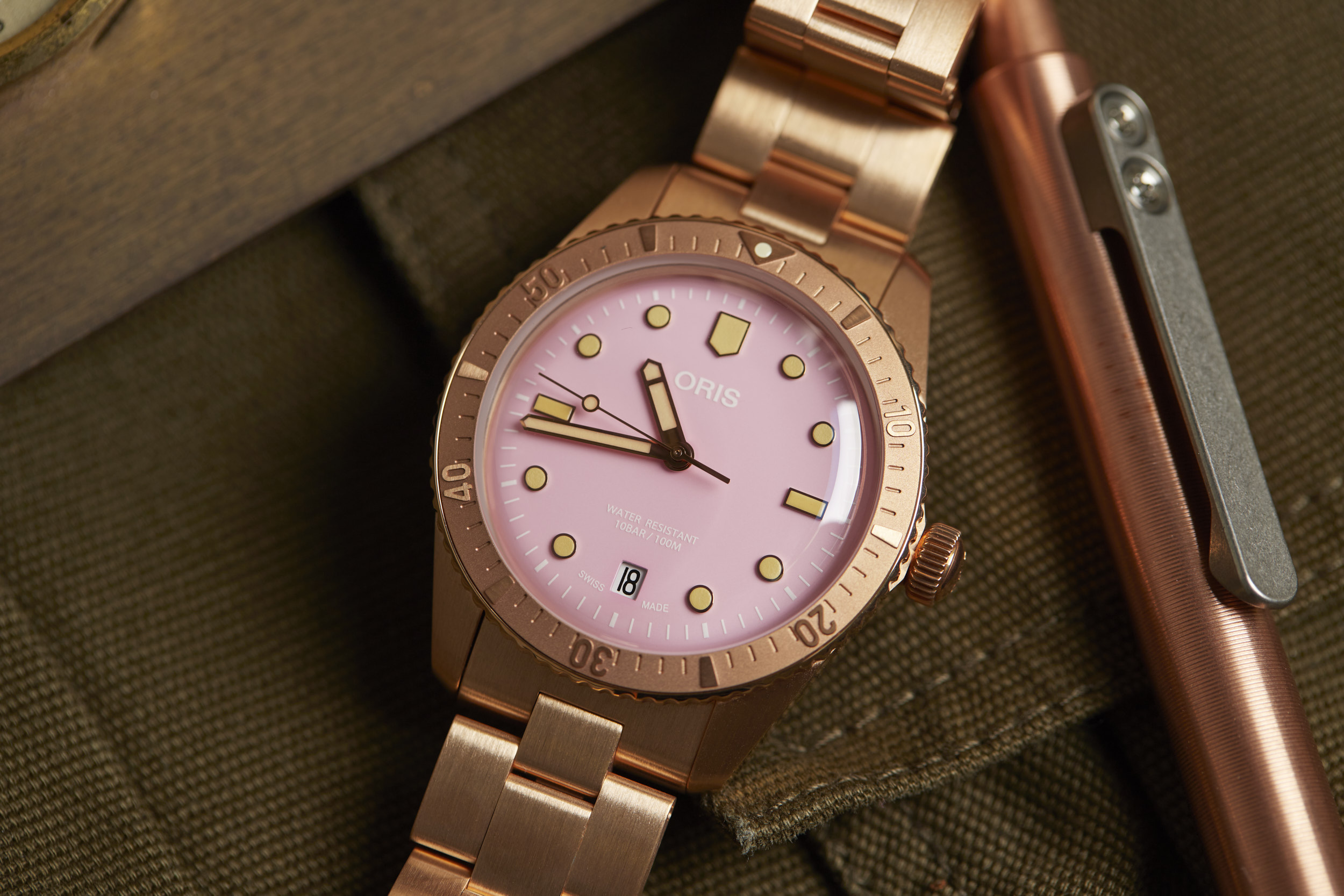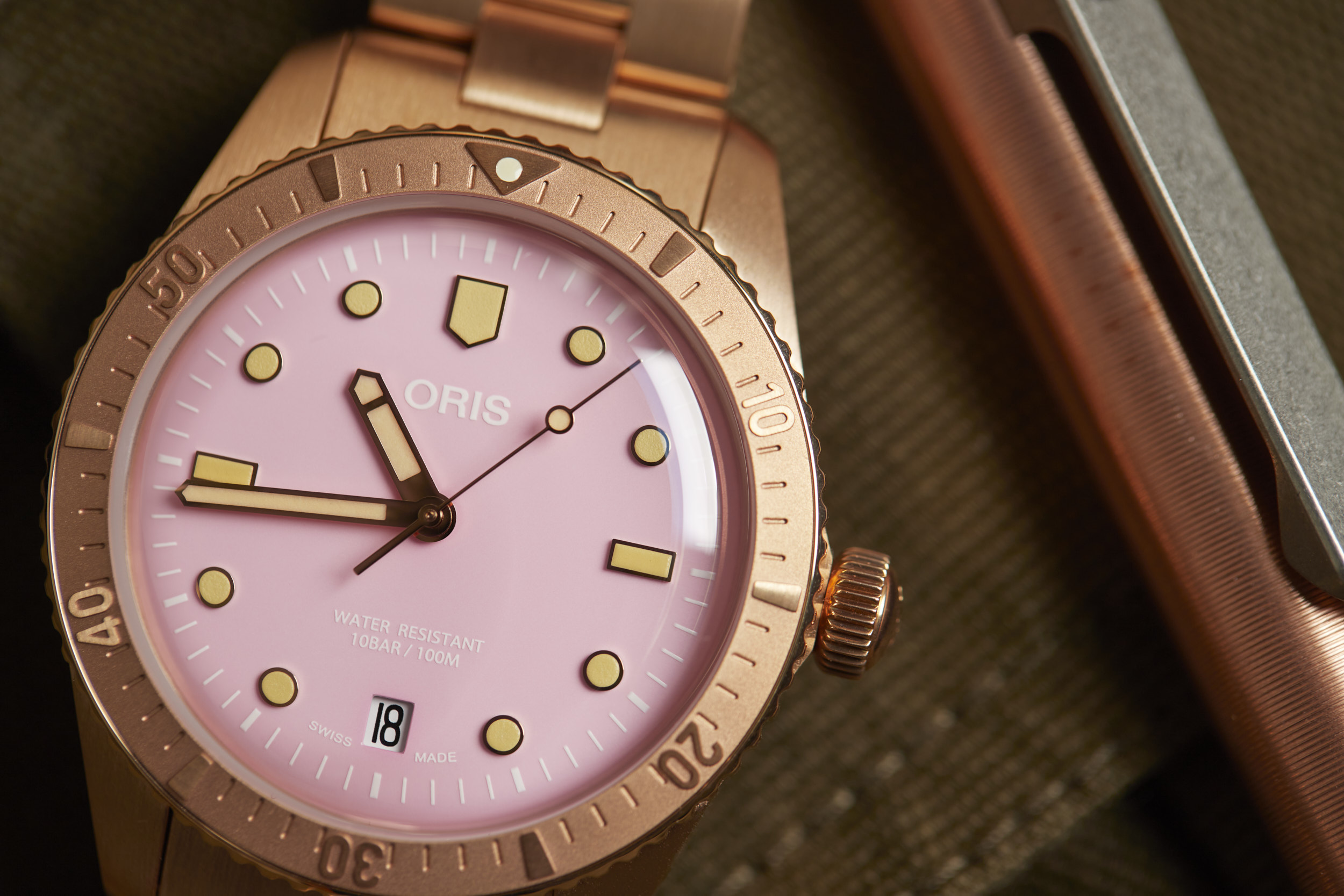 Apart from the dial colors, the standout is the 38mm fully bronze case. However, Oris didn’t stop there. The bezel and bracelet are also bronze, creating a unique look for the Cotton Candy Divers Sixty-Five. The bronze case will oxidize over time and create its own patina that will be unique to your watch. The bronze will become darker as it is worn and the patina acts as a protective layer for the bronze. If you desire, a simple salt and vinegar solution mixed with water will bring the bronze back to its original appearance and ready to start the oxidation process all over again.