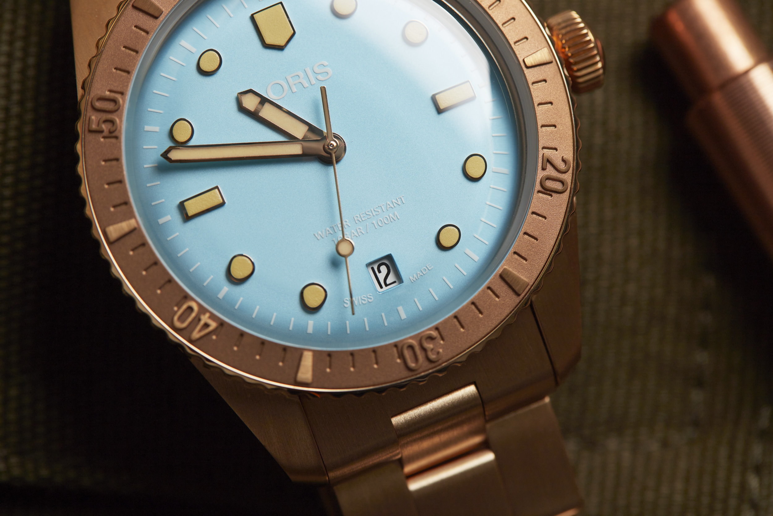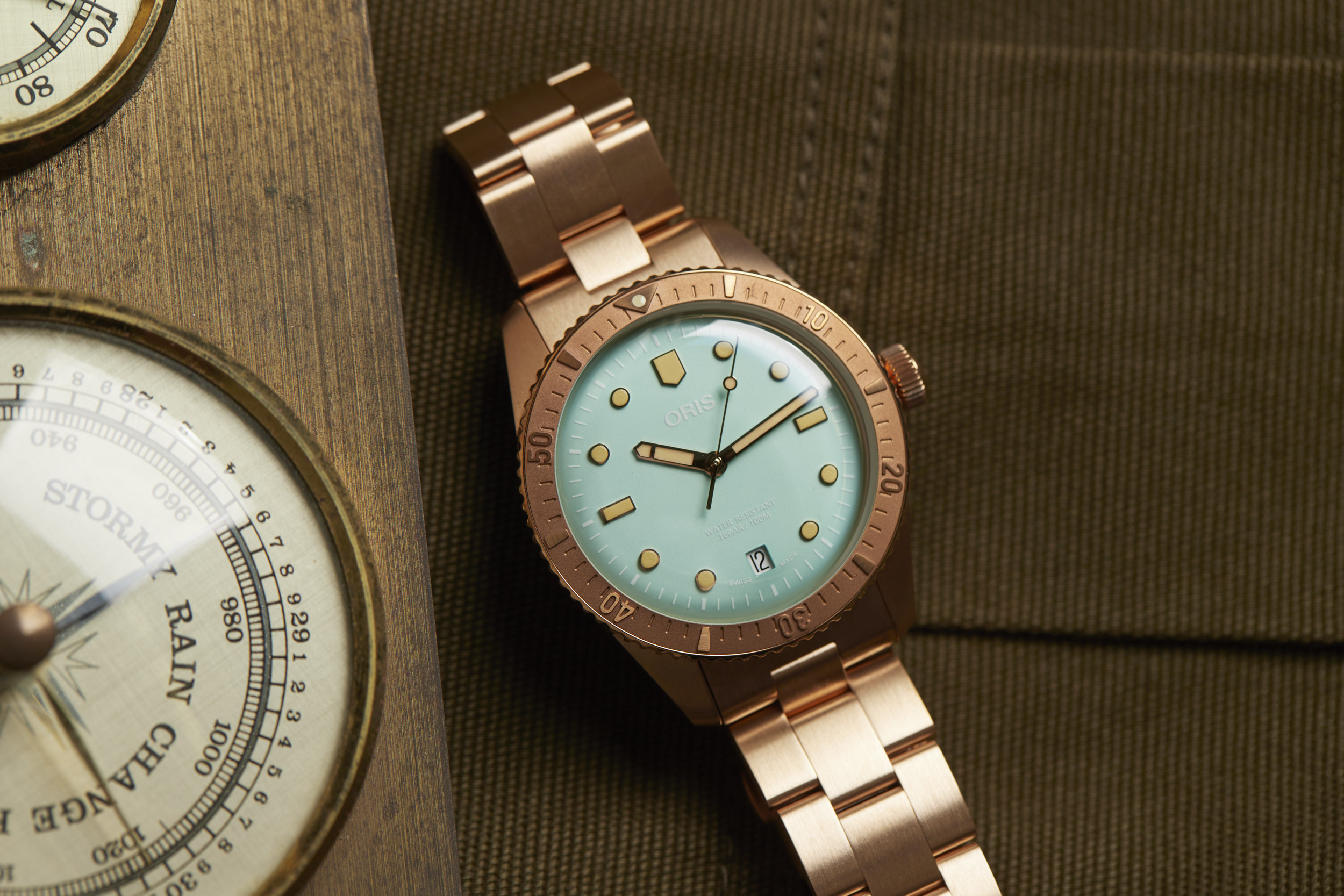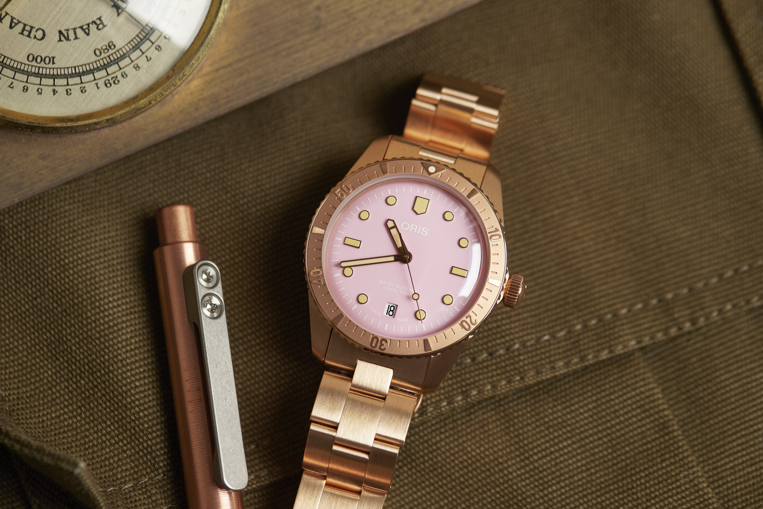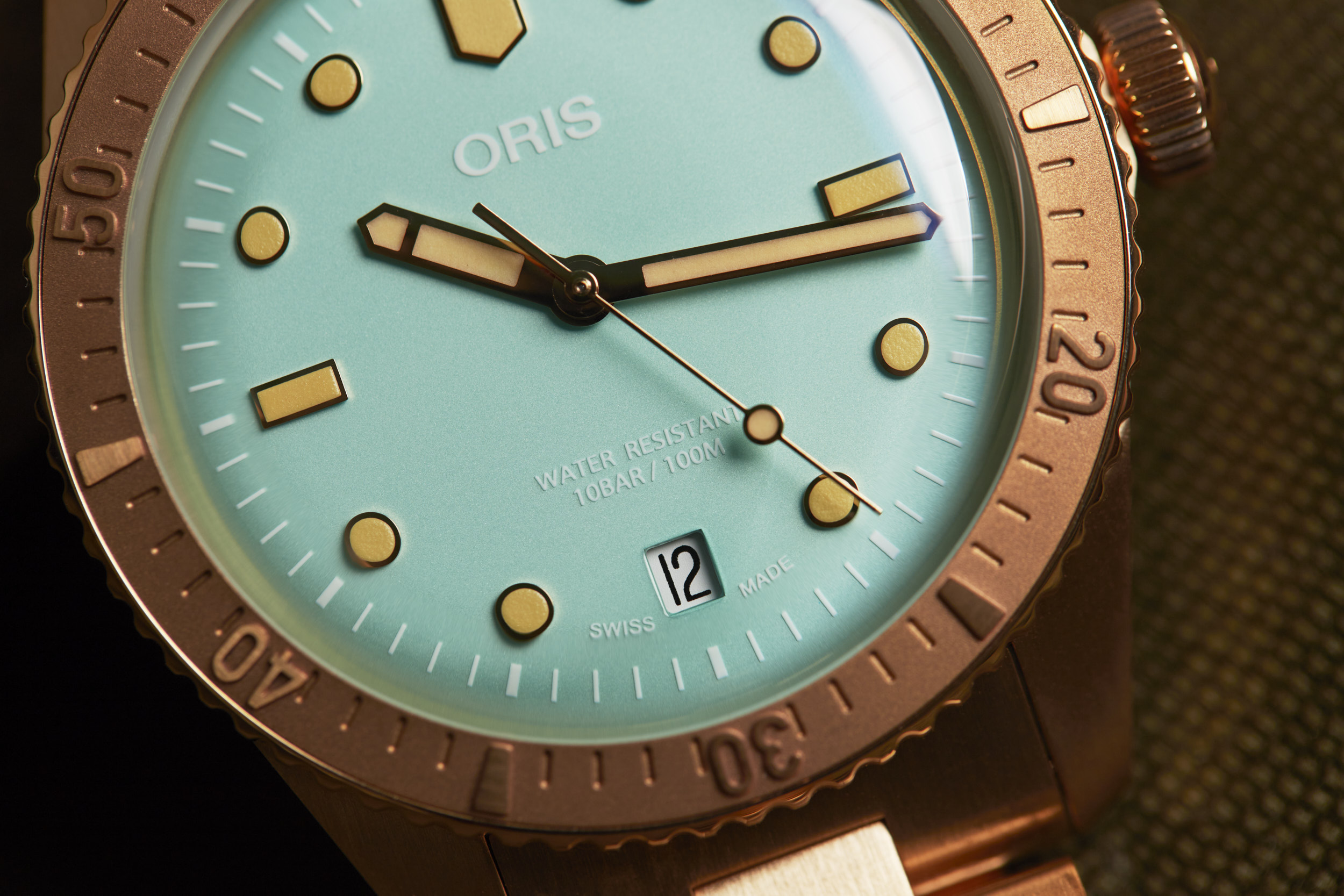 Apart from the dial colors, the standout is the 38mm fully bronze case. However, Oris didn’t stop there. The bezel and bracelet are also bronze, creating a unique look for the Cotton Candy Divers Sixty-Five. The bronze case will oxidize over time and create its own patina that will be unique to your watch. The bronze will become darker as it is worn and the patina acts as a protective layer for the bronze. If you desire, a simple salt and vinegar solution mixed with water will bring the bronze back to its original appearance and ready to start the oxidation process all over again.