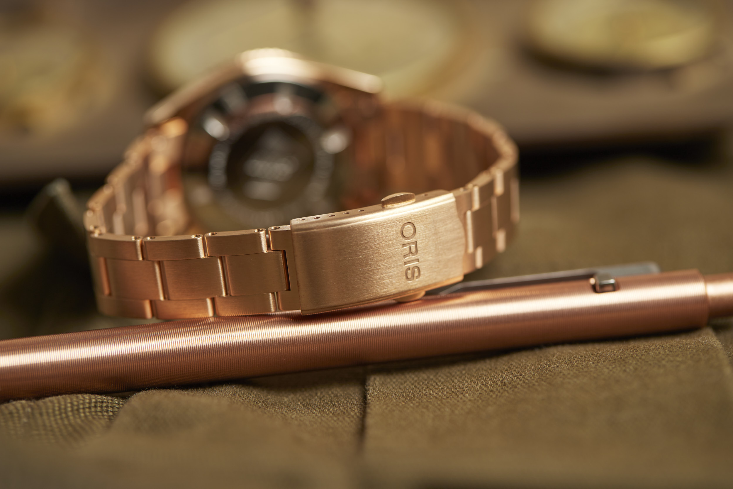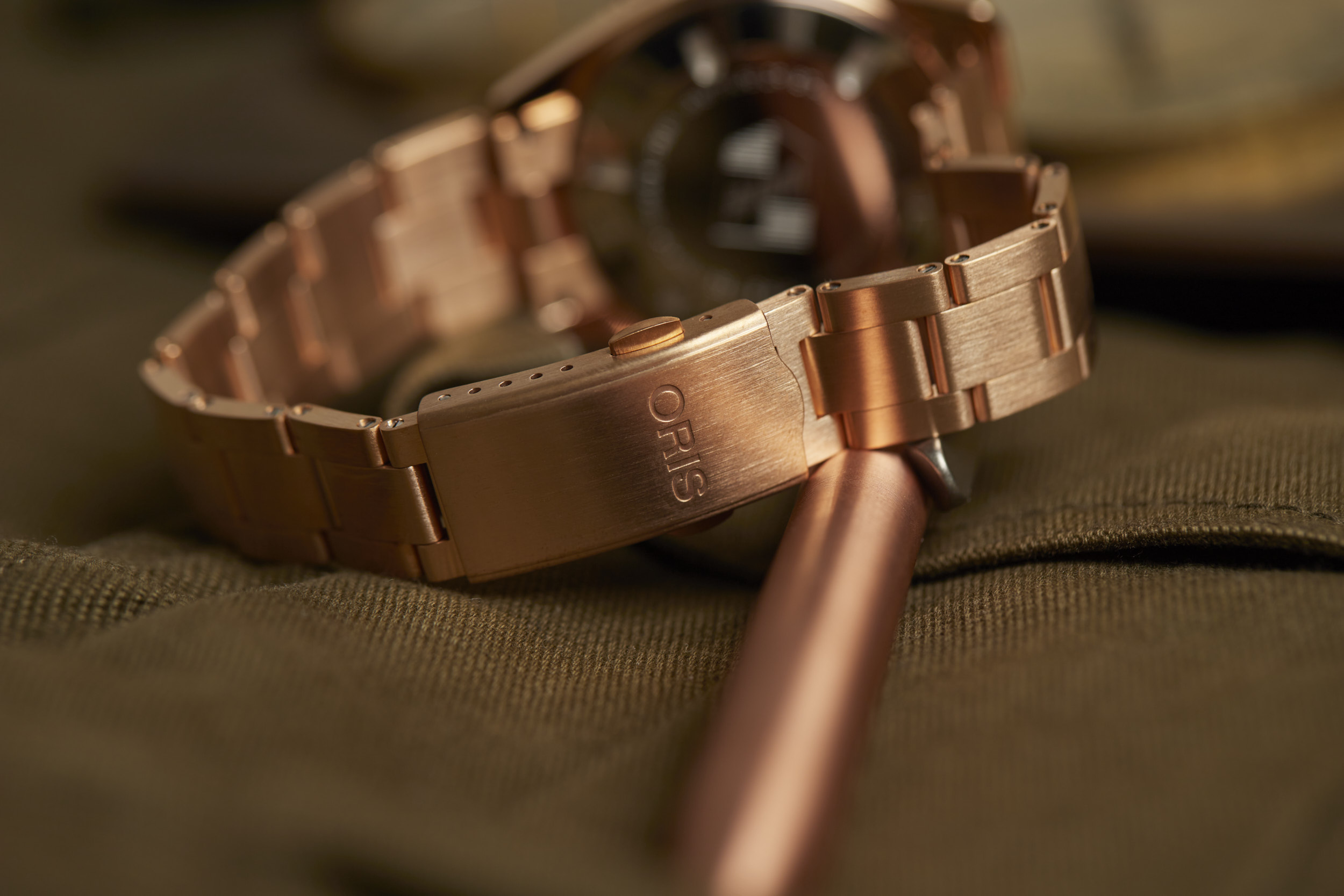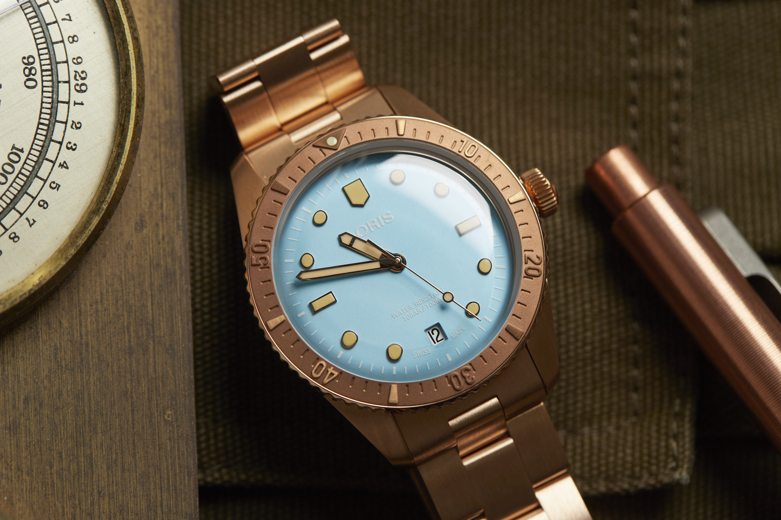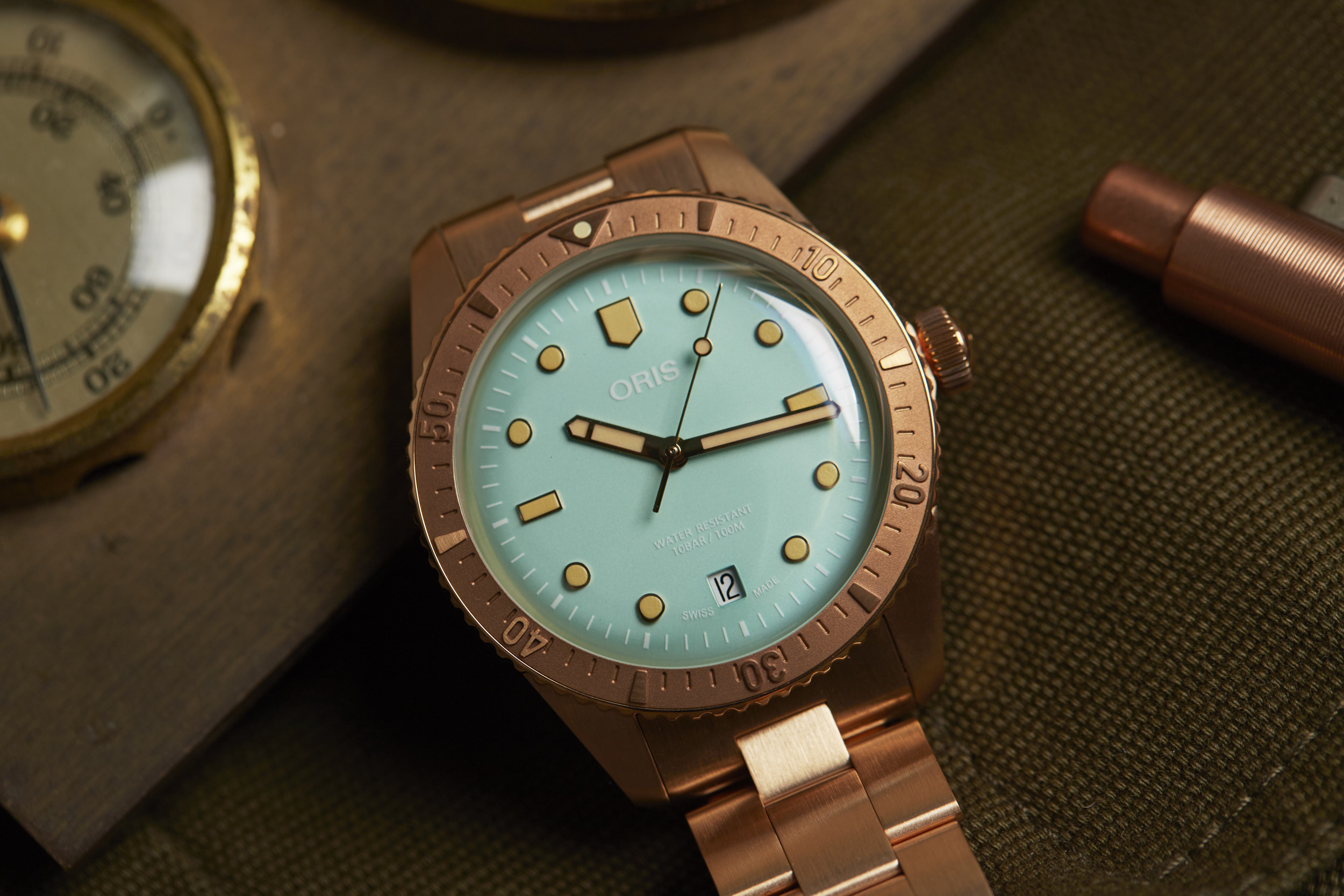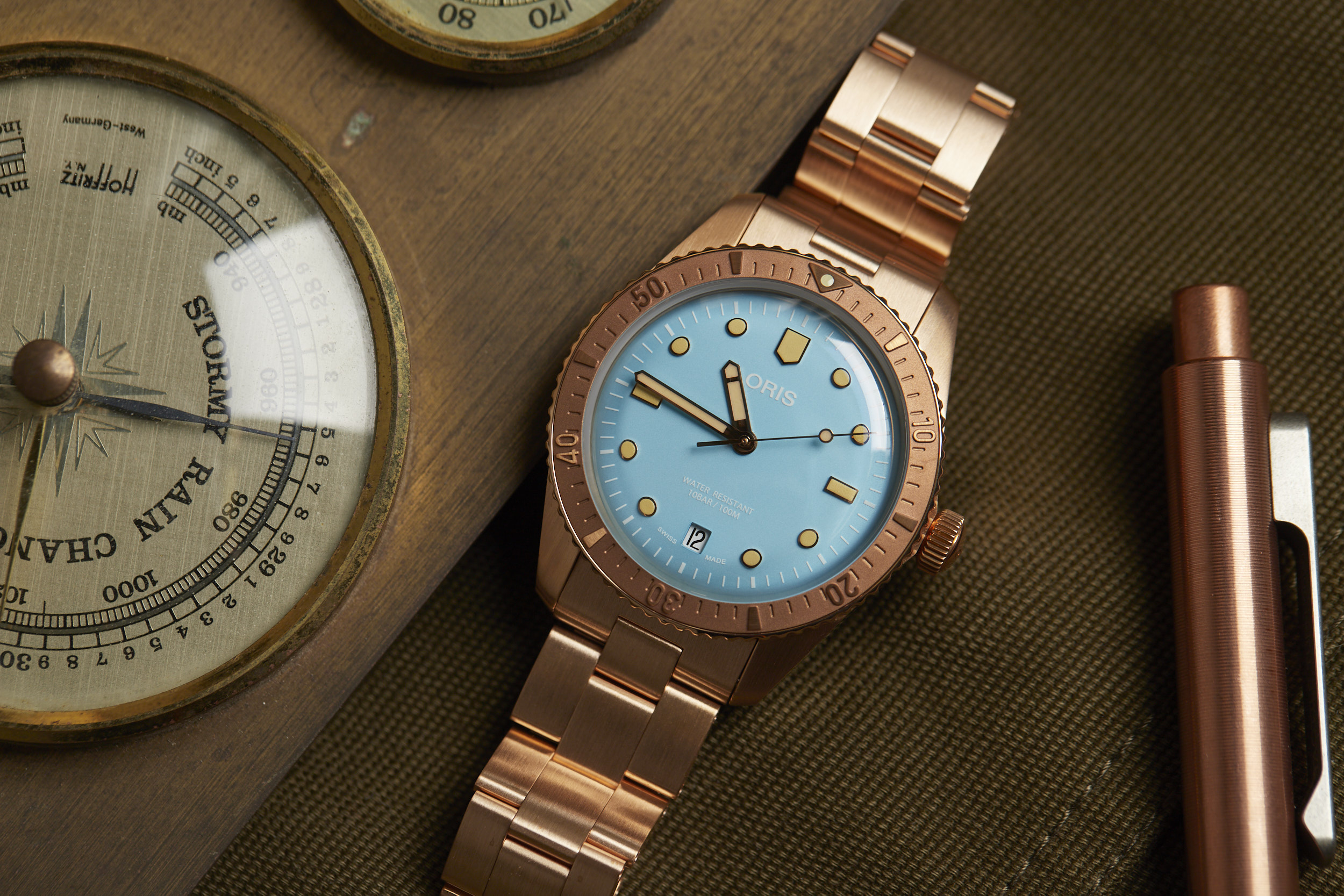Apart from the dial colors, the standout is the 38mm fully bronze case. However, Oris didn’t stop there. The bezel and bracelet are also bronze, creating a unique look for the Cotton Candy Divers Sixty-Five. The bronze case will oxidize over time and create its own patina that will be unique to your watch. The bronze will become darker as it is worn and the patina acts as a protective layer for the bronze. If you desire, a simple salt and vinegar solution mixed with water will bring the bronze back to its original appearance and ready to start the oxidation process all over again.