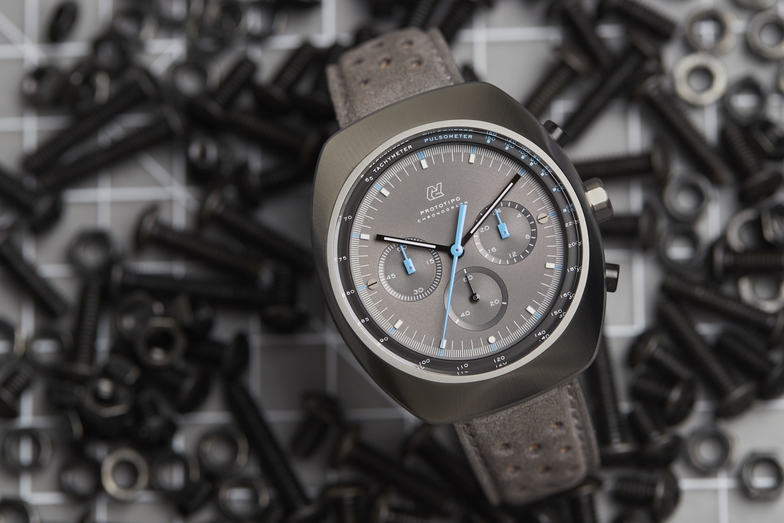 For the joint 10th anniversaries of Worn & Wound and Autodromo, we’ve created a special limited edition version of the Prototipo with a sleek style. Riffing off of a previous collaboration, this version is rendered in smokey gray tones with a couple of flashes of blue. The case is coated in gun-metal plating and features a mix of brushing and matte blasted details. The dial is a matching gray with a subtle metallic finish. Indexes in black and white are easy to read, while the occasional blue highlight stands out. The watch is finished with a gray suede rally strap that suits its style perfectly.