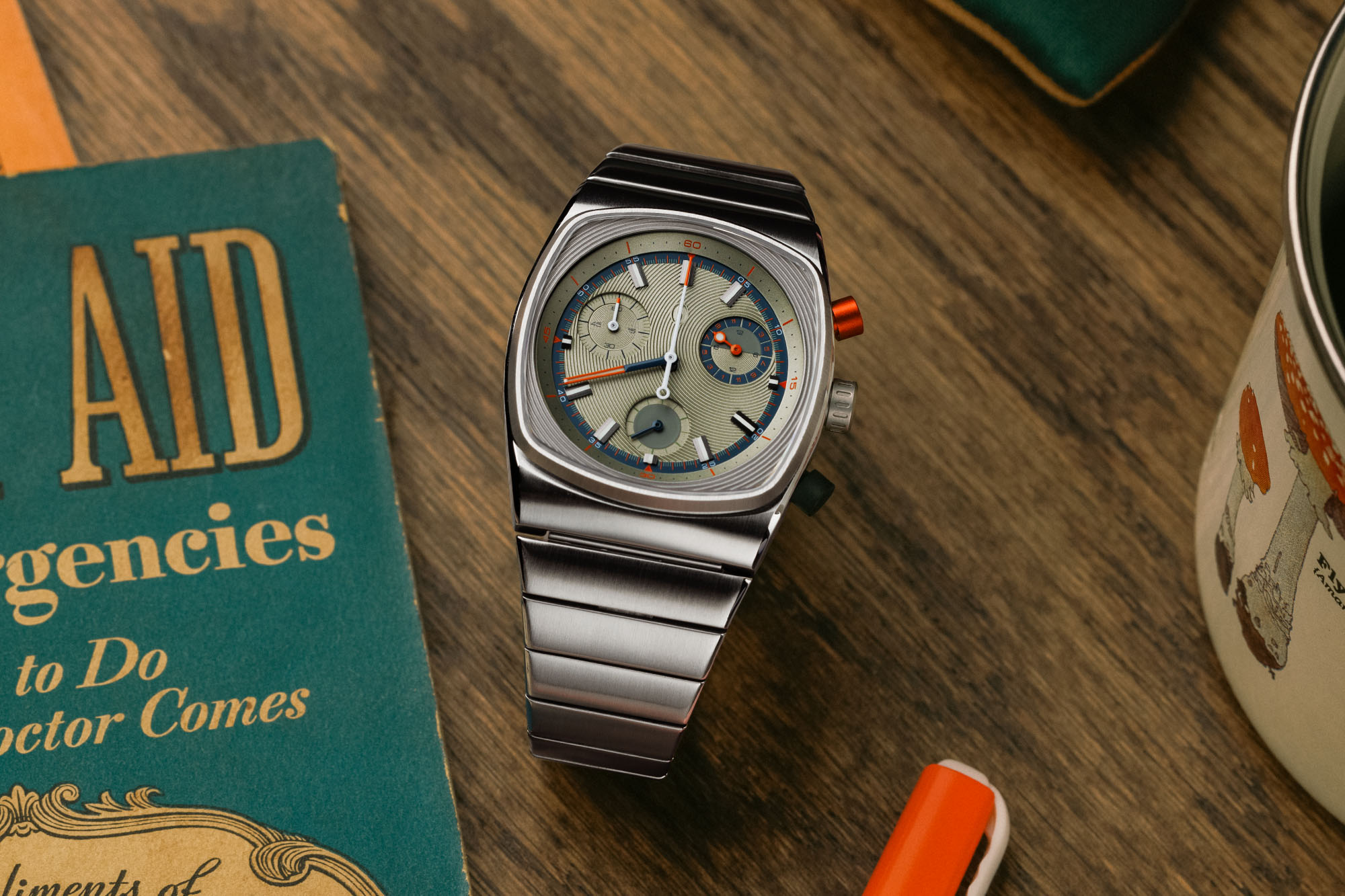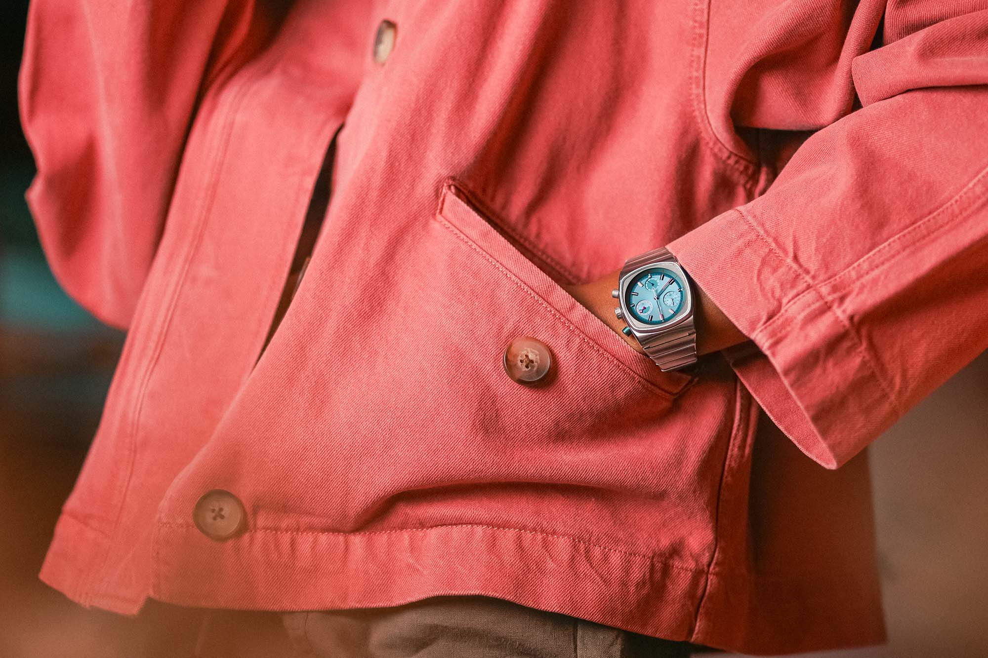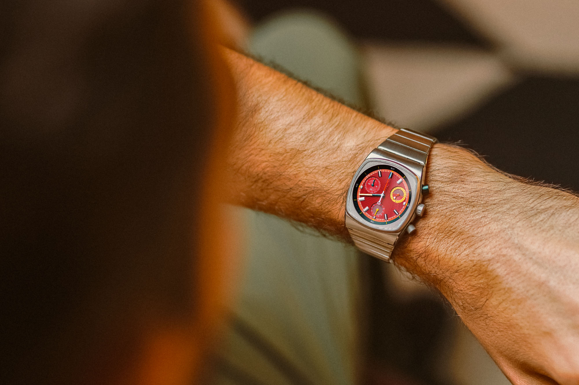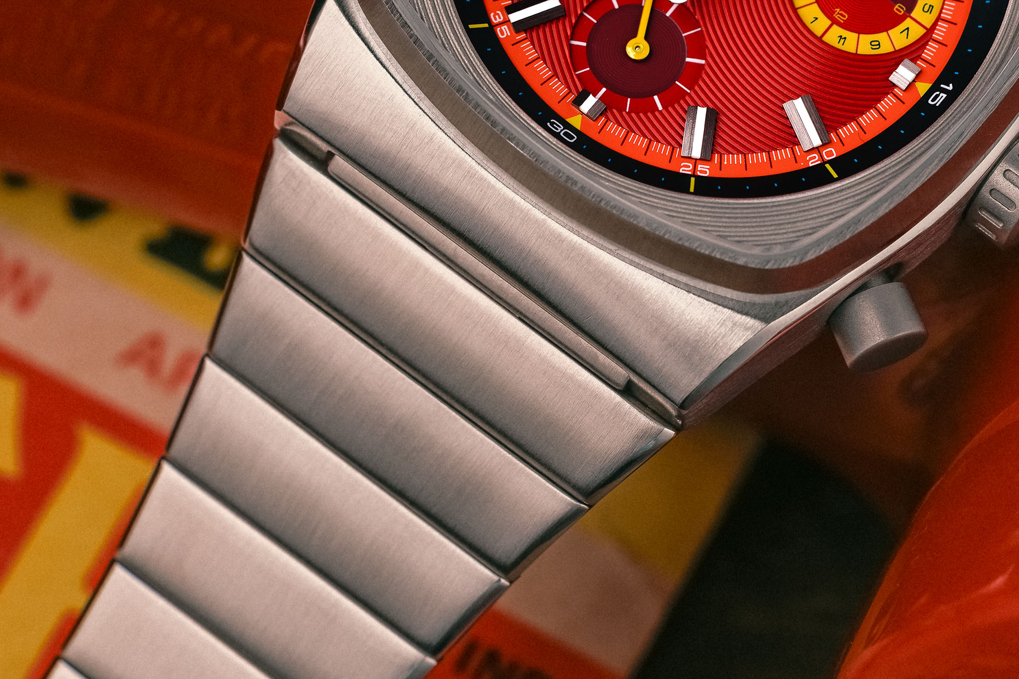 Based on Brew’s Metric line, the Chrono Regulators are sleek 36mm rounded squares, or cushions if you’re so inclined, with bracelets that flow like that of integrated sports watches. Their vibe is 70s but their look is their own. Compact and thin, they are a great size for all wrists. For the collaboration, concentric circles have been added to the surface around the dial, and the pusher have been color-coordinated for the dials.