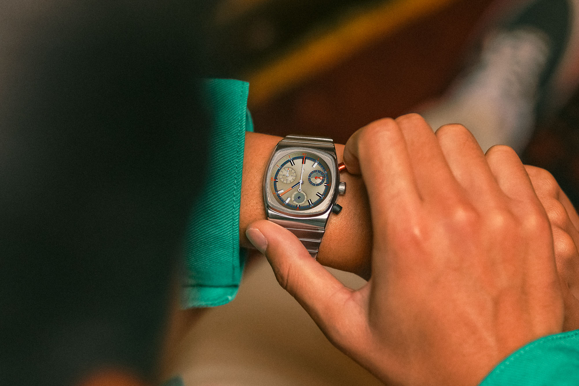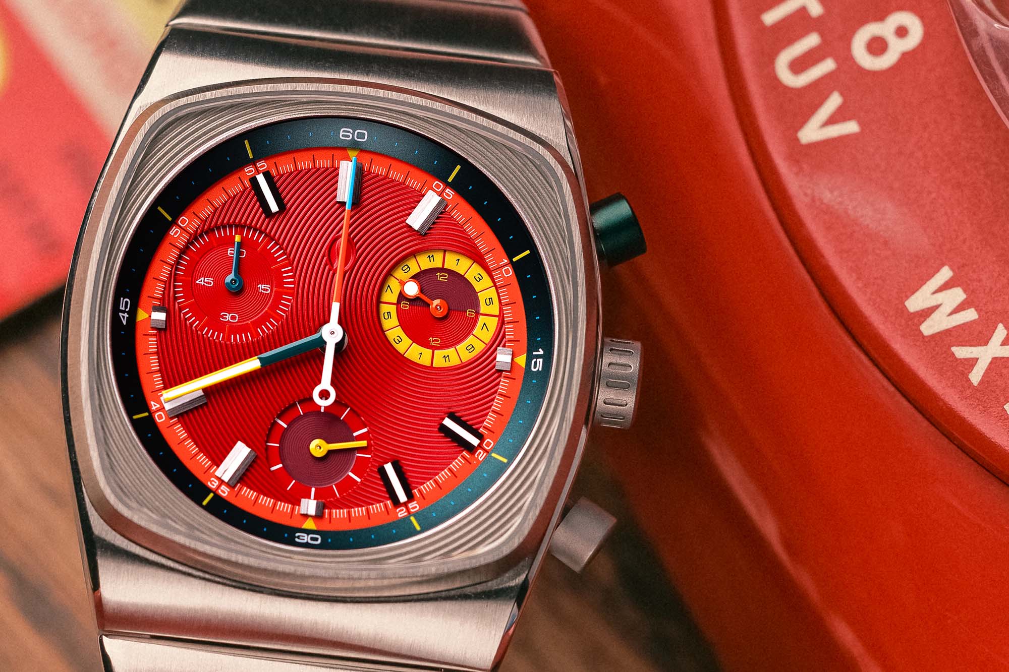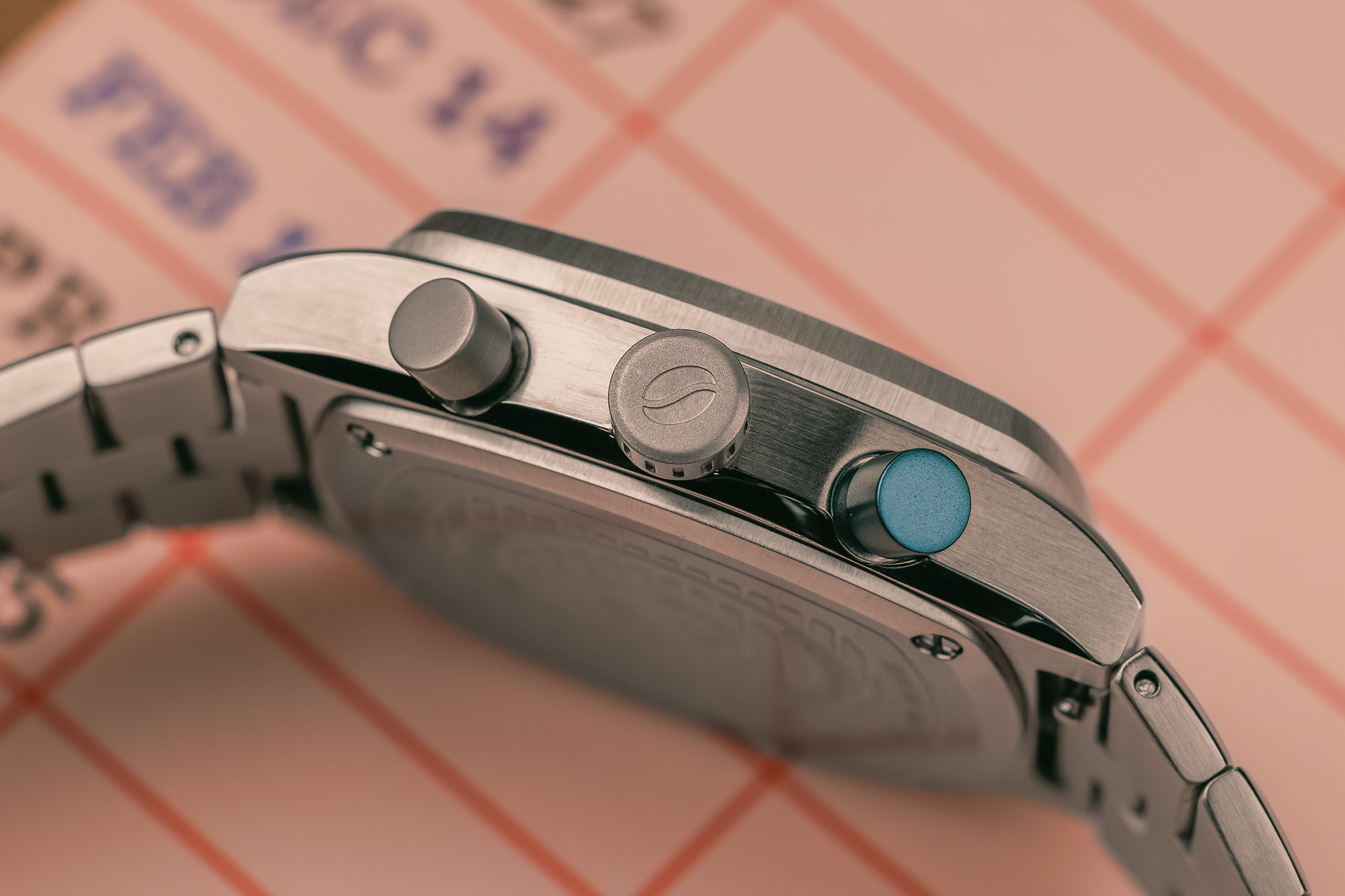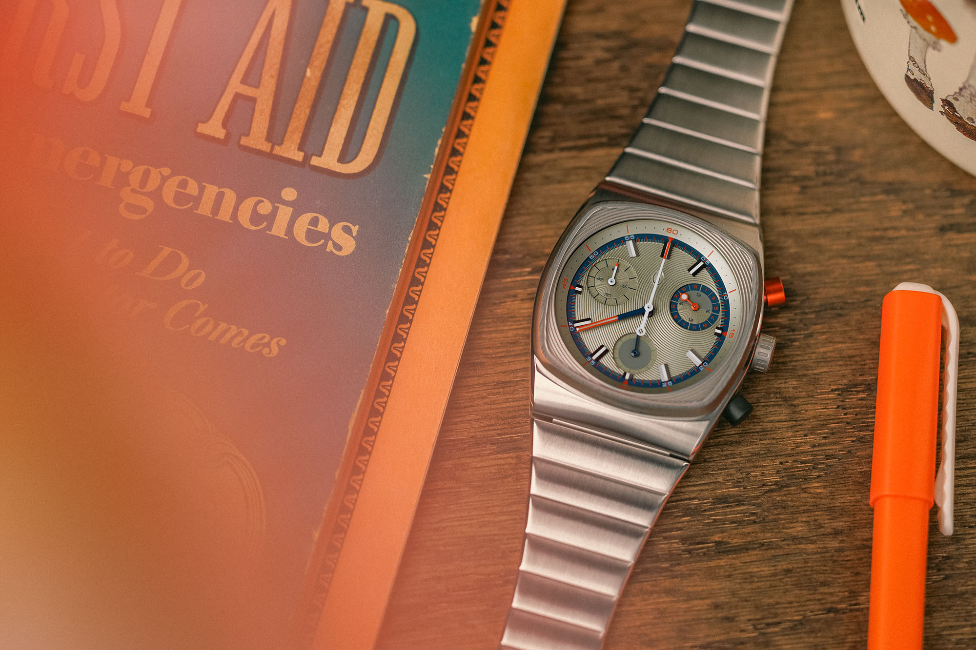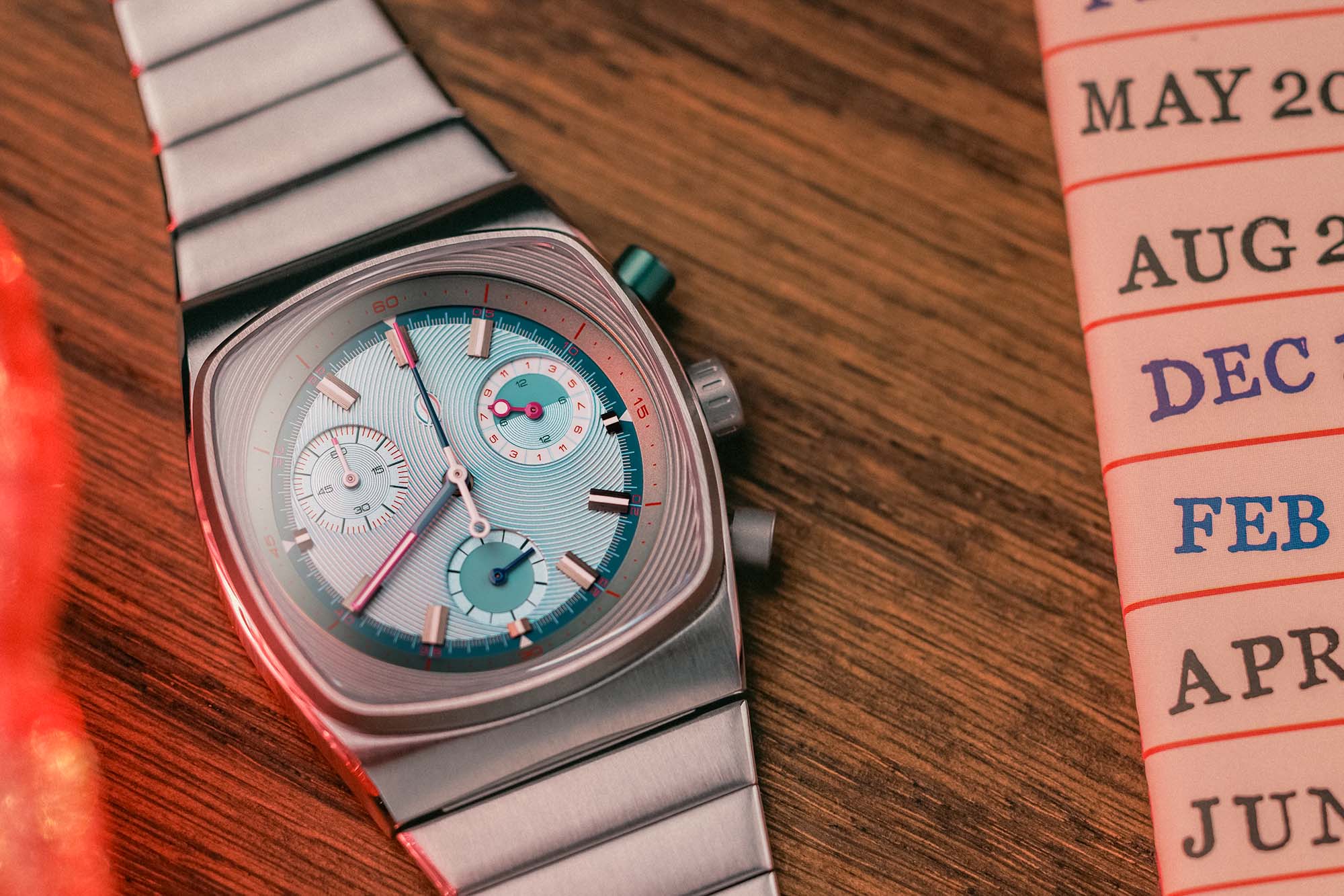 Based on Brew’s Metric line, the Chrono Regulators are sleek 36mm rounded squares, or cushions if you’re so inclined, with bracelets that flow like that of integrated sports watches. Their vibe is 70s but their look is their own. Compact and thin, they are a great size for all wrists. For the collaboration, concentric circles have been added to the surface around the dial, and the pusher have been color-coordinated for the dials.