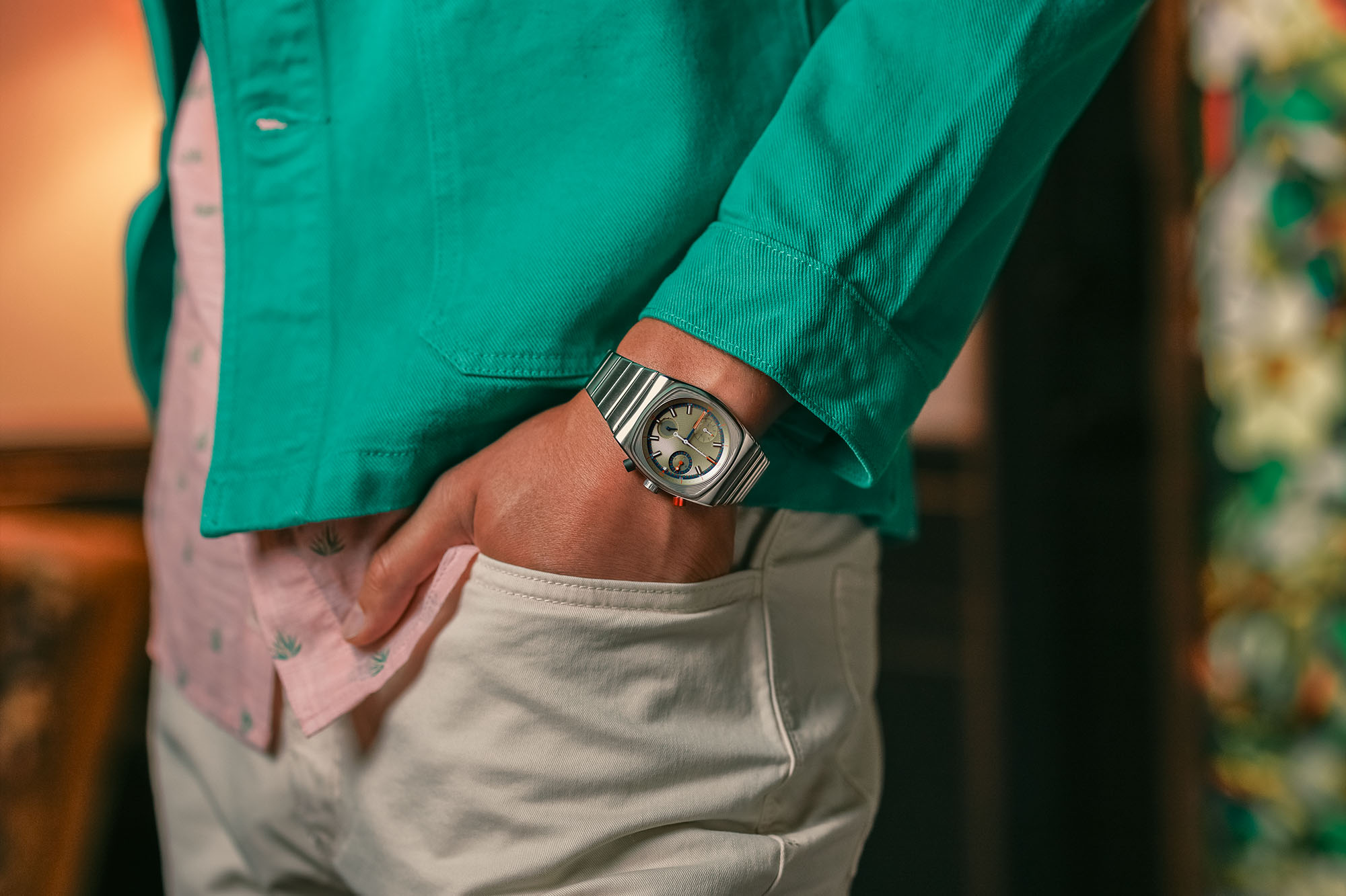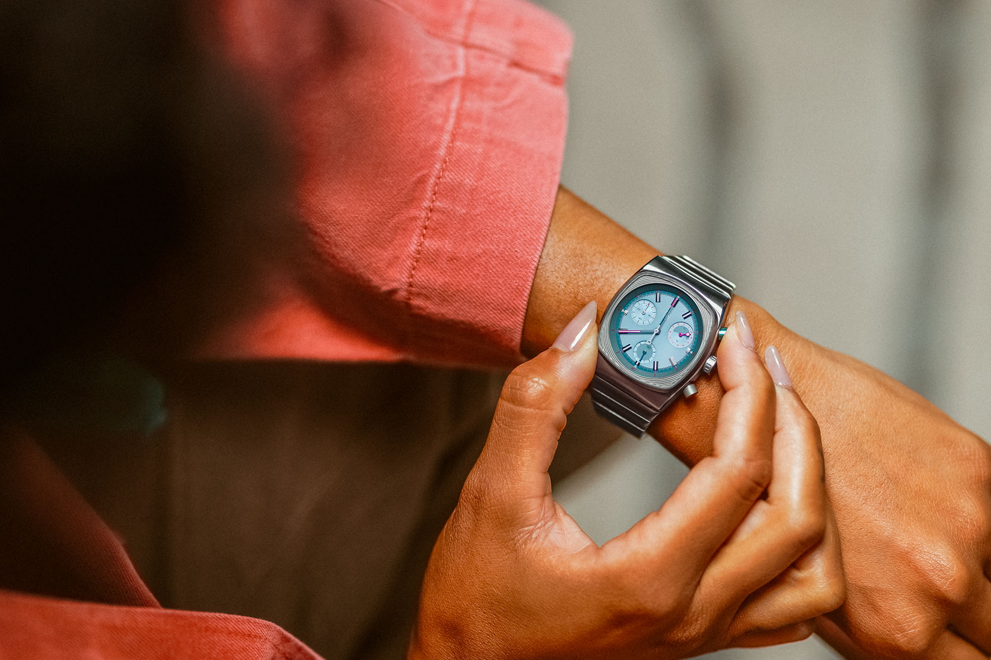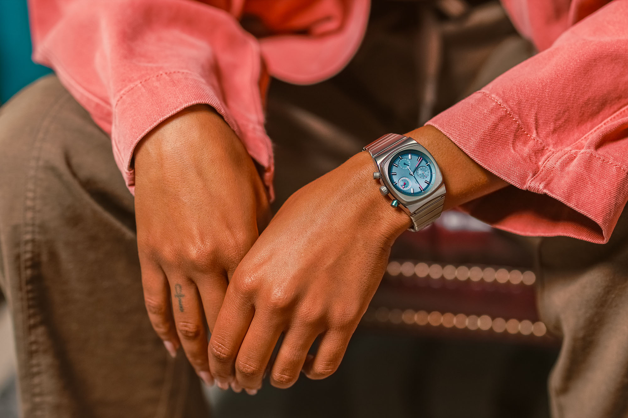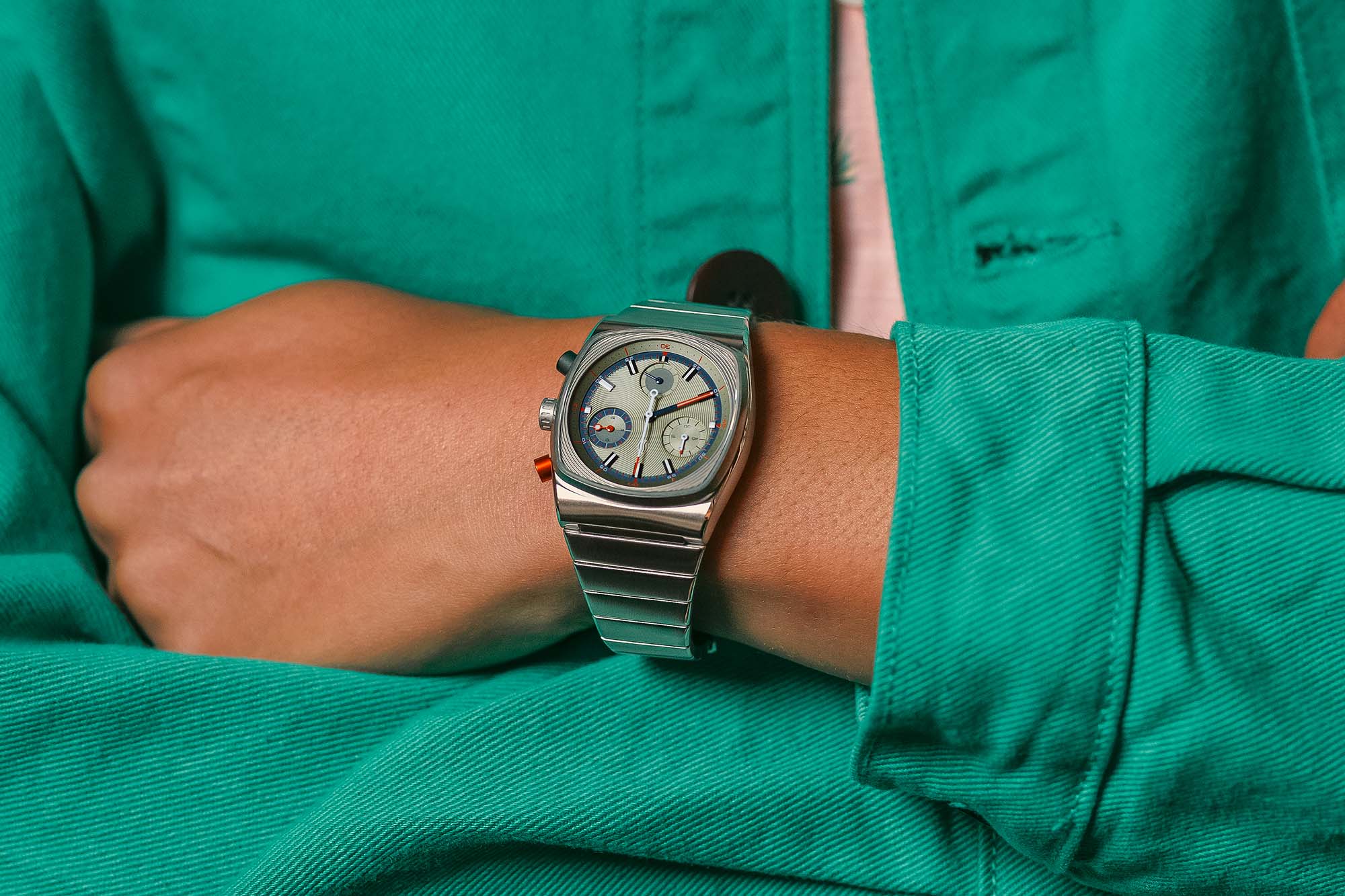 Based on Brew’s Metric line, the Chrono Regulators are sleek 36mm rounded squares, or cushions if you’re so inclined, with bracelets that flow like that of integrated sports watches. Their vibe is 70s but their look is their own. Compact and thin, they are a great size for all wrists. For the collaboration, concentric circles have been added to the surface around the dial, and the pusher have been color-coordinated for the dials.