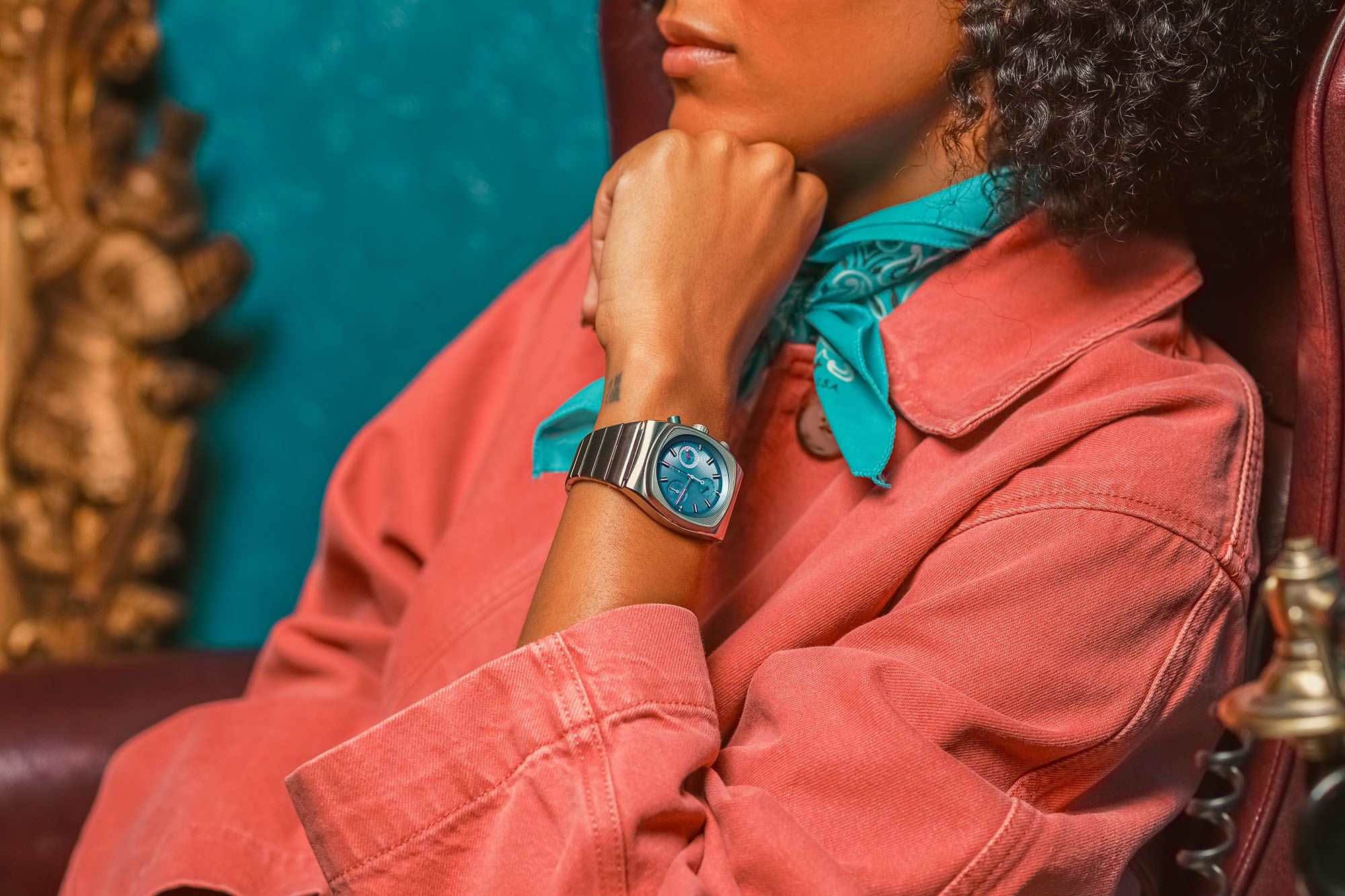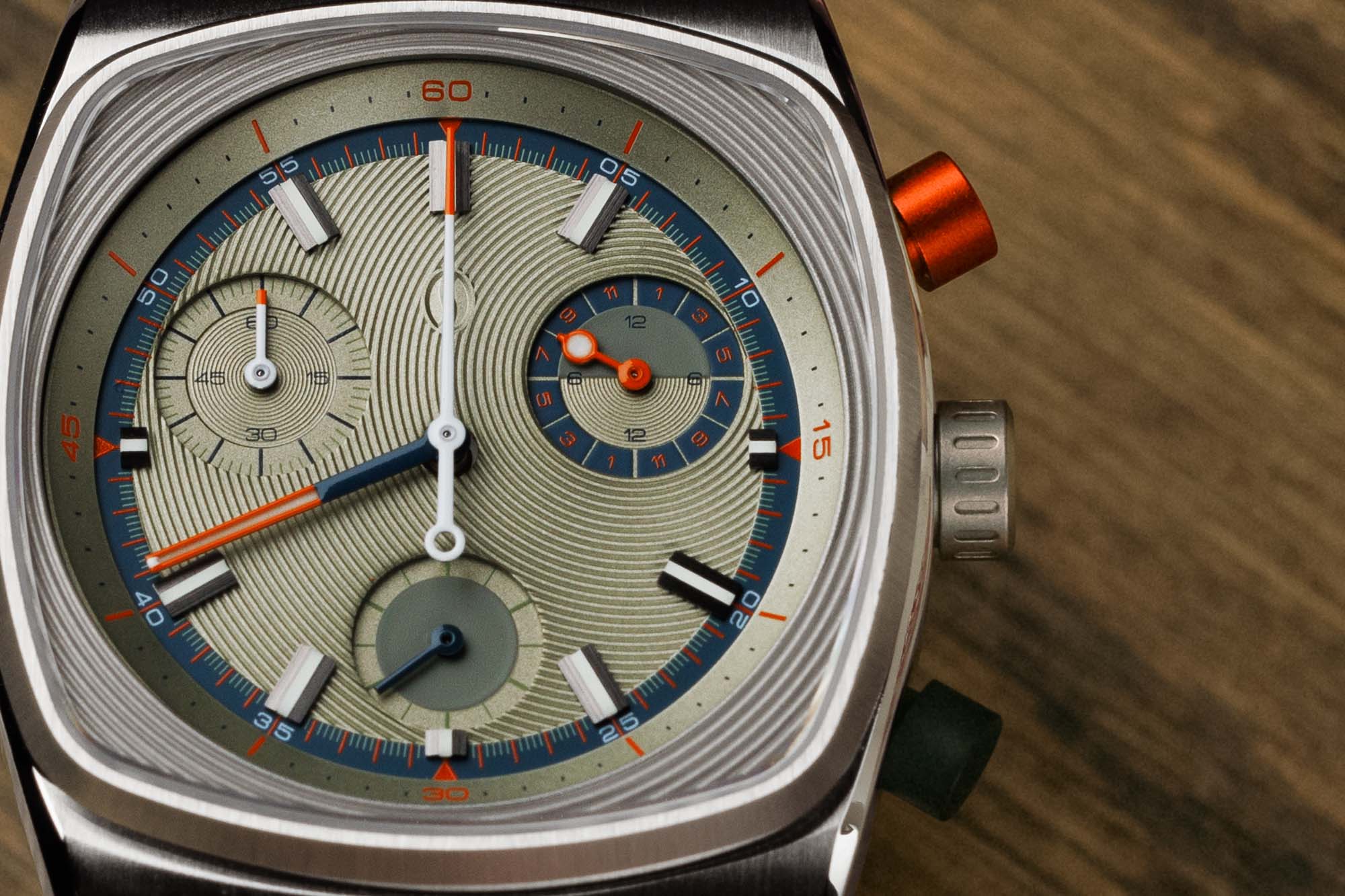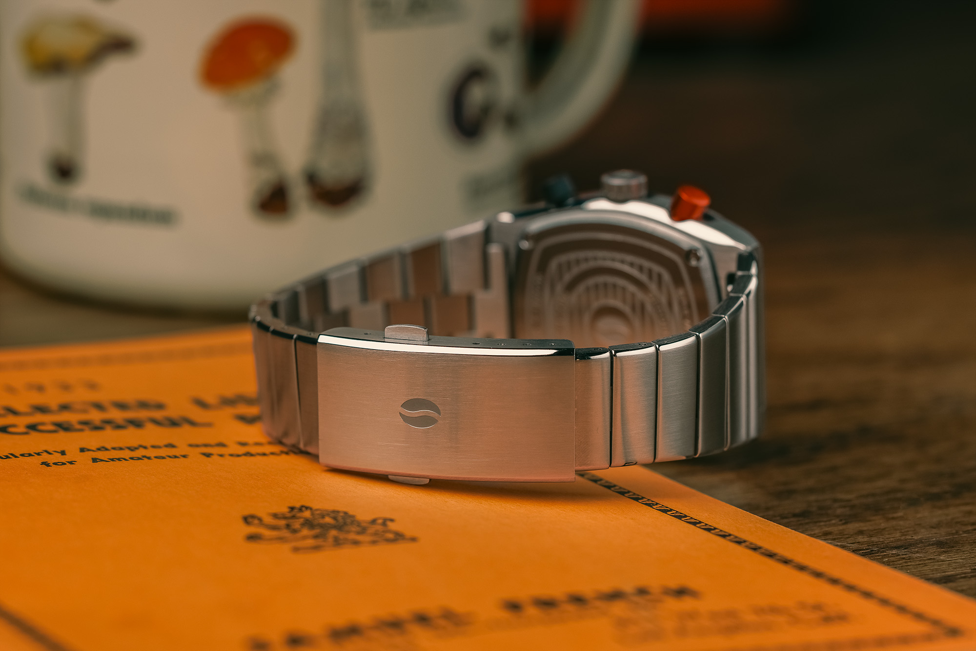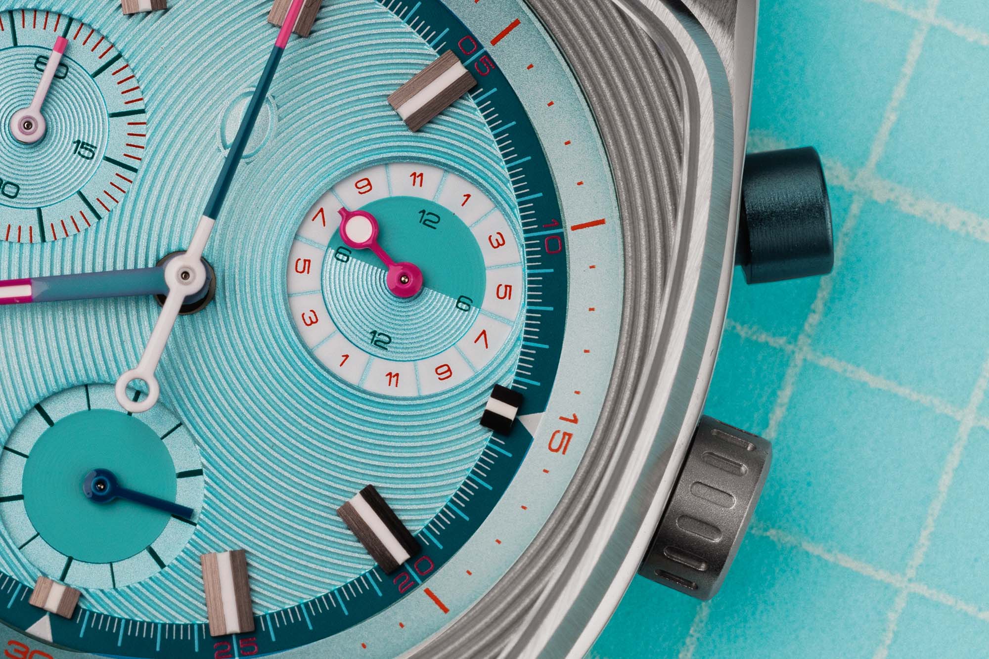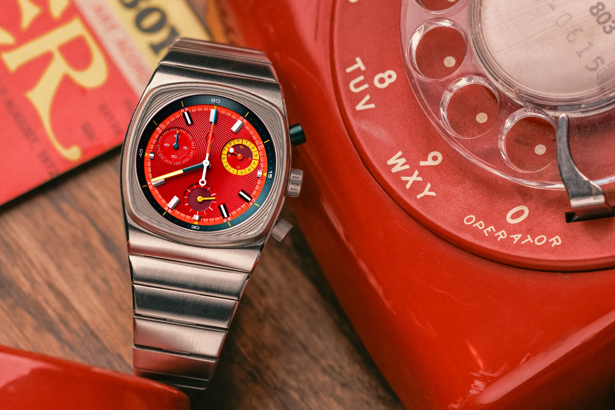 Based on Brew’s Metric line, the Chrono Regulators are sleek 36mm rounded squares, or cushions if you’re so inclined, with bracelets that flow like that of integrated sports watches. Their vibe is 70s but their look is their own. Compact and thin, they are a great size for all wrists. For the collaboration, concentric circles have been added to the surface around the dial, and the pusher have been color-coordinated for the dials.