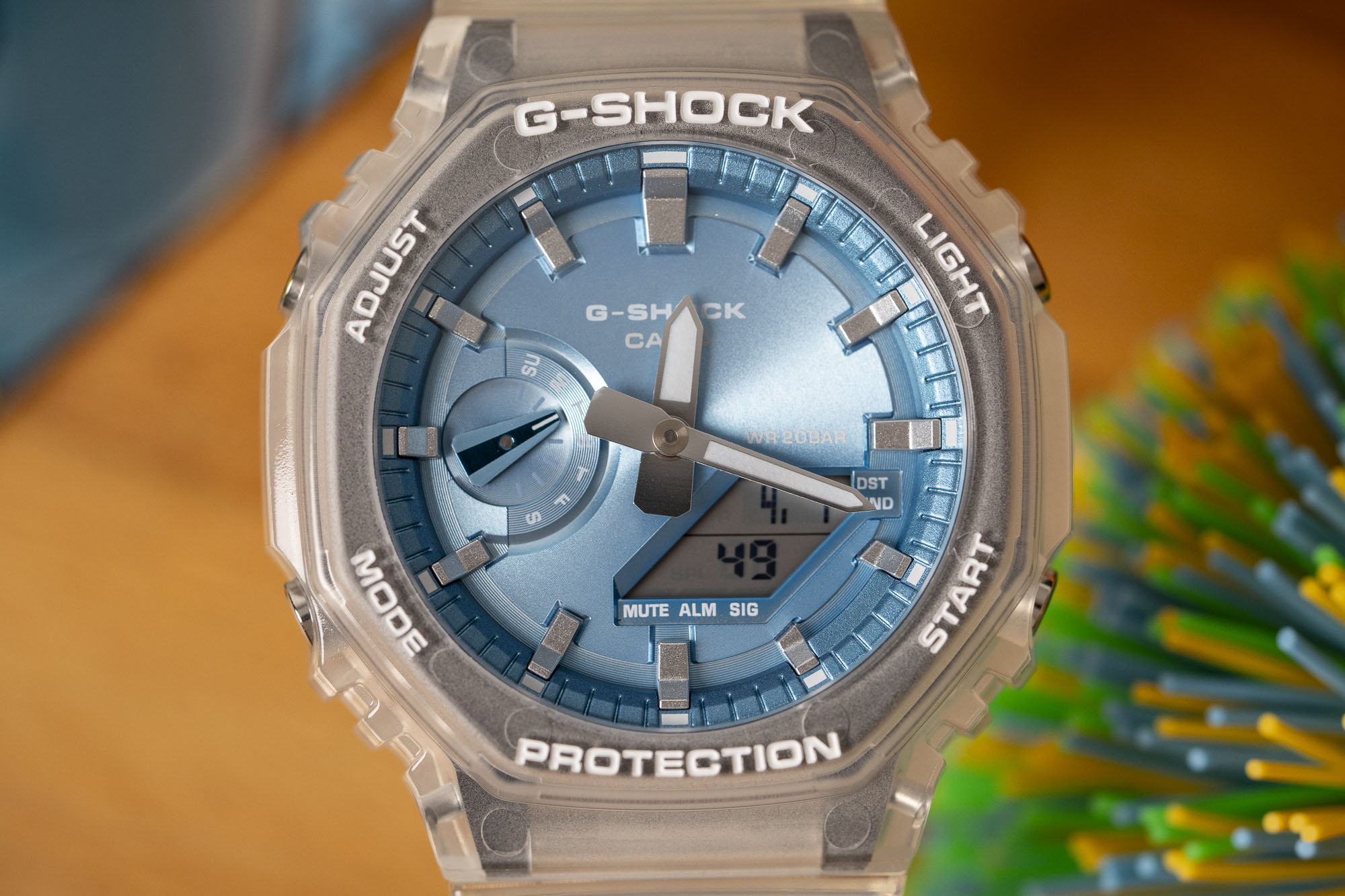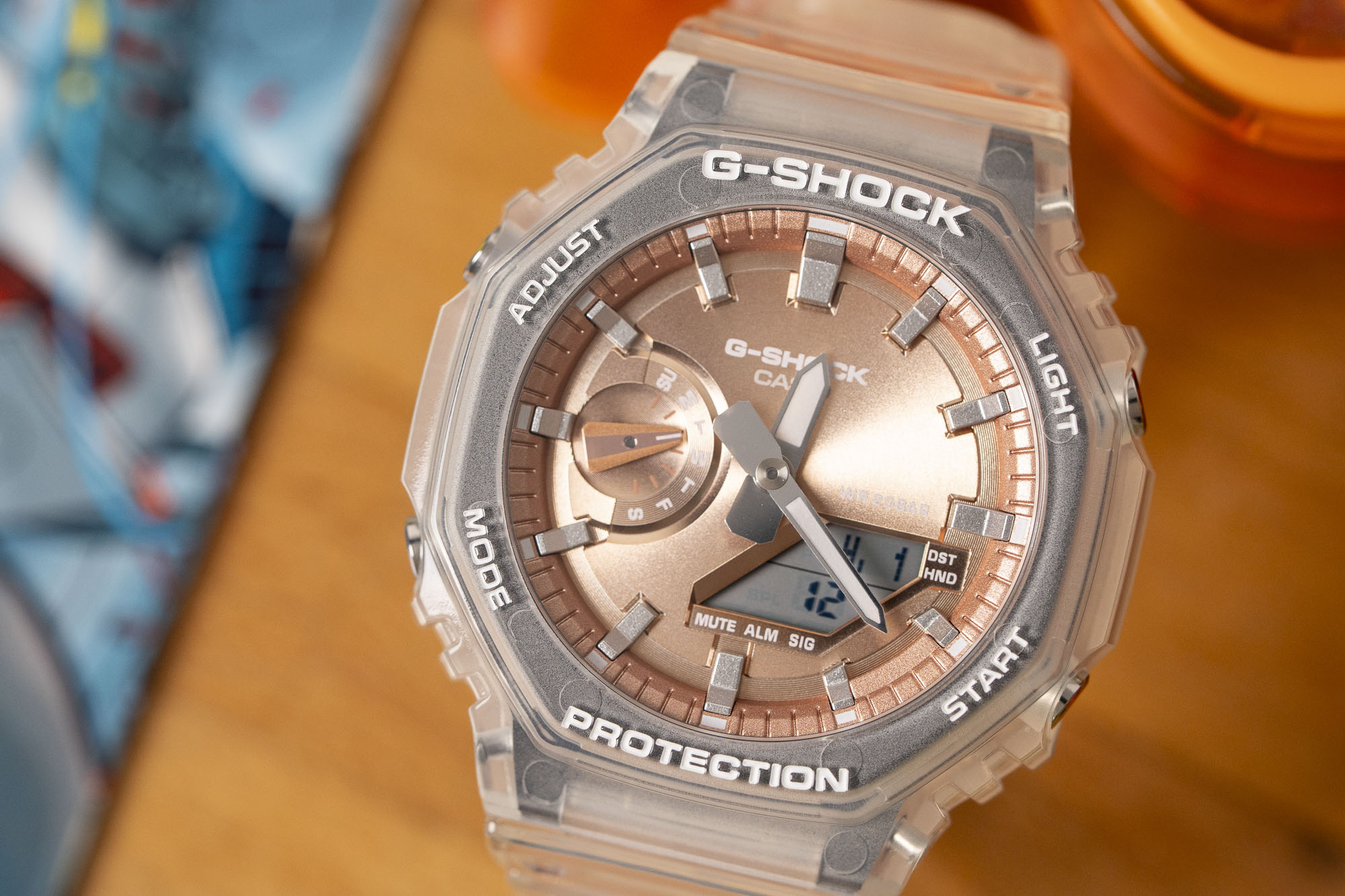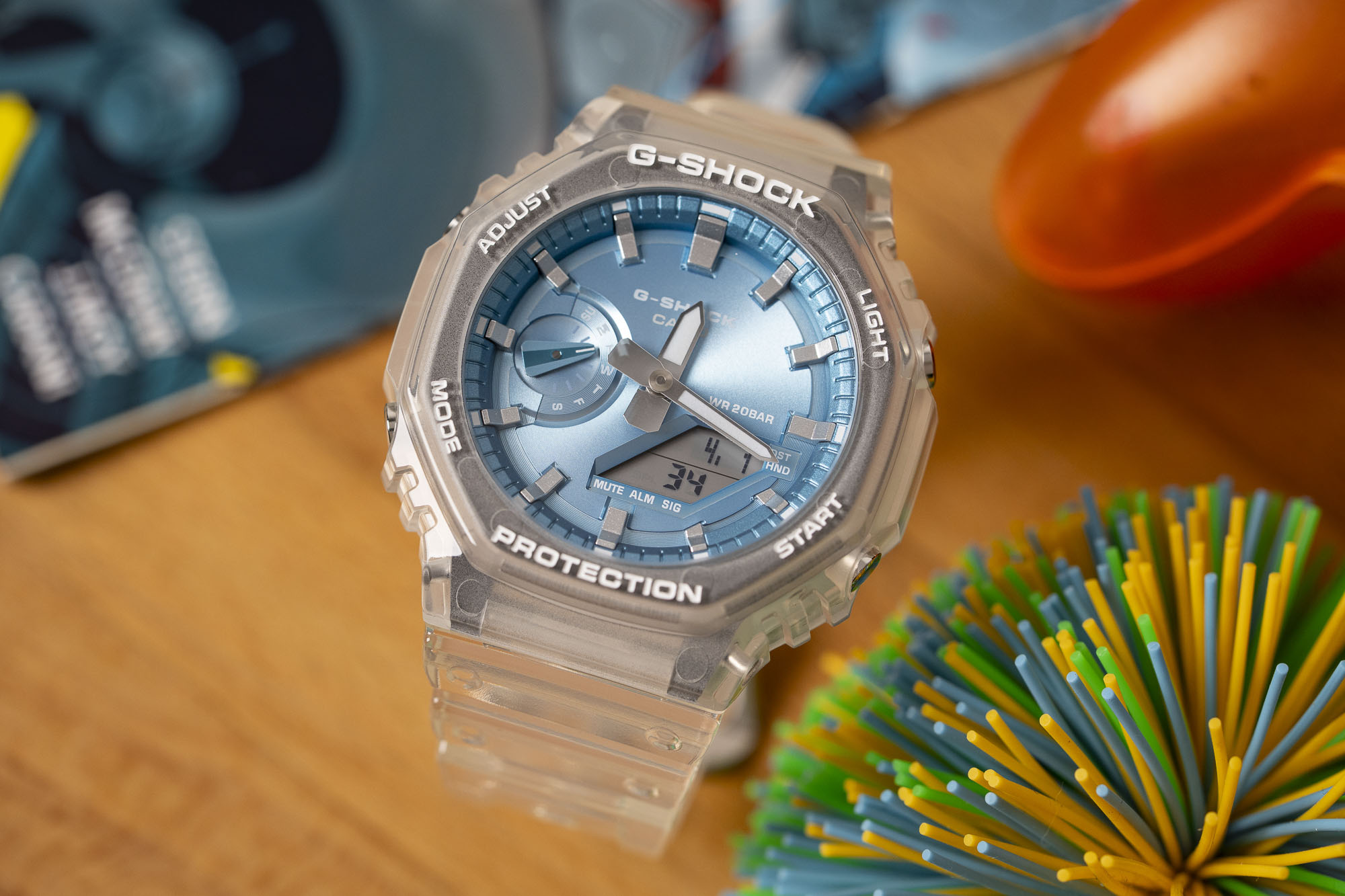 The Bright Metallic Collection is built around the 2100-series’ 45.4mm case, featuring a clear resin case over the watch’s Carbon Core Guard construction for style and durability. This 200m water resistant tool watch is further accented by its three metallic dial offerings — Silver, Ice Blue, and Salmon — each offering a unique take on the rugged G-SHOCK formula. All three variants are fitting on a matching clear resin strap for comfort and durability.