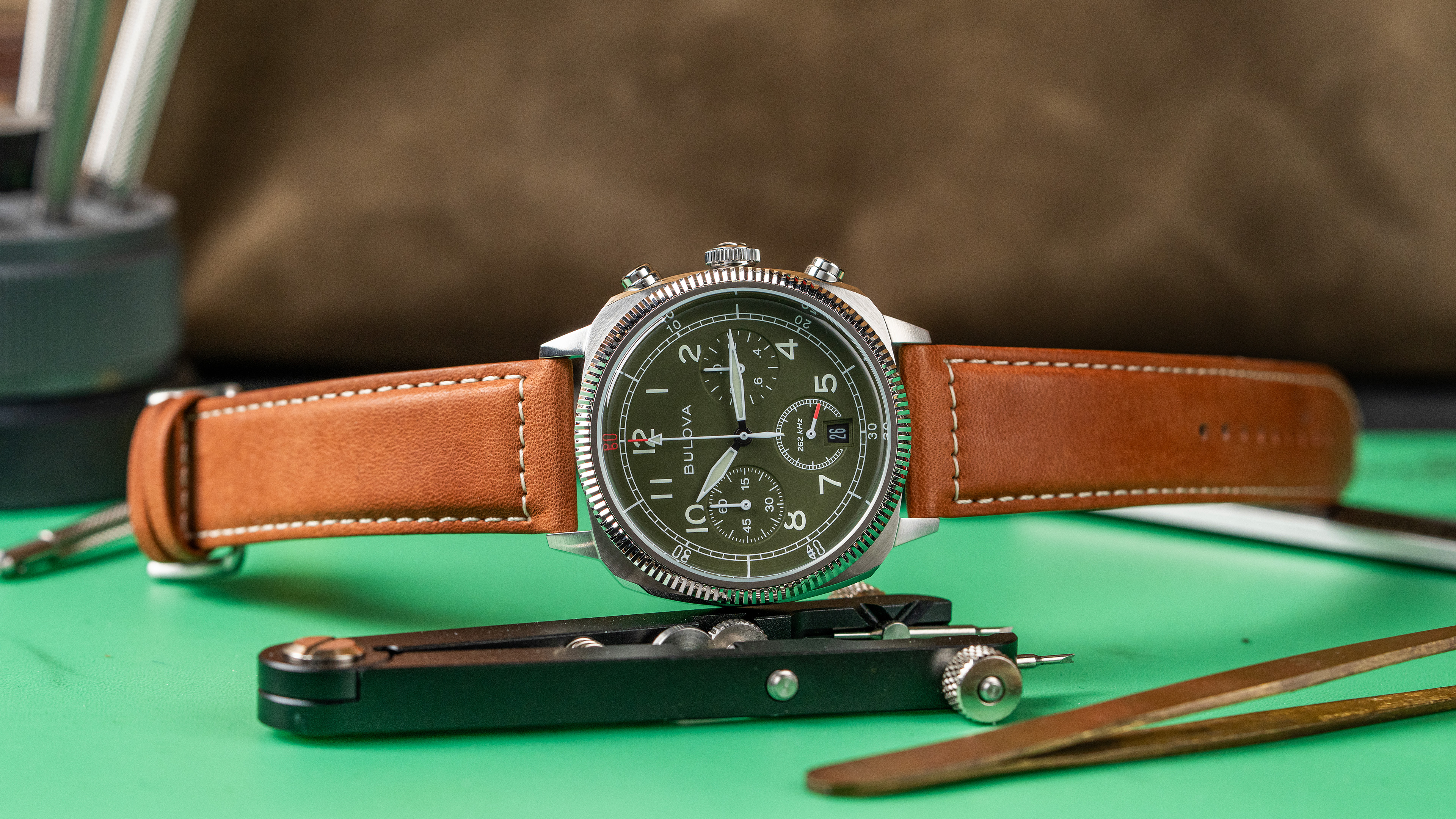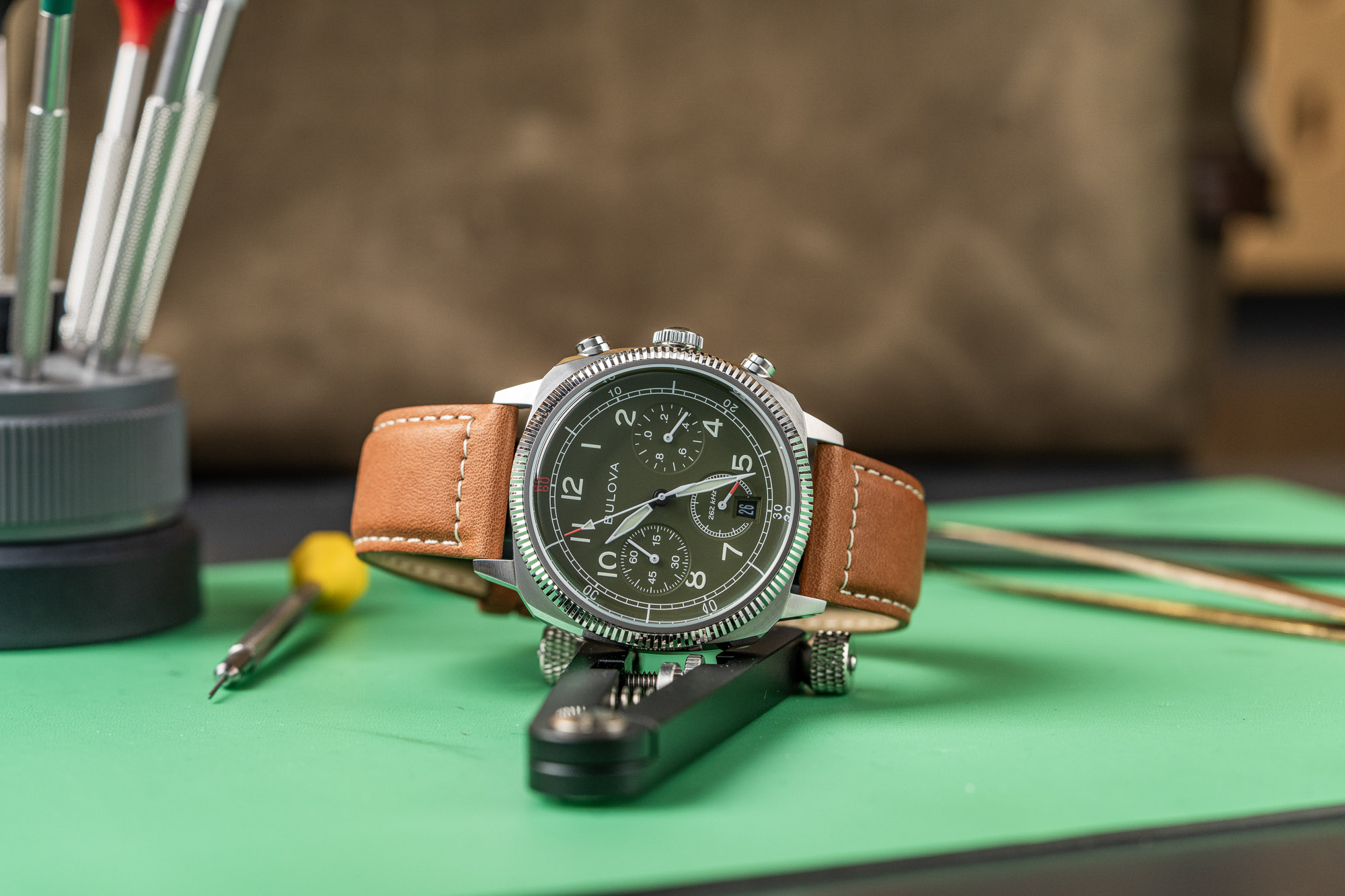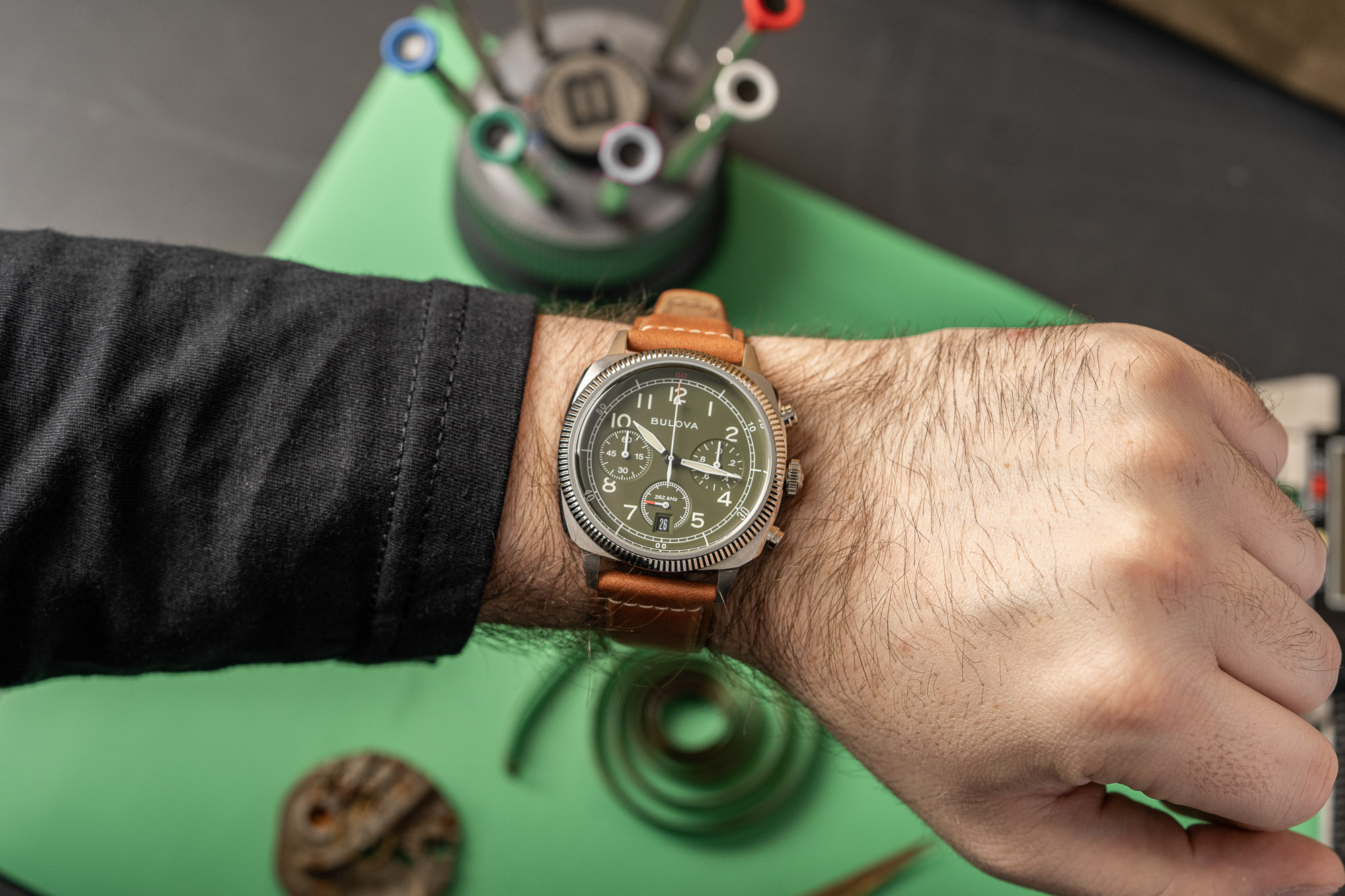 The Bulova Military VWI Special Edition Chronograph (96B482) is a collaboration with the Veteran Watchmaker’s Initiative (VWI), a specialized school that teaches U.S. military veterans the technical craft of watchmaking. This project serves as a tribute to Bulova’s history as a supplier to the U.S. Armed Forces, with 10% of the proceeds from every sale donated to the VWI to fund student education and future career opportunities. The design is directly inspired by 1940s-era military field chronographs, emphasizing functional, mission-oriented aesthetics.