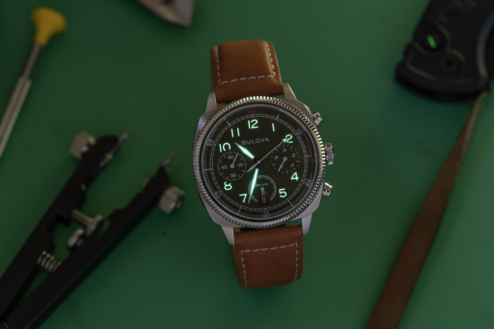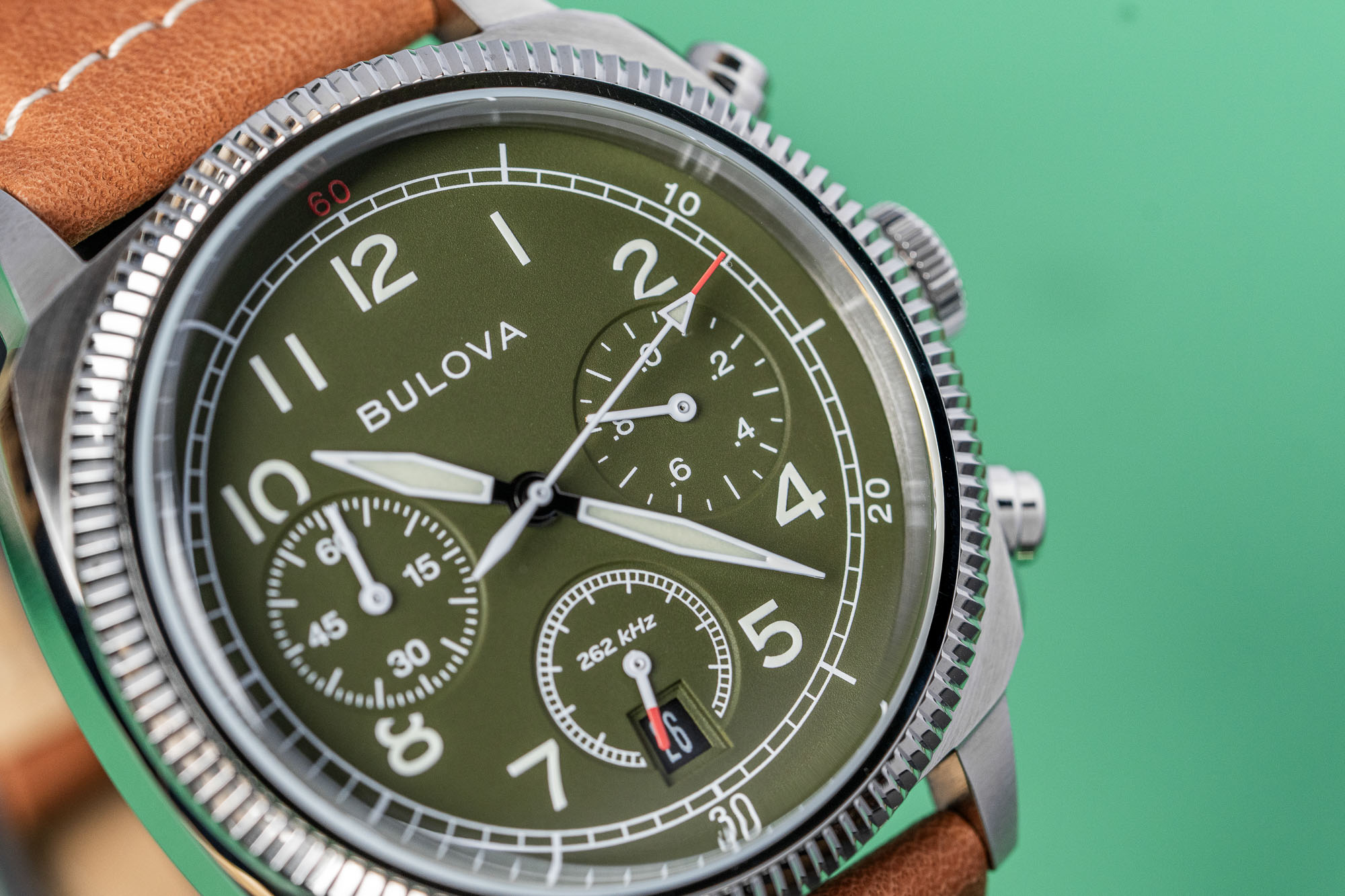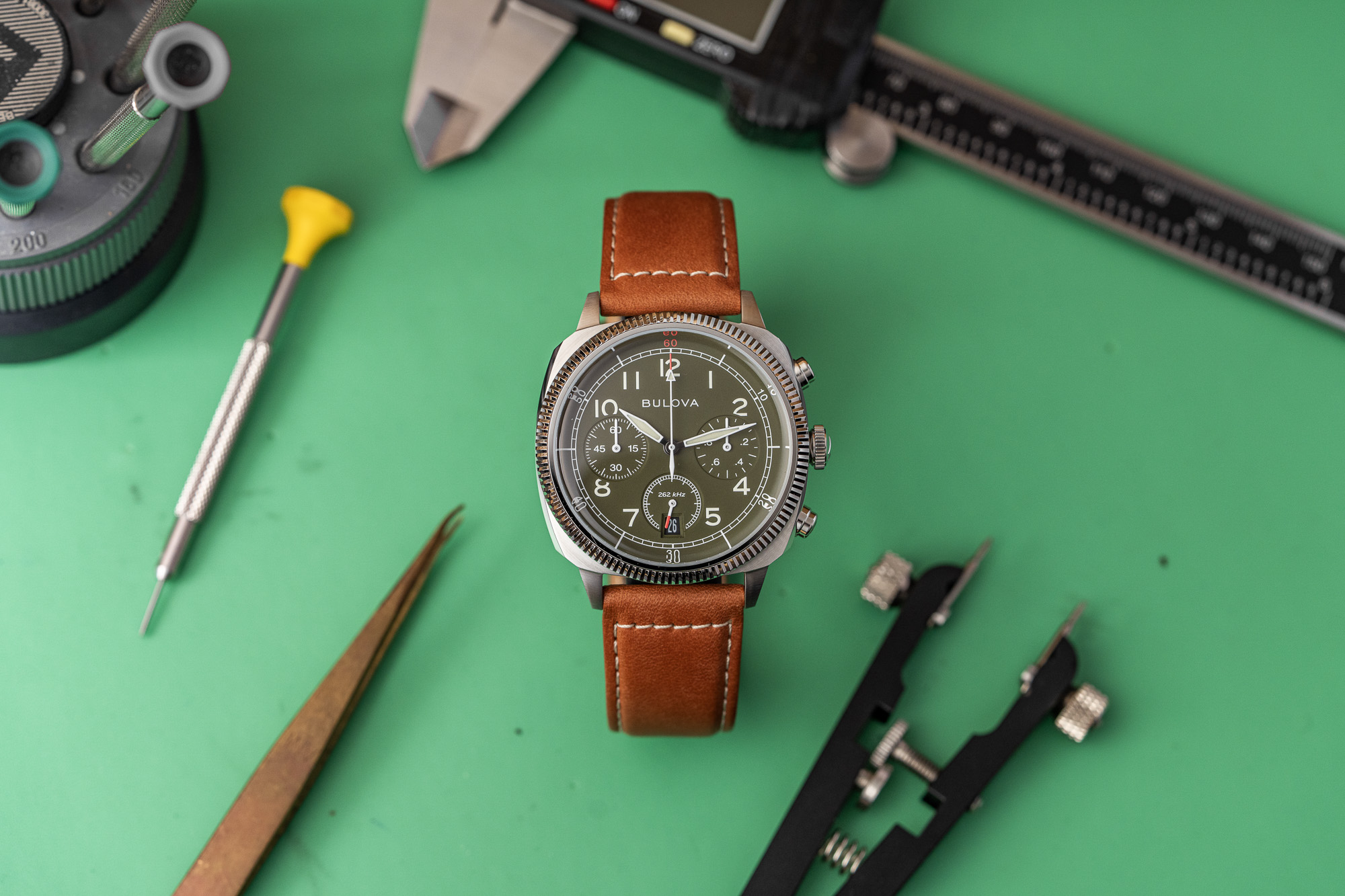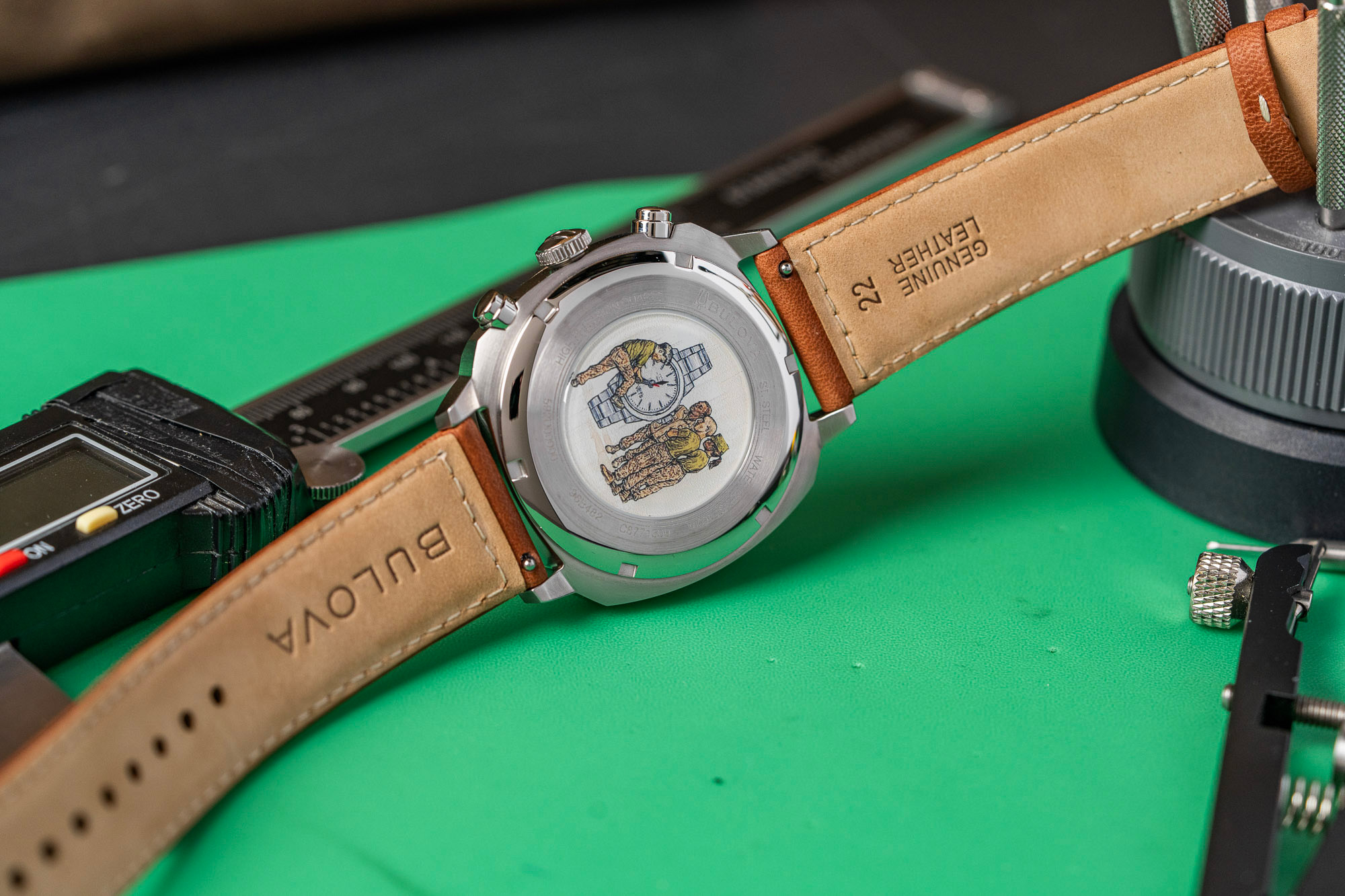 Internally, the timepiece is powered by Bulova’s proprietary High-Performance Quartz movement, which operates at a frequency of 262 kHz. This frequency is eight times higher than standard quartz, allowing for seconds-per-year accuracy and a smooth, continuous sweep of the chronograph hand. The six-hand movement provides precise measurement of elapsed time and includes a discreet date window. A solid screw-down caseback ensures the watch remains sealed and features a custom engraving honoring the partnership with the VWI.