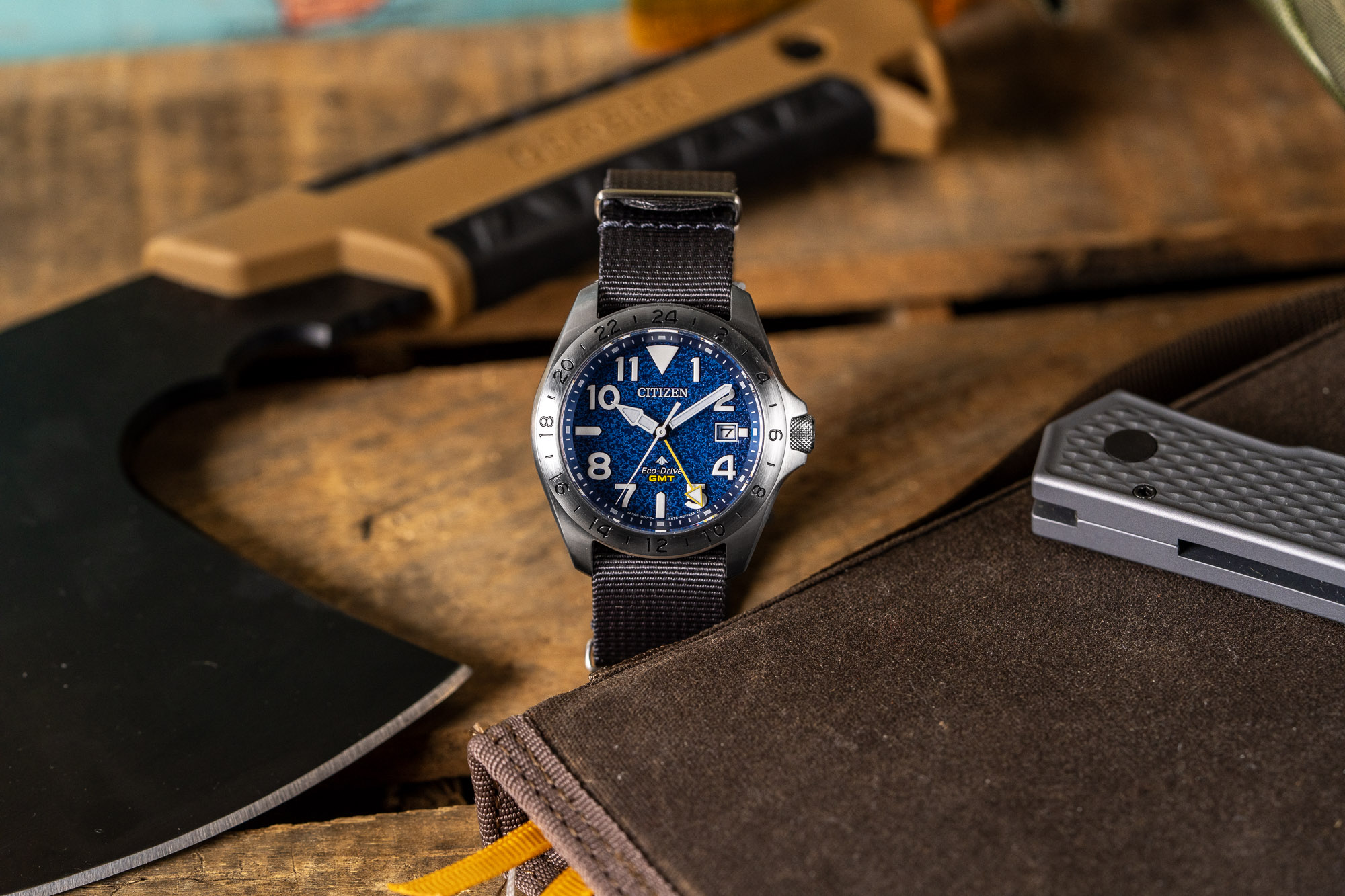 The Citizen Promaster Land GMT is a travel-oriented tool watch built with a focus on field-ready durability and practical functionality. It features a high-contrast dial with a fixed 24-hour GMT bezel, allowing the wearer to track a second time zone alongside local time. The dial is protected by an anti-reflective domed sapphire crystal, and the watch is engineered to meet ISO standards for water resistance up to 200 meters. Available in two distinct executions, the BJ7150-50W features a textured red dial on a stainless steel bracelet, while the BJ7150-09L offers a navy blue dial paired with a durable grey nylon strap.