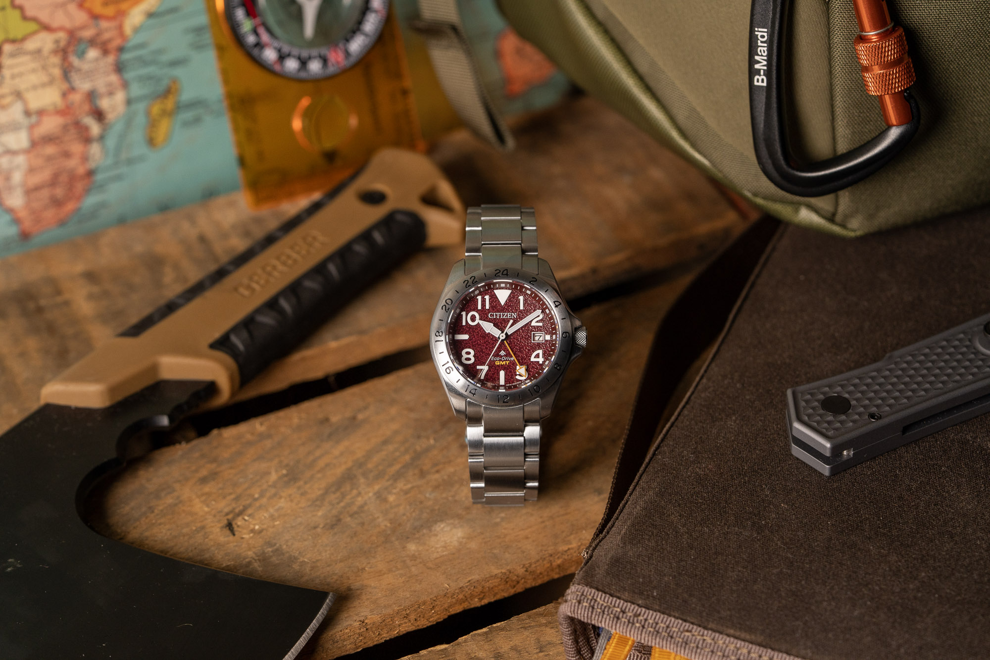 The watch is powered by the Eco-Drive Caliber B877 (or B878), a light-powered GMT movement that eliminates the need for battery replacements. This is a "traveler" or "flyer" GMT, which allows for the independent adjustment of the local hour hand in one-hour increments without stopping the movement. The system provides approximately 6 to 9 months of power reserve on a full charge and includes a date window at the 3 o'clock position. Every model arrives in the signature Promaster "tackle box" packaging, emphasizing its intent as an expedition-ready instrument.