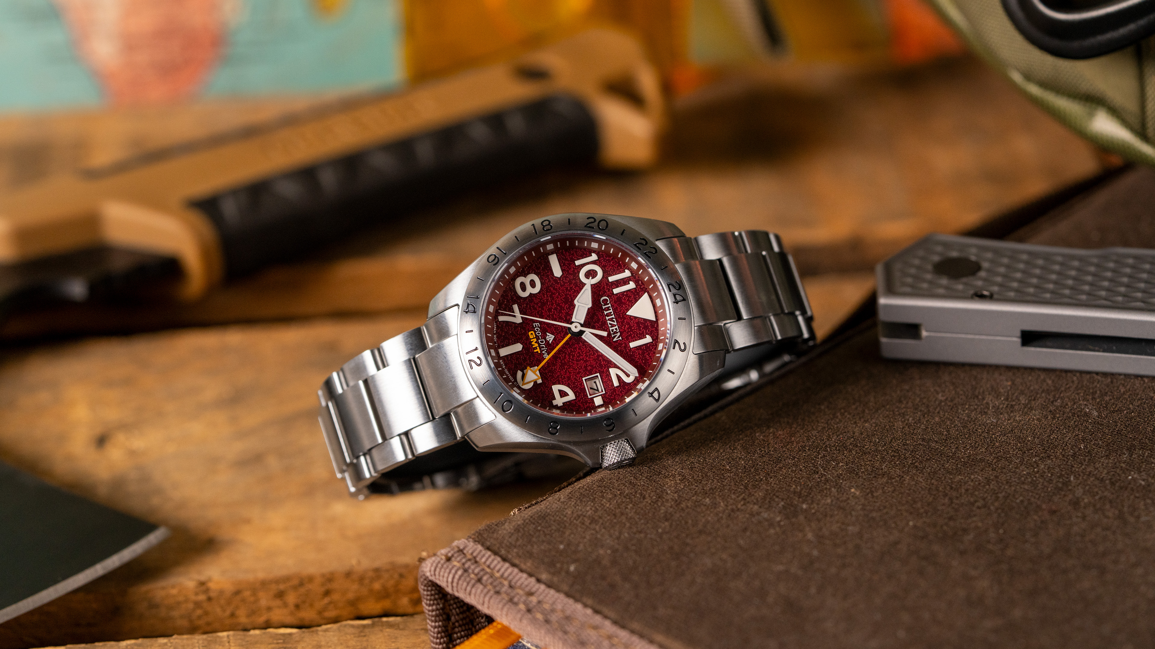The Citizen Promaster Land GMT is a travel-oriented tool watch built with a focus on field-ready durability and practical functionality. It features a high-contrast dial with a fixed 24-hour GMT bezel, allowing the wearer to track a second time zone alongside local time. The dial is protected by an anti-reflective domed sapphire crystal, and the watch is engineered to meet ISO standards for water resistance up to 200 meters. Available in two distinct executions, the BJ7150-50W features a textured red dial on a stainless steel bracelet, while the BJ7150-09L offers a navy blue dial paired with a durable grey nylon strap.