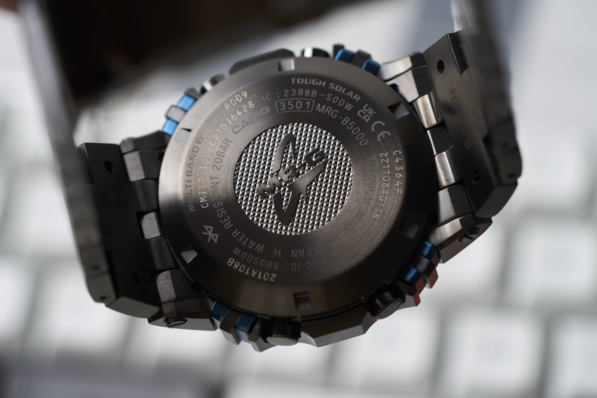 Internally, the MRG-B5000D-1 and MRG-B5000B-1 also receive the very best that G-SHOCK has to offer, and powering them is the advanced 3501 module. In addition to all of the usual features you’d expect to find on a multi-function digital watch such as an alarm, countdown timer, stopwatch, and world time feature, the 3501 module also offers solar charging, radio-controlled time calibration, Bluetooth pairing to your smartphone for use with the G-SHOCK app, and a gold-plated circuit board retainer plate to reduce electrical resistance.