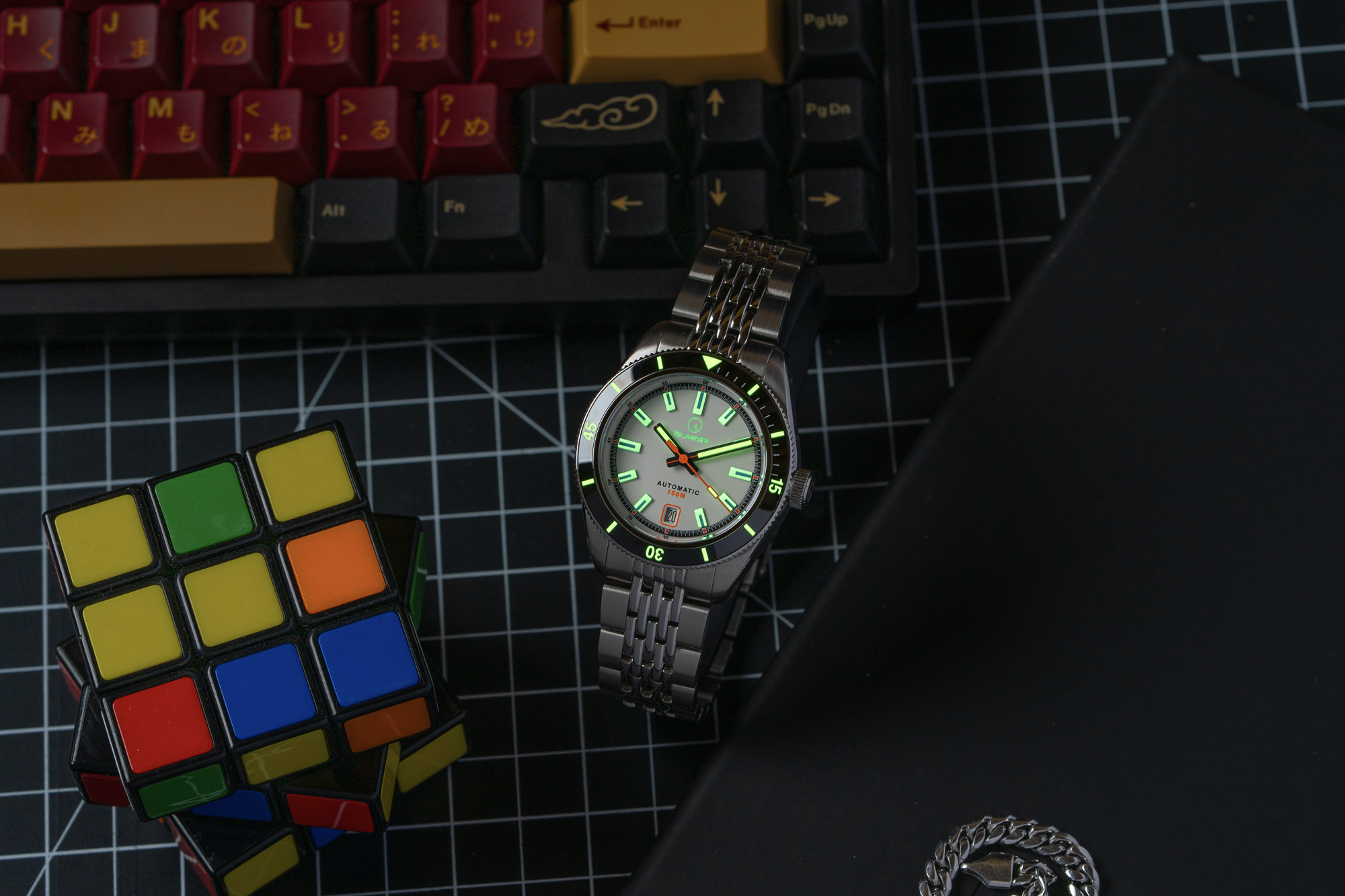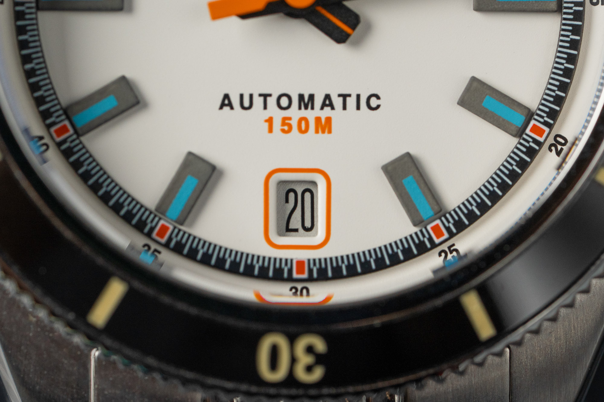 Powering the watch is the Miyota 9015 automatic movement, which operates at 28,800 vibrations per hour for a smooth seconds hand motion. The dial is covered by a single-domed sapphire crystal with an internal anti-reflective coating to reduce glare. With a screw-down crown and embossed caseback, the watch is rated for 150 meters of water resistance, providing sufficient protection for recreational diving.