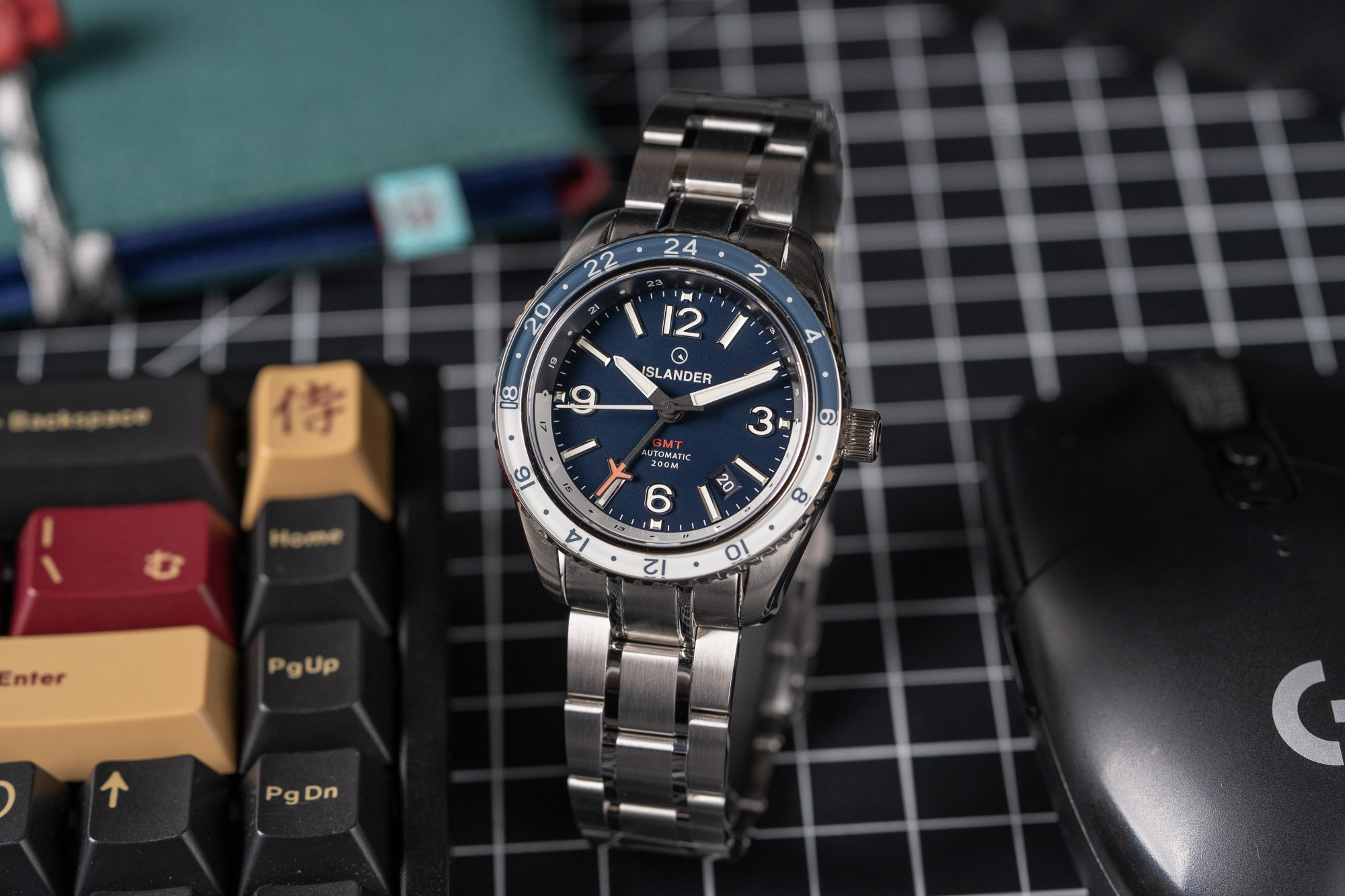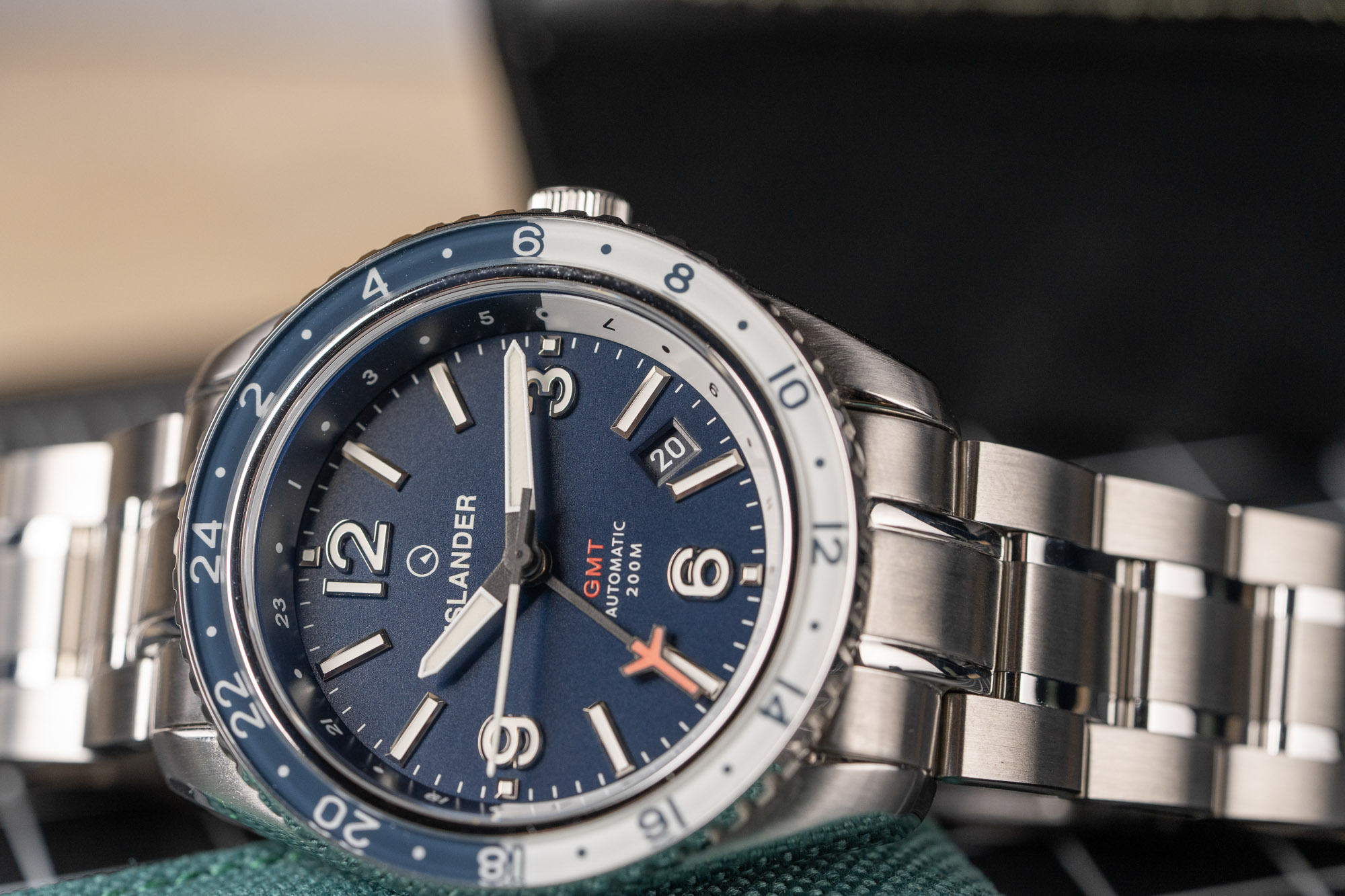 The Islander Republic Traveler GMT is a versatile timepiece that combines the functionality of a pilot's GMT with the build quality of a recreational dive watch. It features a blue dial with large applied Arabic numerals at 12, 3, 6, and 9, alongside aviator-style hands and a dedicated GMT hand with a red "airplane" tip. The watch uses a bi-directional sapphire bezel and a 24-hour chapter ring, allowing the wearer to track up to three time zones simultaneously. A color-matched date window is positioned between 4:00 and 5:00 to maintain dial symmetry.