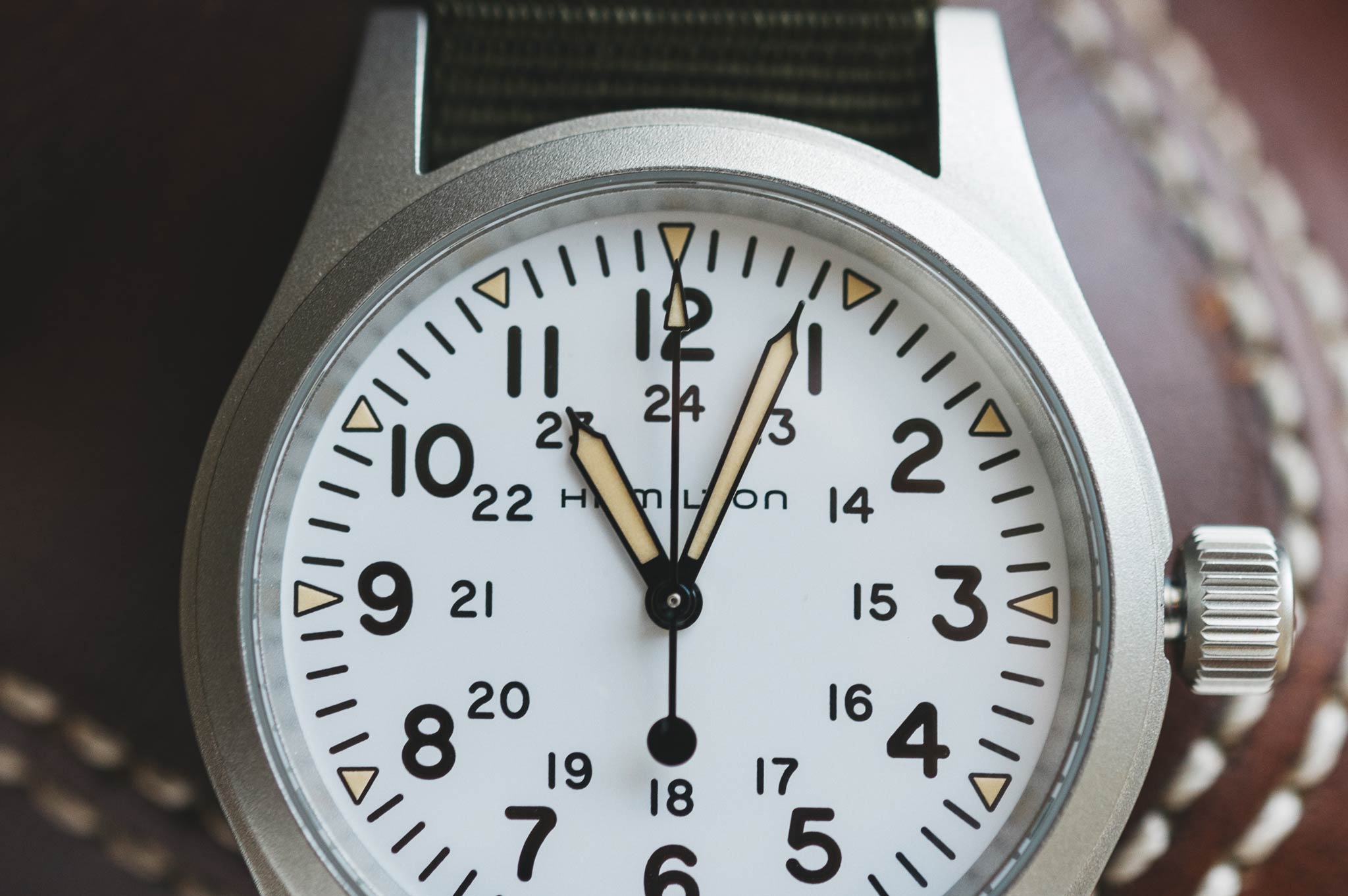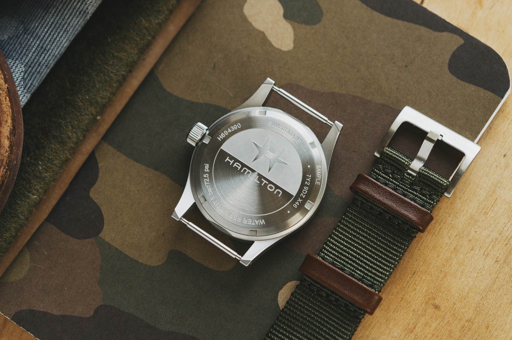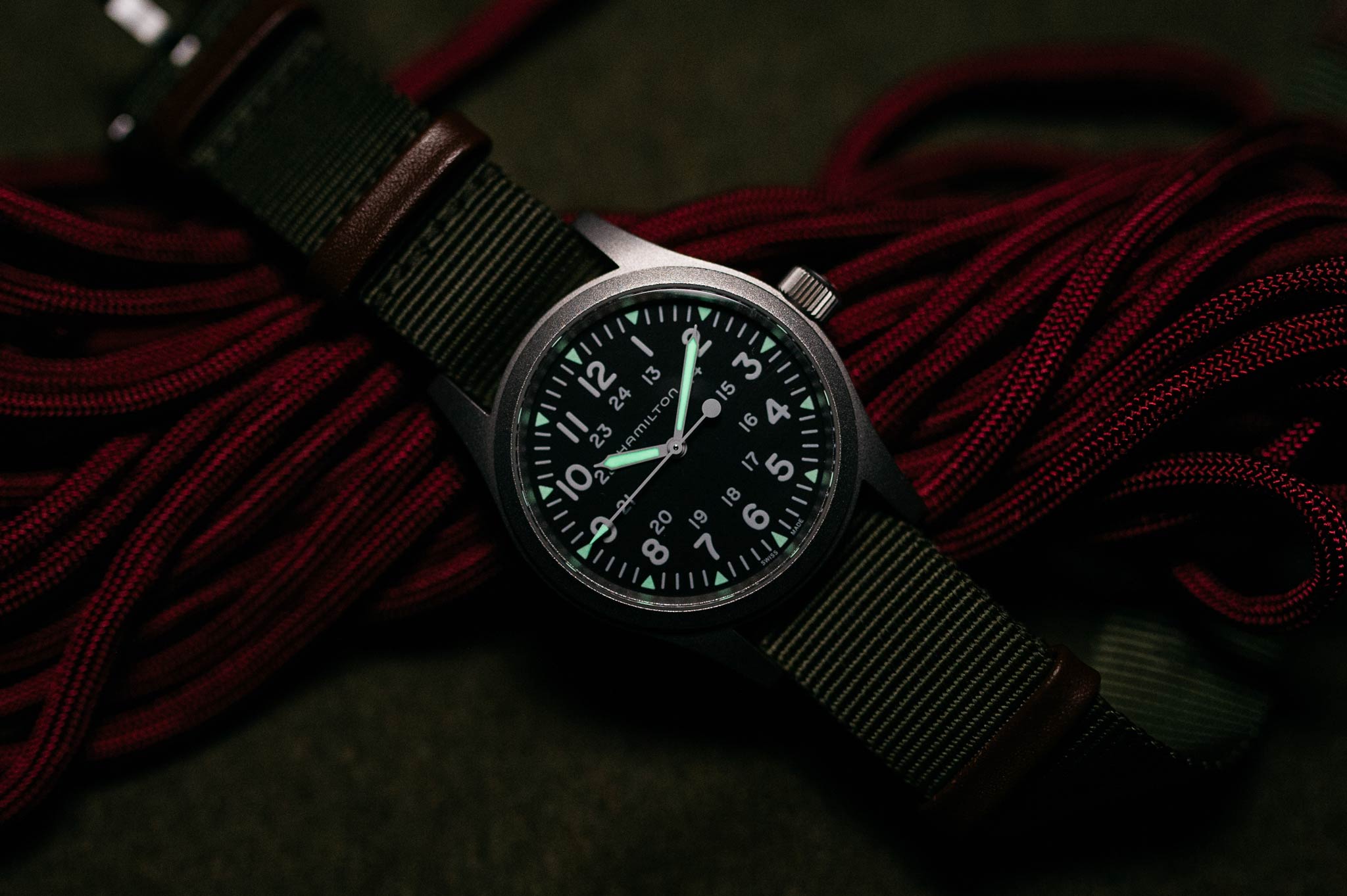 Powering the Khaki Field Mechanical is the H-50 Swiss-made caliber*. This handwound movement features 17 jewels, hacking seconds, a frequency of 21,600 bph, and most notably, a power reserve of 80 hrs. The ideal movement for this watch, it combines the nostalgia of a hand-wound movement with an extended power reserve for modern convenience.