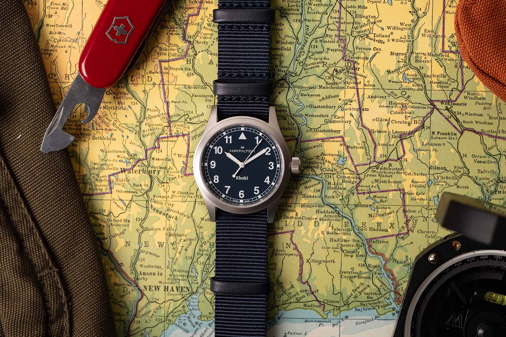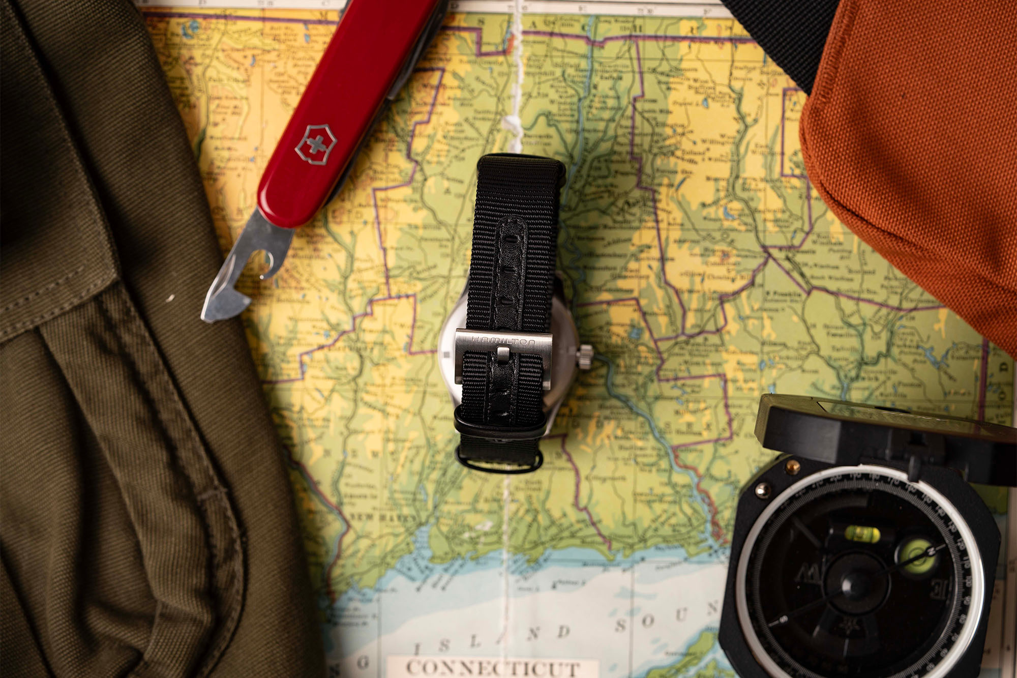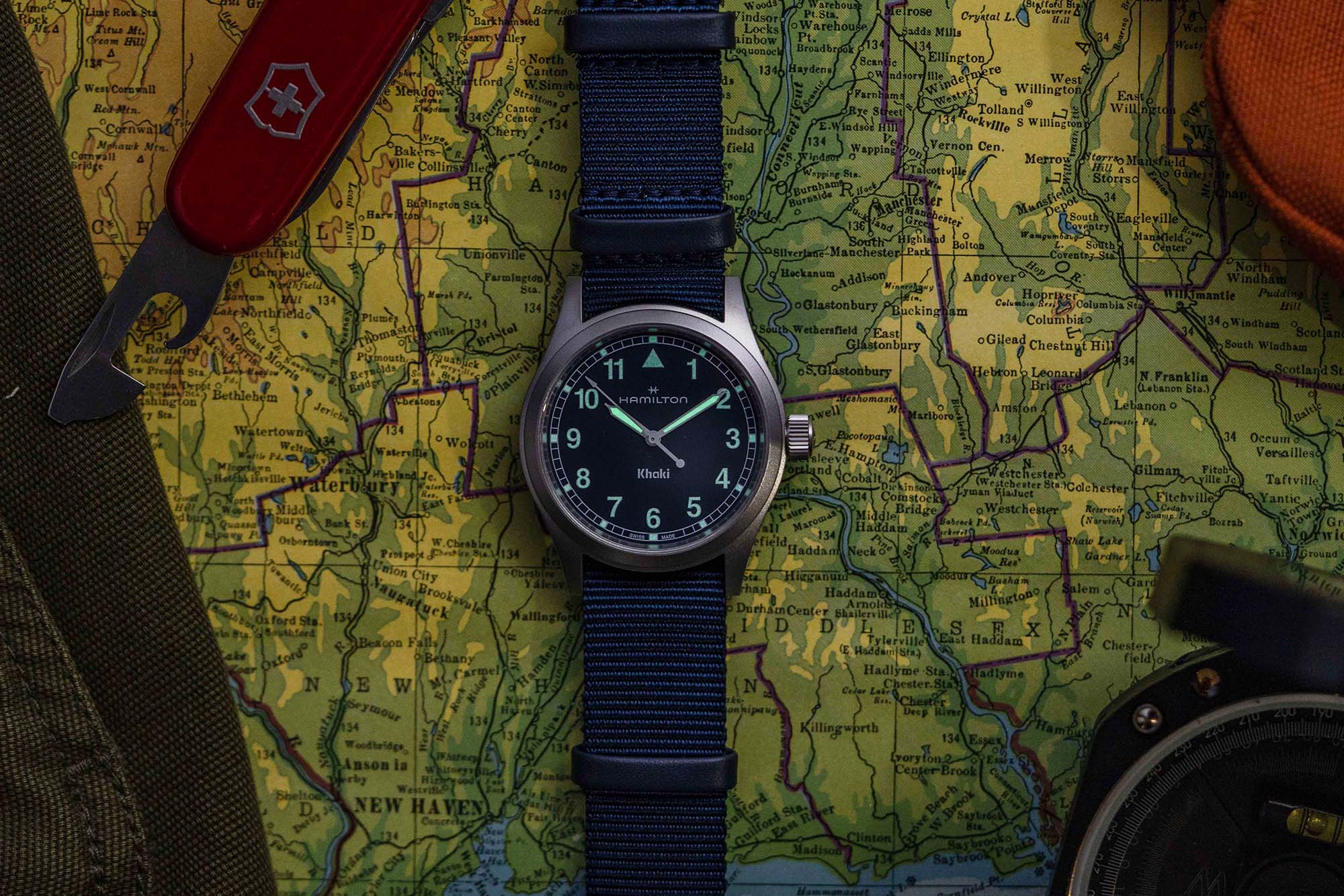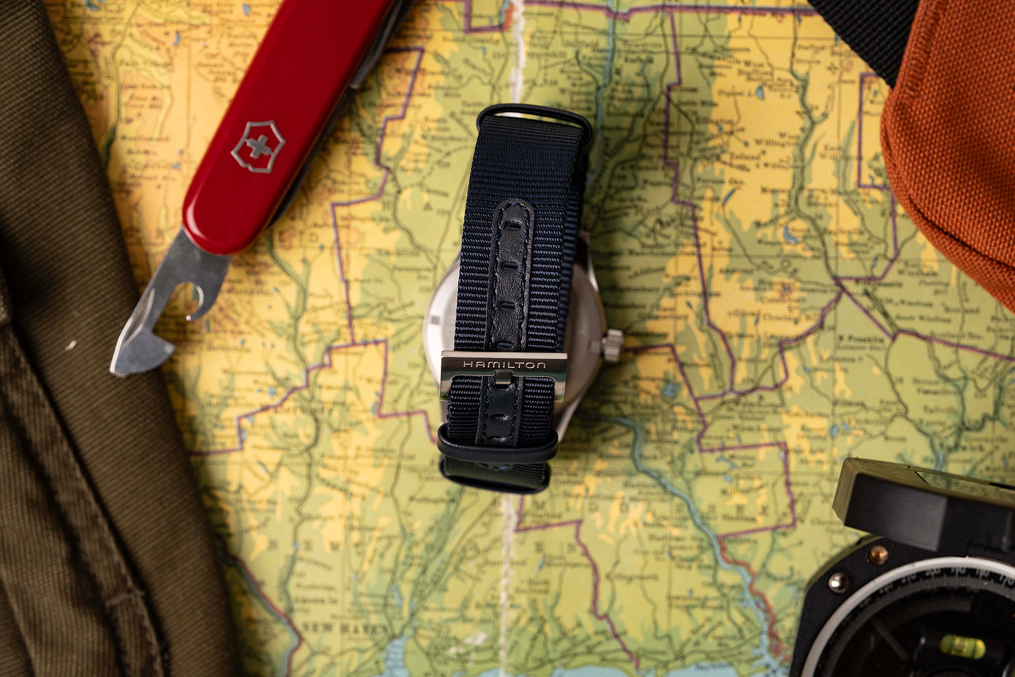 The Khaki Field Quartz is powered by ETA’s F06.105 caliber, a 3-jewel quartz movement with hacking and an end-of-life indicator. There are two black dials, one white, and one blue variant. Each is equipped with a rugged nylon pull-through strap in a complementary color.