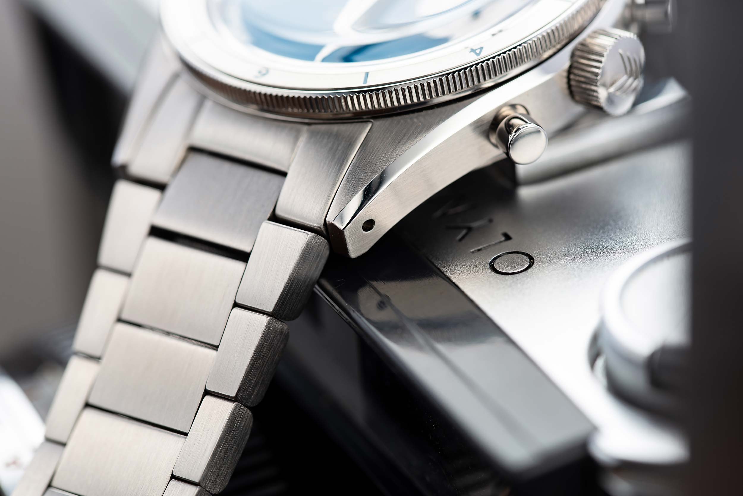 To give the collaboration an exotic attitude, the dial surface is rendered in gloss Cerulean blue, while the sub-dial and chapter ring are white. This bright hue is somewhere between Mediterranean and Shelby blue, giving the Gemini a bold, but tasteful presence.