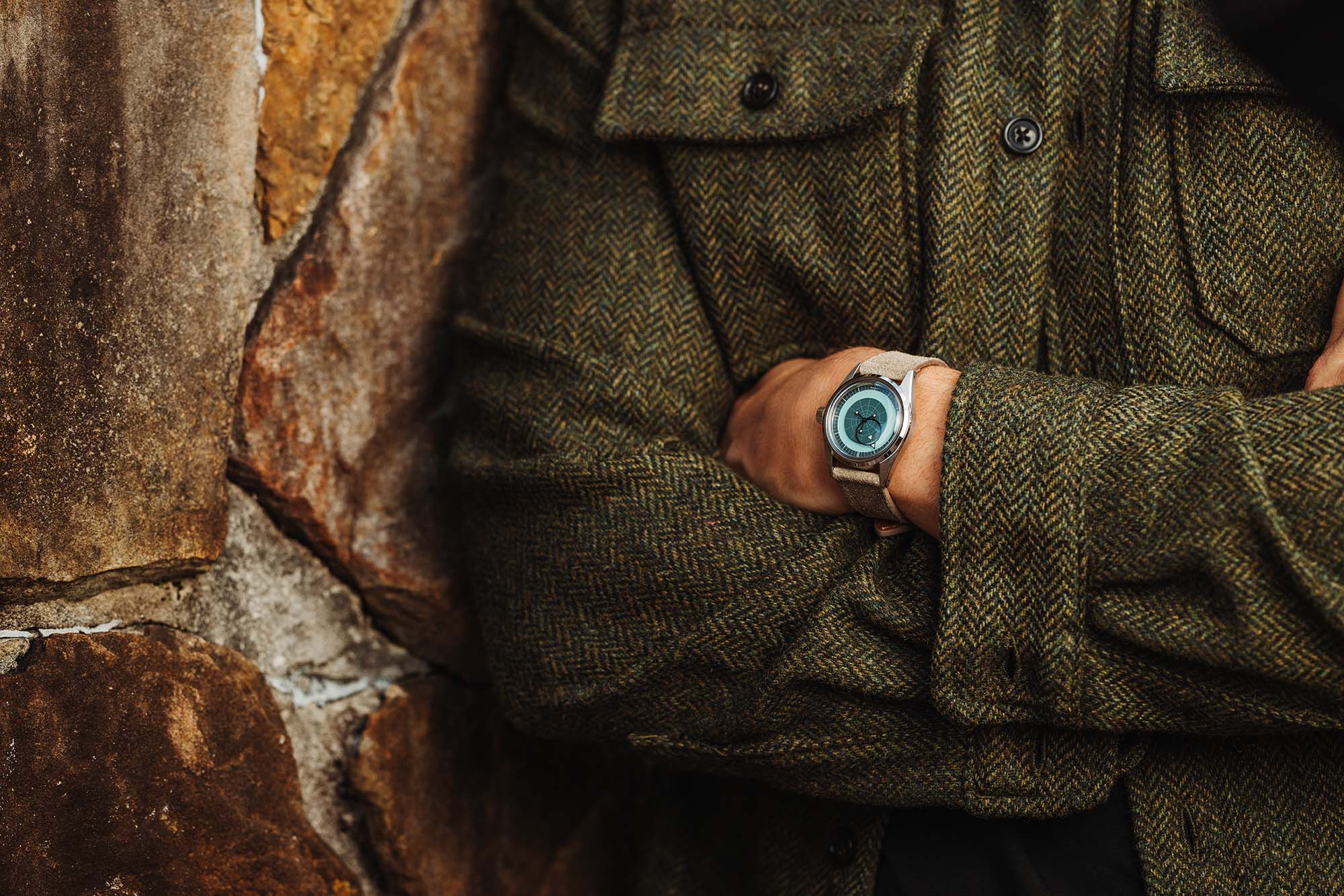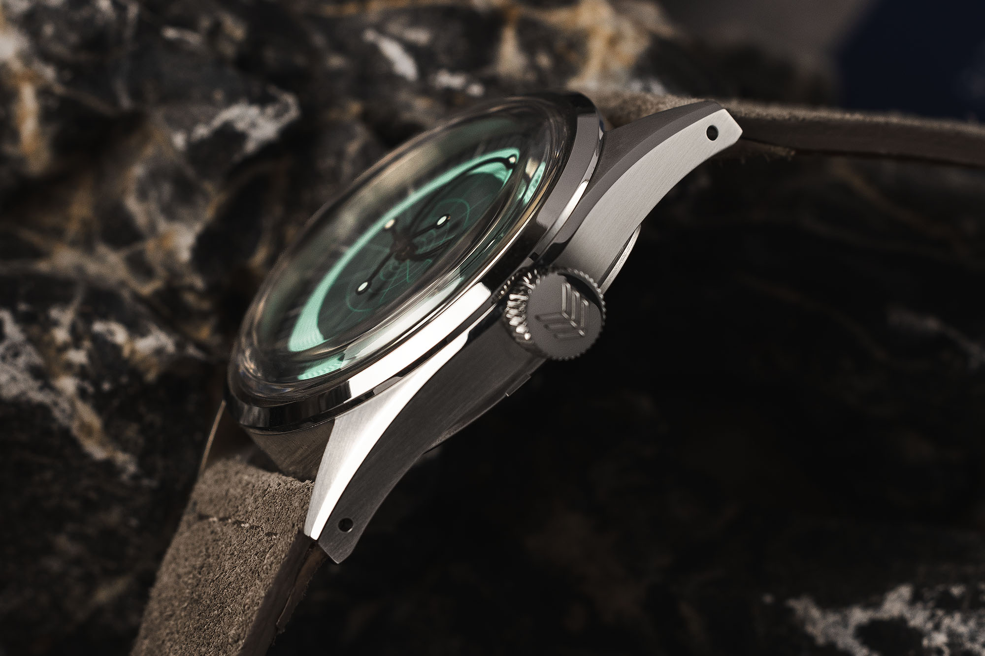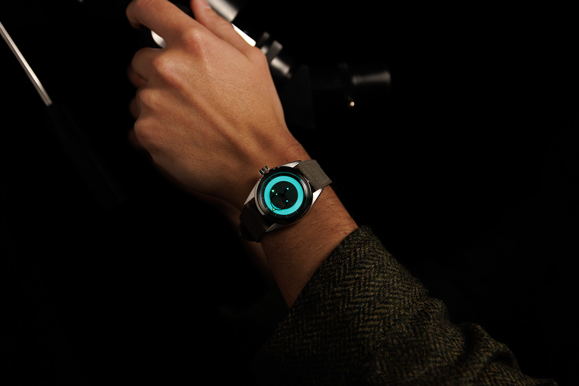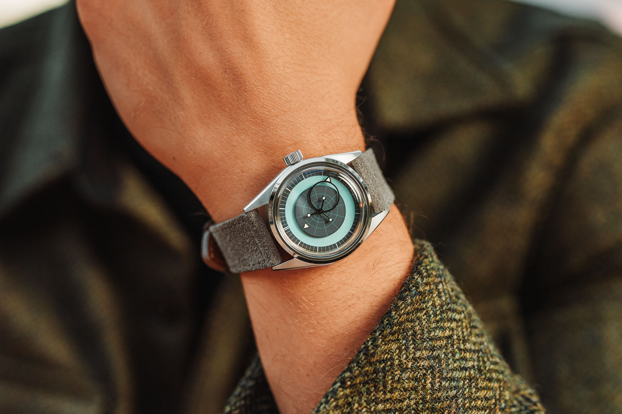 The 36mm by 44mm by 11mm stainless steel case is mounted on a gray suede strap with a subtle, warm tone. On the wrist, it combines the charm of a vintage timepiece with the allure of sci-fi. Inside is the Miyota 90S5 caliber, beating away at 28,800 bph. Thin and reliable, the 9015 is a perfect engine for this spacetime observer.