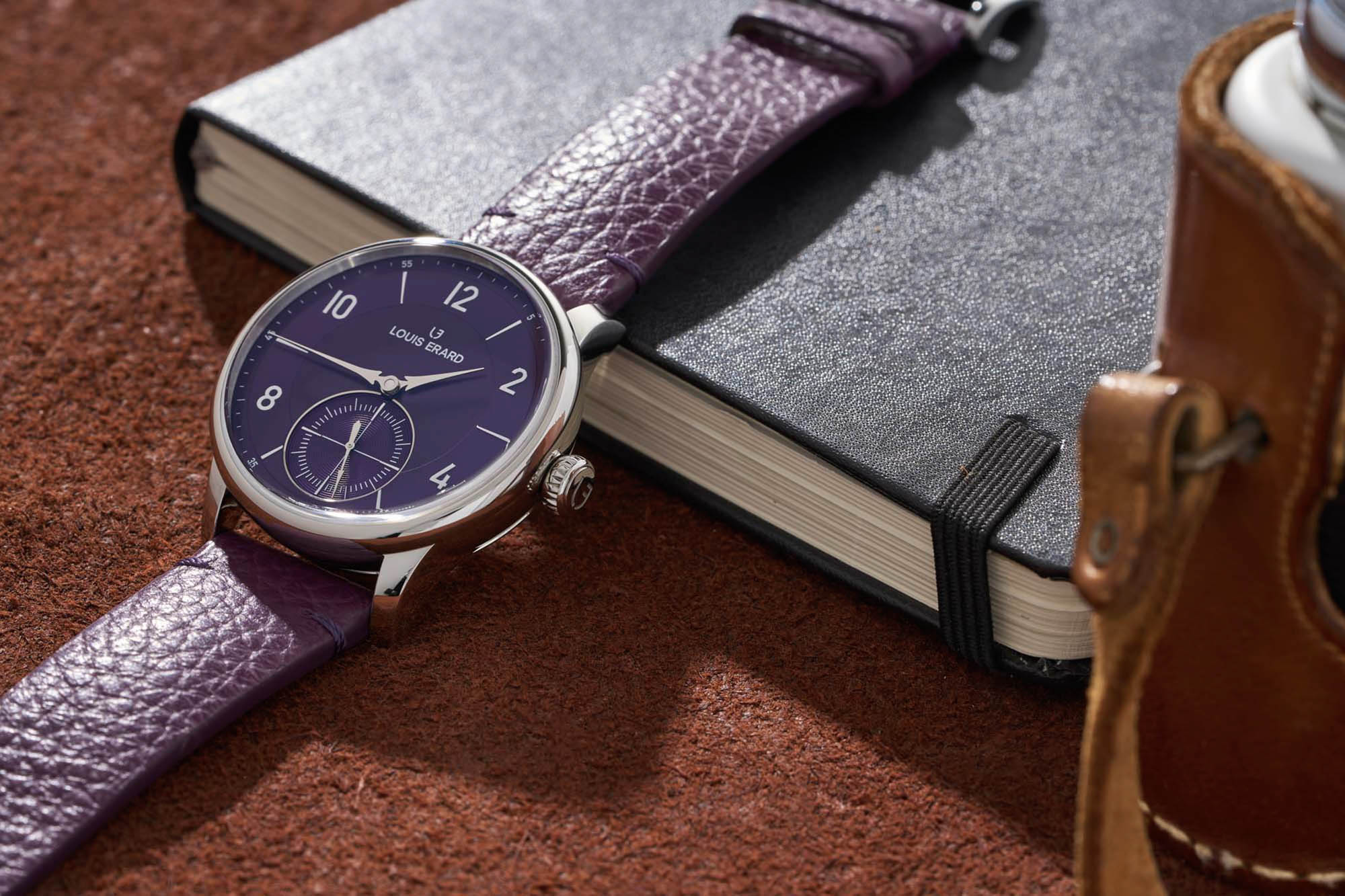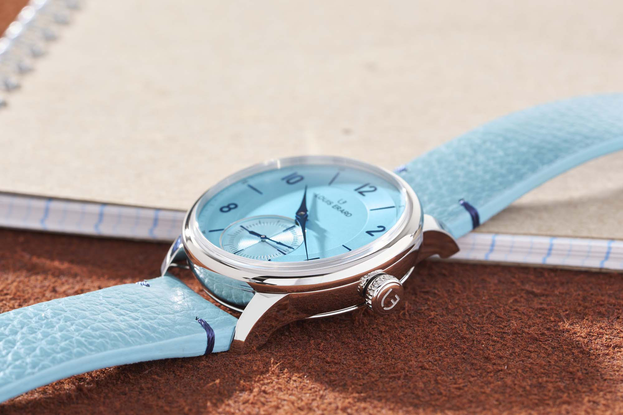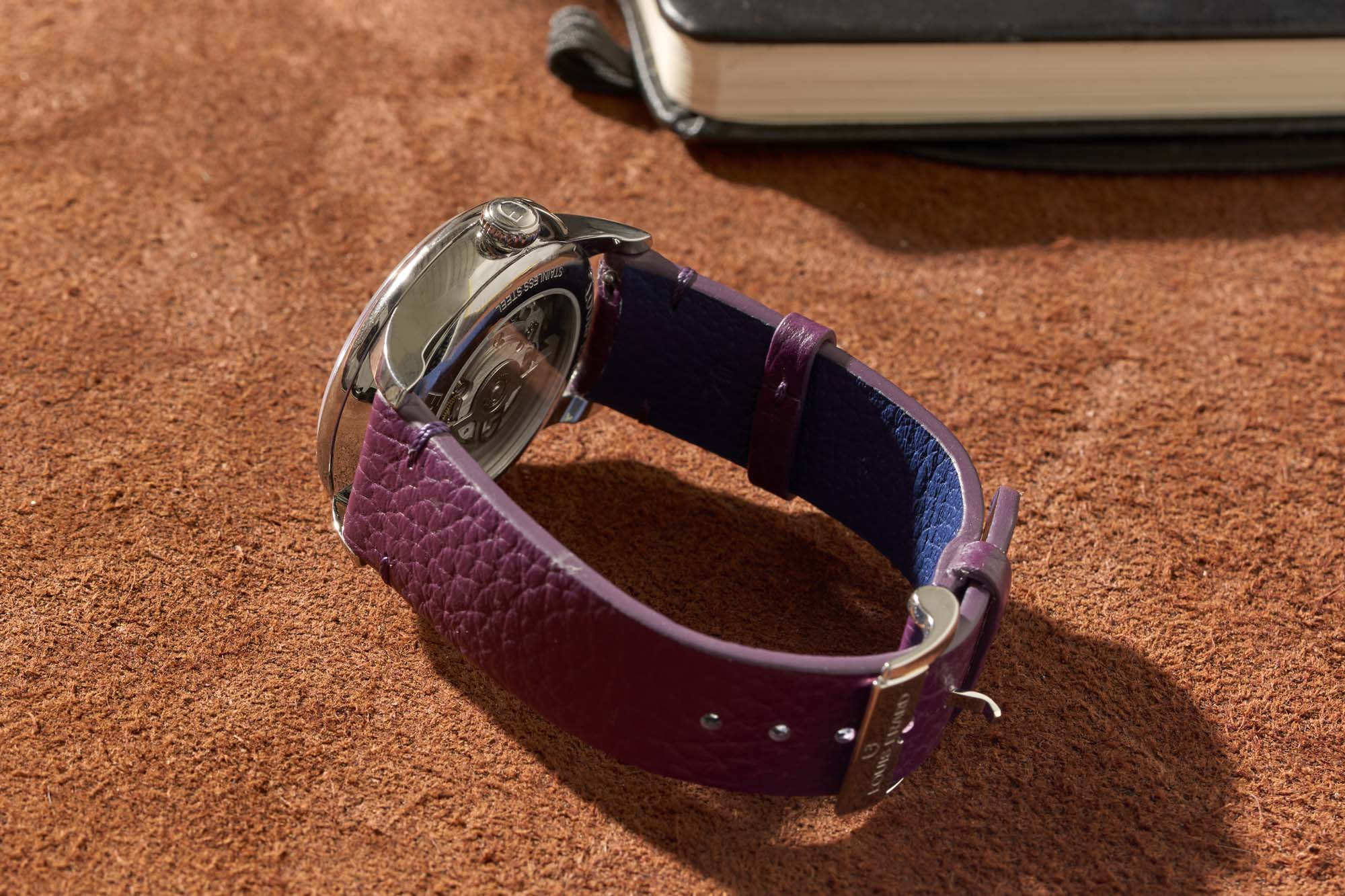 The Excellence Petite Secondes is available in four standout colors: Glacier Blue, Violet, Night Blue, and Terra Cotta. Glacier Blue is bright and energetic. Paired with blued numerals and hands, it’s an icey vision. Violet is exotic and unexpected, a vibrant purple for those who want to stand out. Night Blue is handsome and mysterious, a classic and versatile combination. Terracotta, which rides the line between “Salmon” and an earthier tone, is rich and welcoming. The color is complemented with dark numerals and hands. All versions feature 20mm leather straps in coordinated colors.