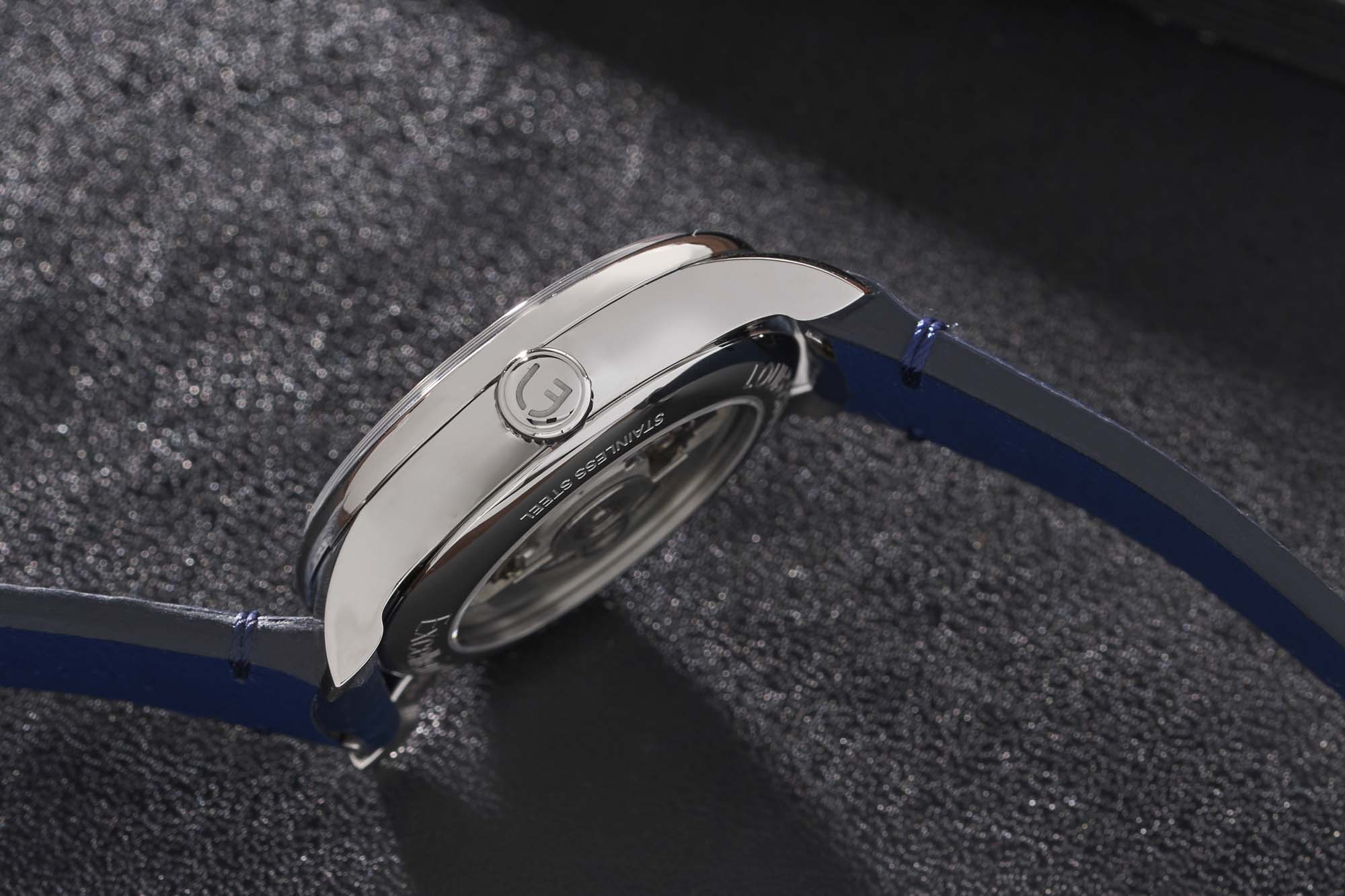 The 39mm case is fully polished and features a large dial opening and rounded sides for an elegant but modern style. Thanks to the fully rounded shape, the watches wear smaller than the diameter would suggest and look thinner as well.