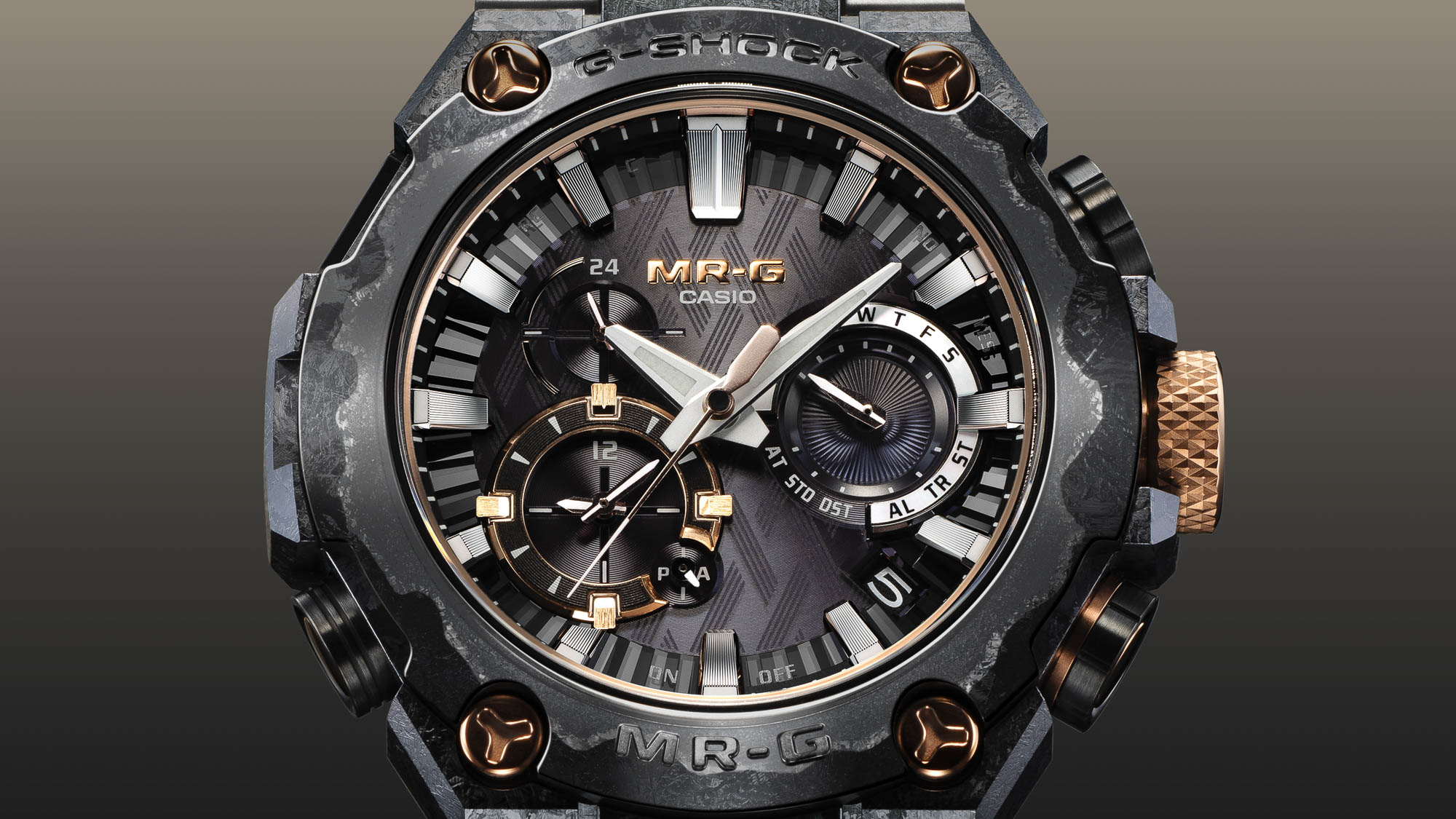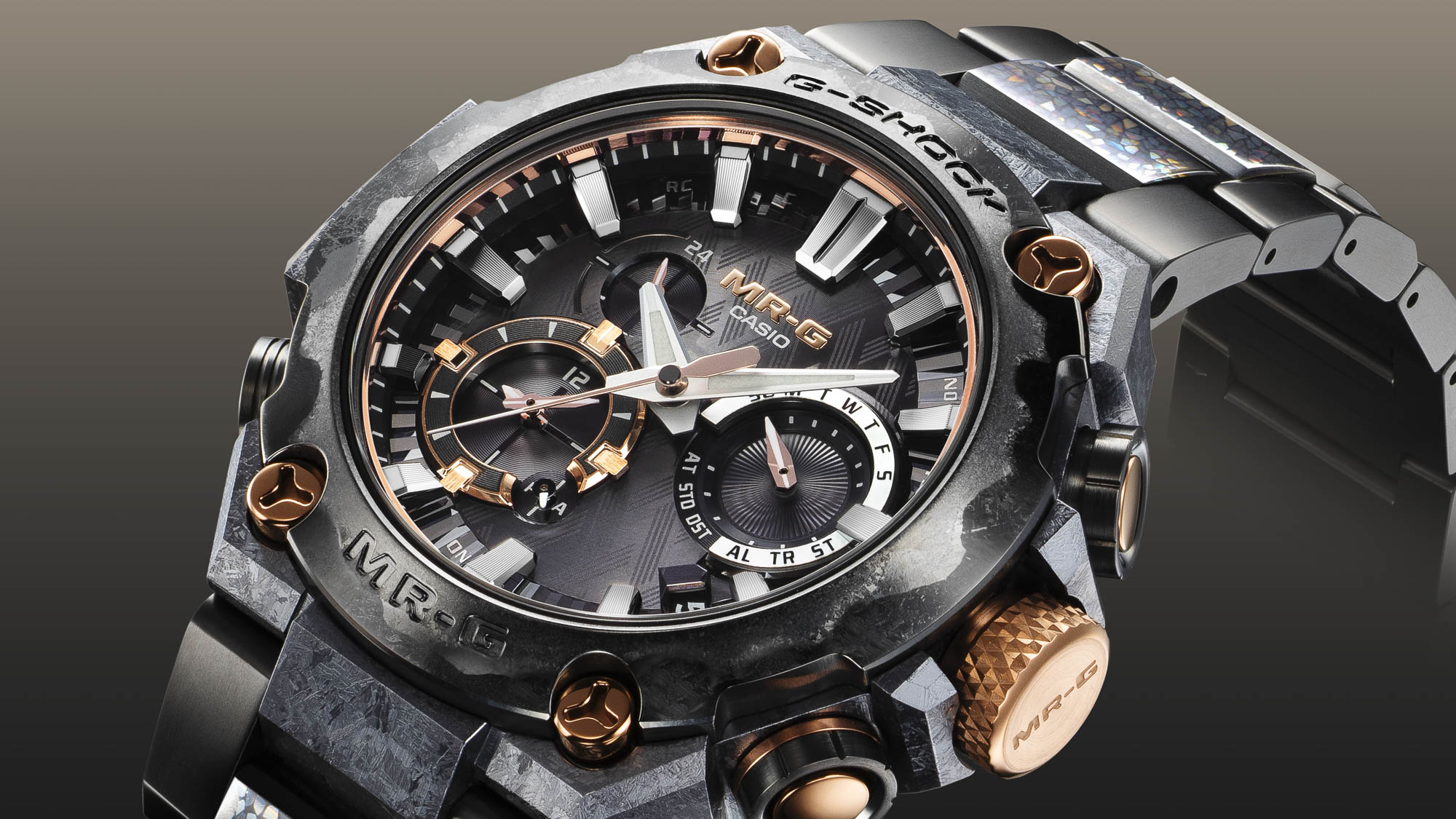 Beyond its stunning aesthetics, this MR-G offers advanced functionality with the 5625 module inside. This includes Bluetooth® connectivity, radio-wave timekeeping, world time, timer, stopwatch and alarm.