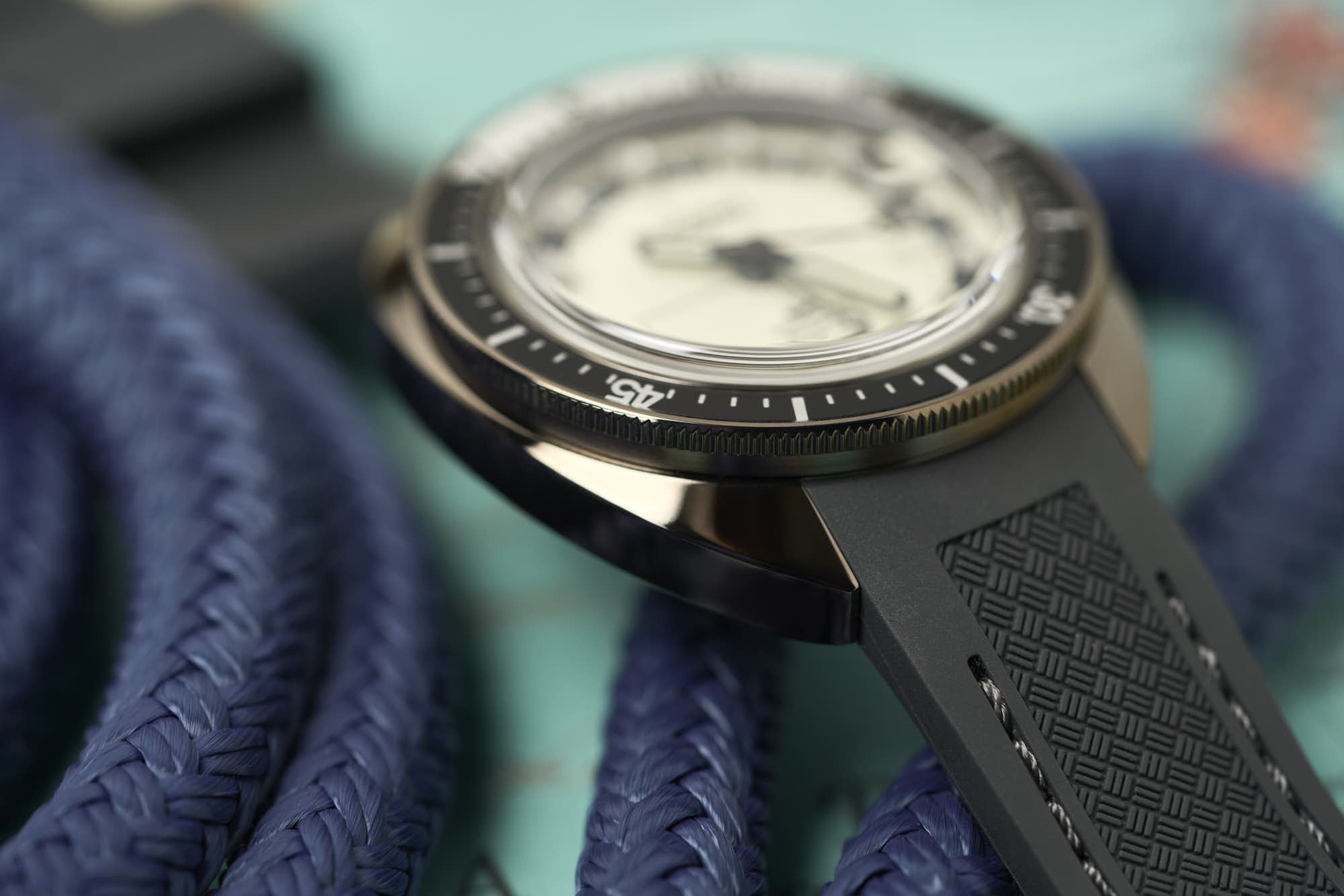 Now available in three options- stainless steel with a blue dial, rose gold tinted stainless steel with a black dial, and a fully luminescent white dial on a rubber strap.