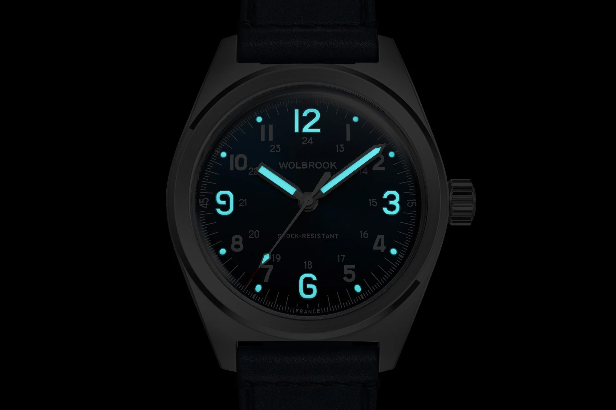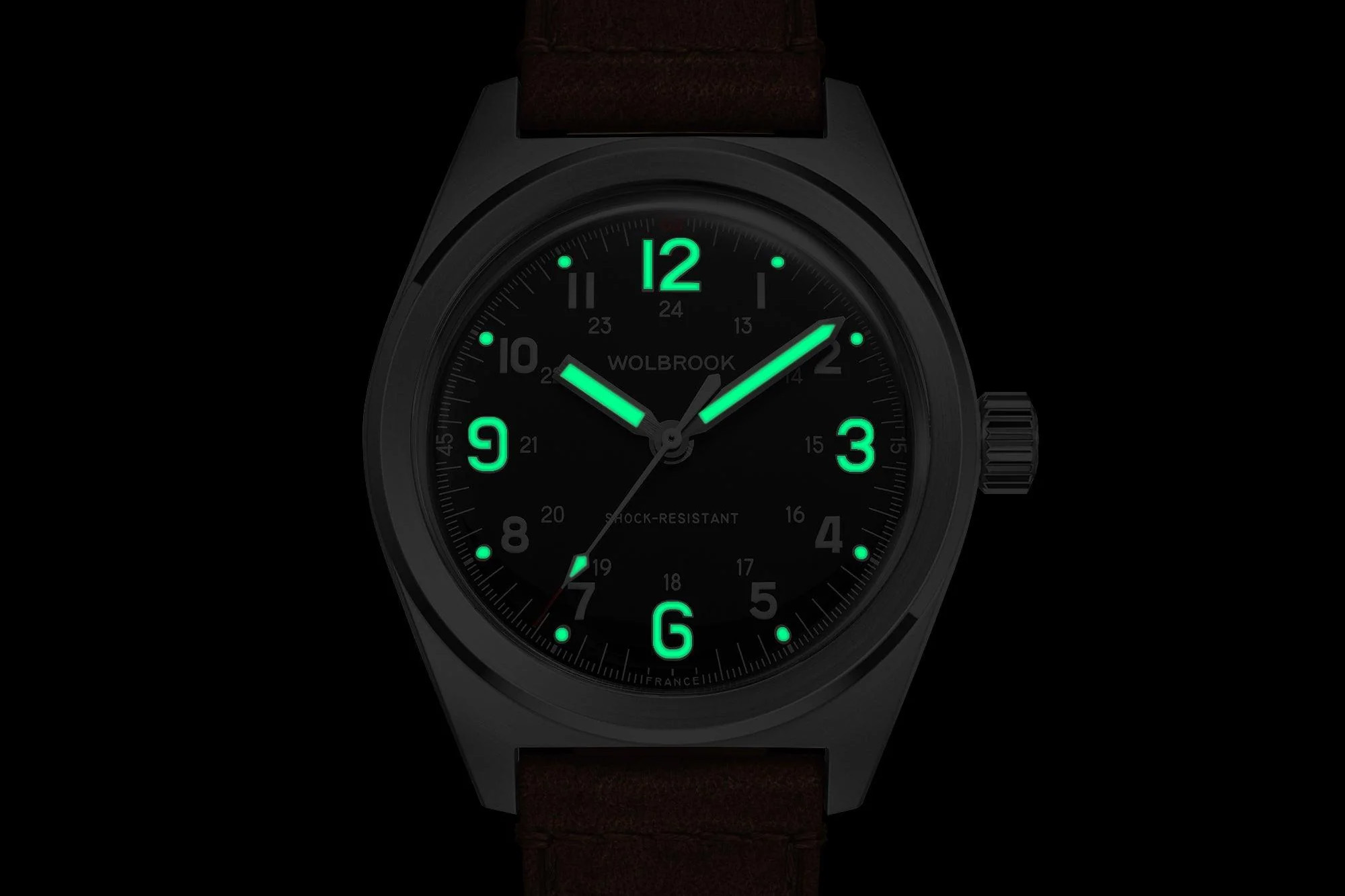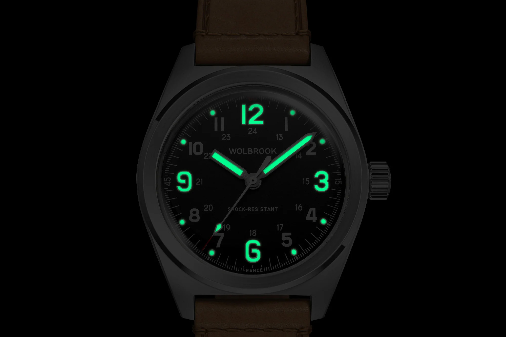 Inside is the Miyota 8315 automatic movement, modified in-house by Wolbrook's French watchmakers. They remove the date mechanism entirely for dial symmetry and regulate each movement to ±15 seconds per day—tighter than factory spec. With 60-hour power reserve and hacking seconds, it delivers proven reliability. What makes the Outrider special is honest vintage design meeting tool-watch capability and thoughtful French assembly at fair pricing—a field watch built for real use.