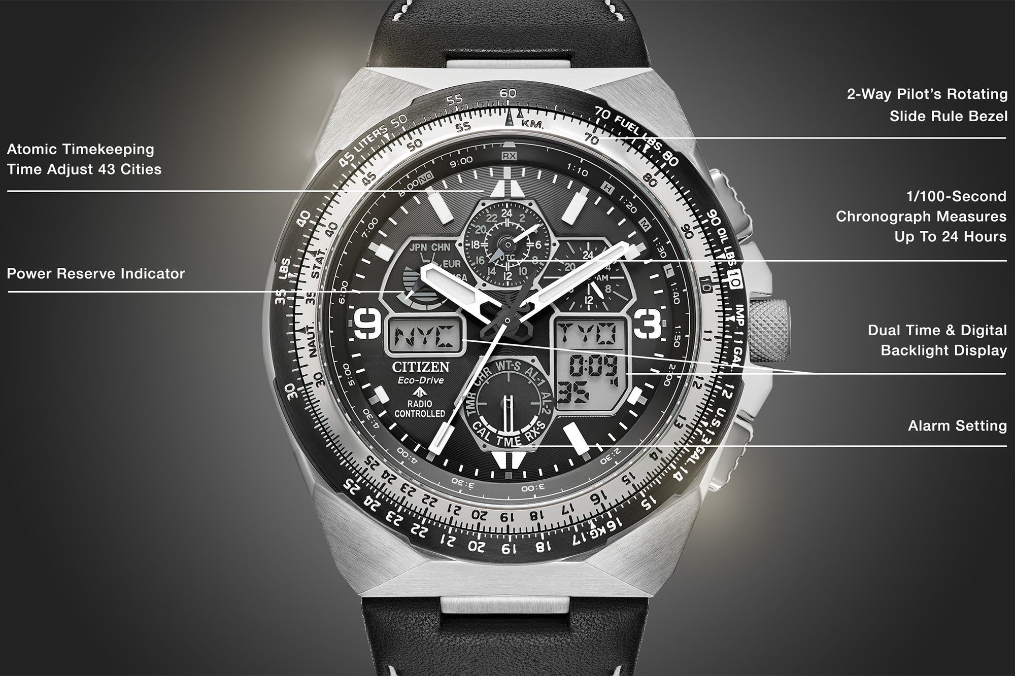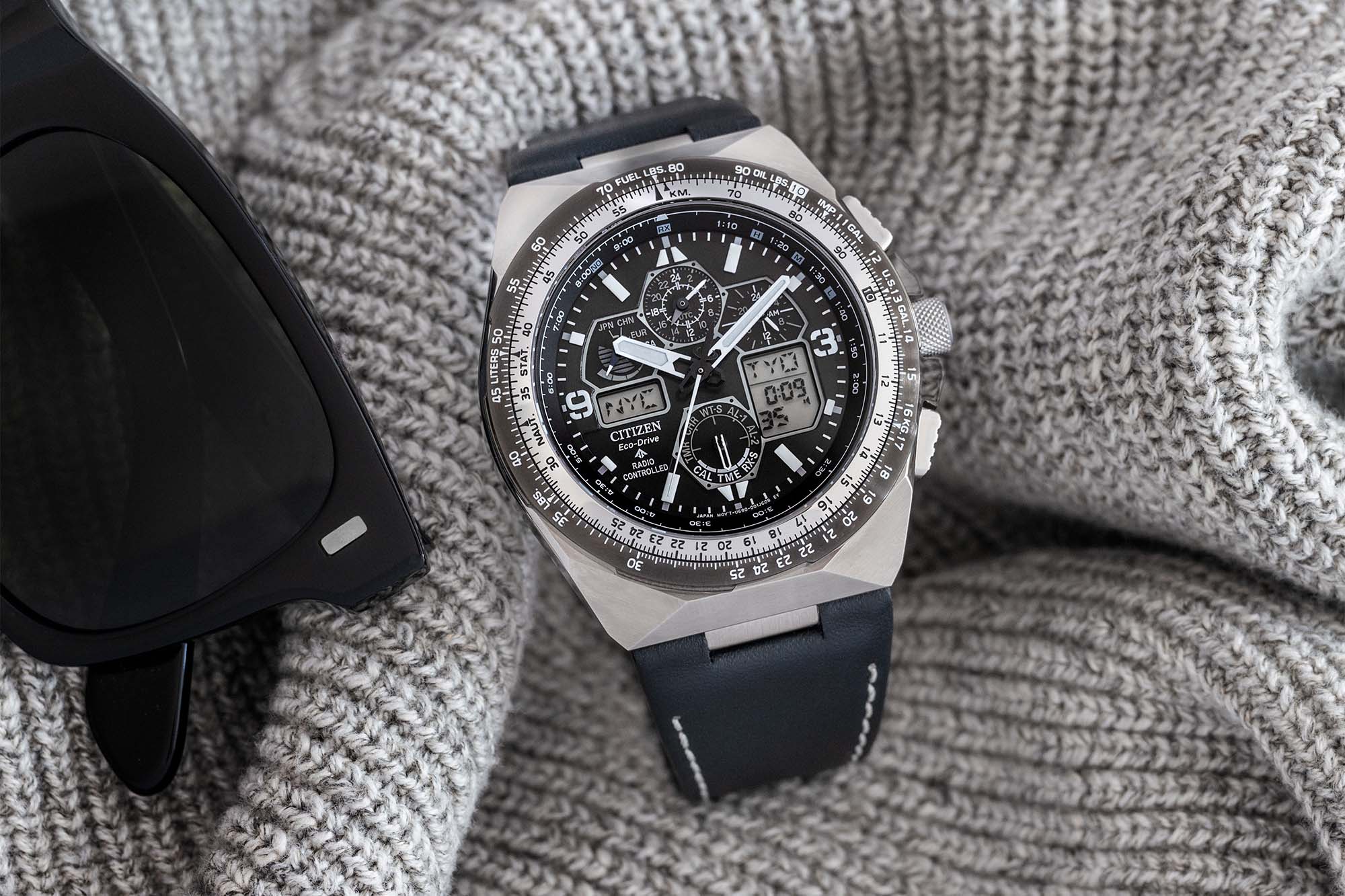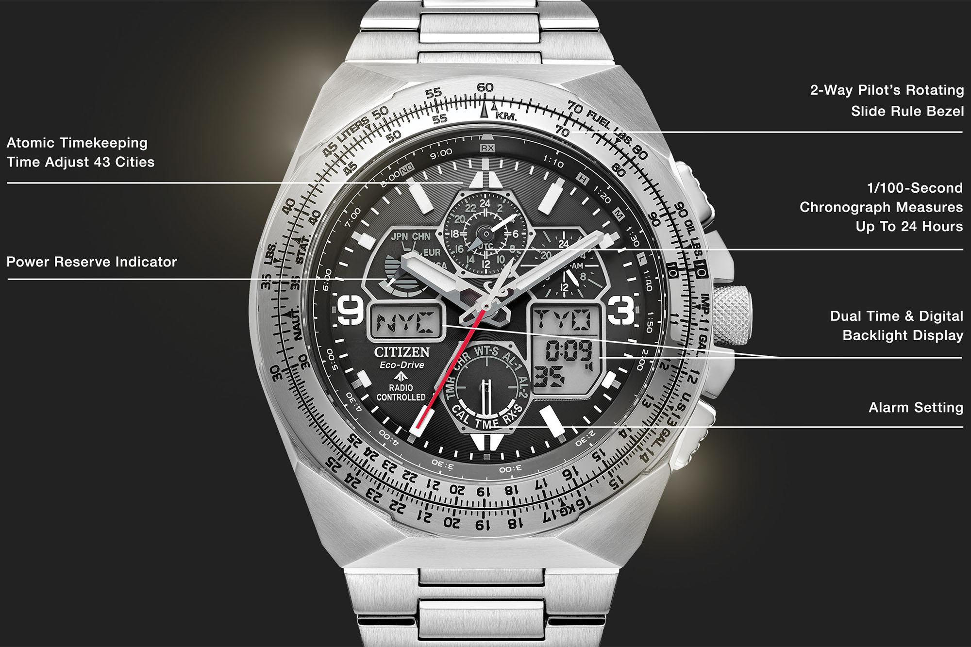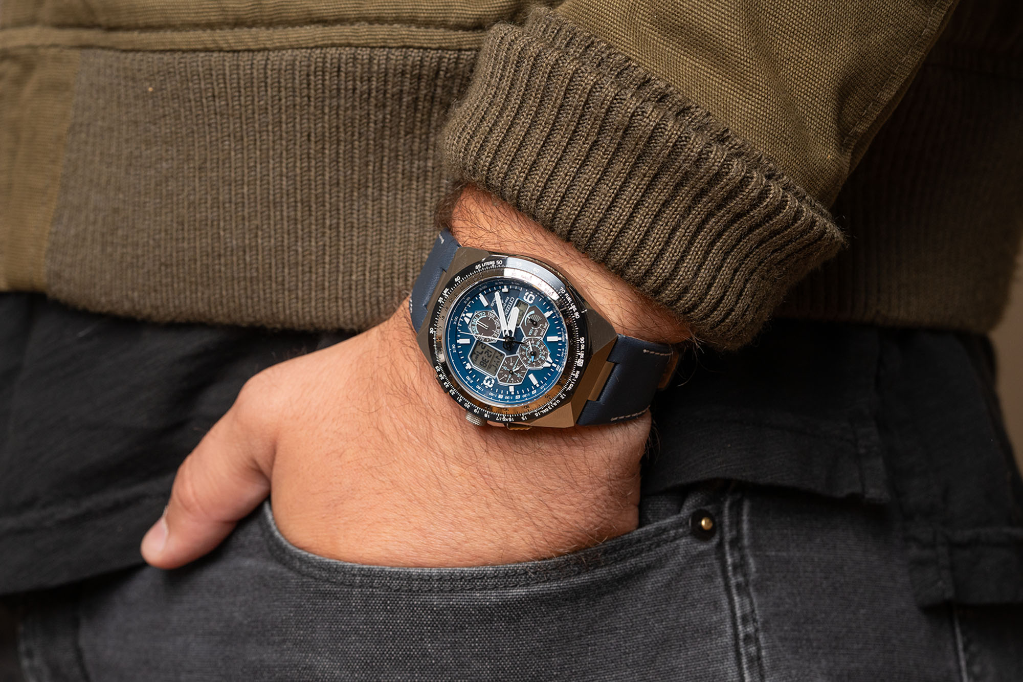 Powering the Skyhawk A-T is one of Citizen’s iconic Eco-Drive movements, the U680. Leveraging light into energy, the watch forgoes the need for battery changes while still maintaining a large feature set. Chronograph, Perpetual Calendar, Dual-Time, UTC Display, Two Alarms, 99-minute Countdown Timer and a Power Reserve Indicator on the dial. Functions that are easily legible with the Skyhawk's 46mm case.