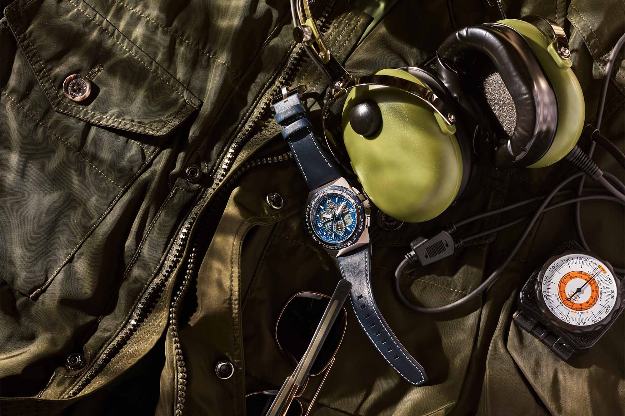 The hypermodern Skyhawk A-T utilizes atomic time clock synchronization to ensure flight times are always accurate. Keeping with its aviation roots, the watch features a 1/100 second chronograph, perpetual calendar, dual-time and UTC displays, two alarms, a 99-minute countdown timer, and a power reserve indicator. It is available in four different dial colors, black with stainless bezel, black with matching bezel, blue, and green. As for straps, the Skyhawk A-T is available with either an integrated stainless steel bracelet or a stitched leather strap matching the dial. All perfectly suited to use both on the ground and behind the control stick.