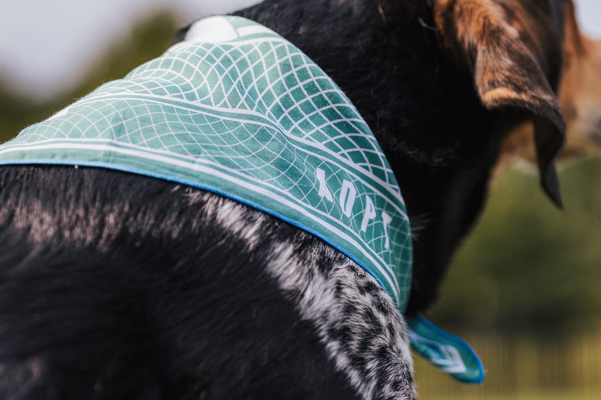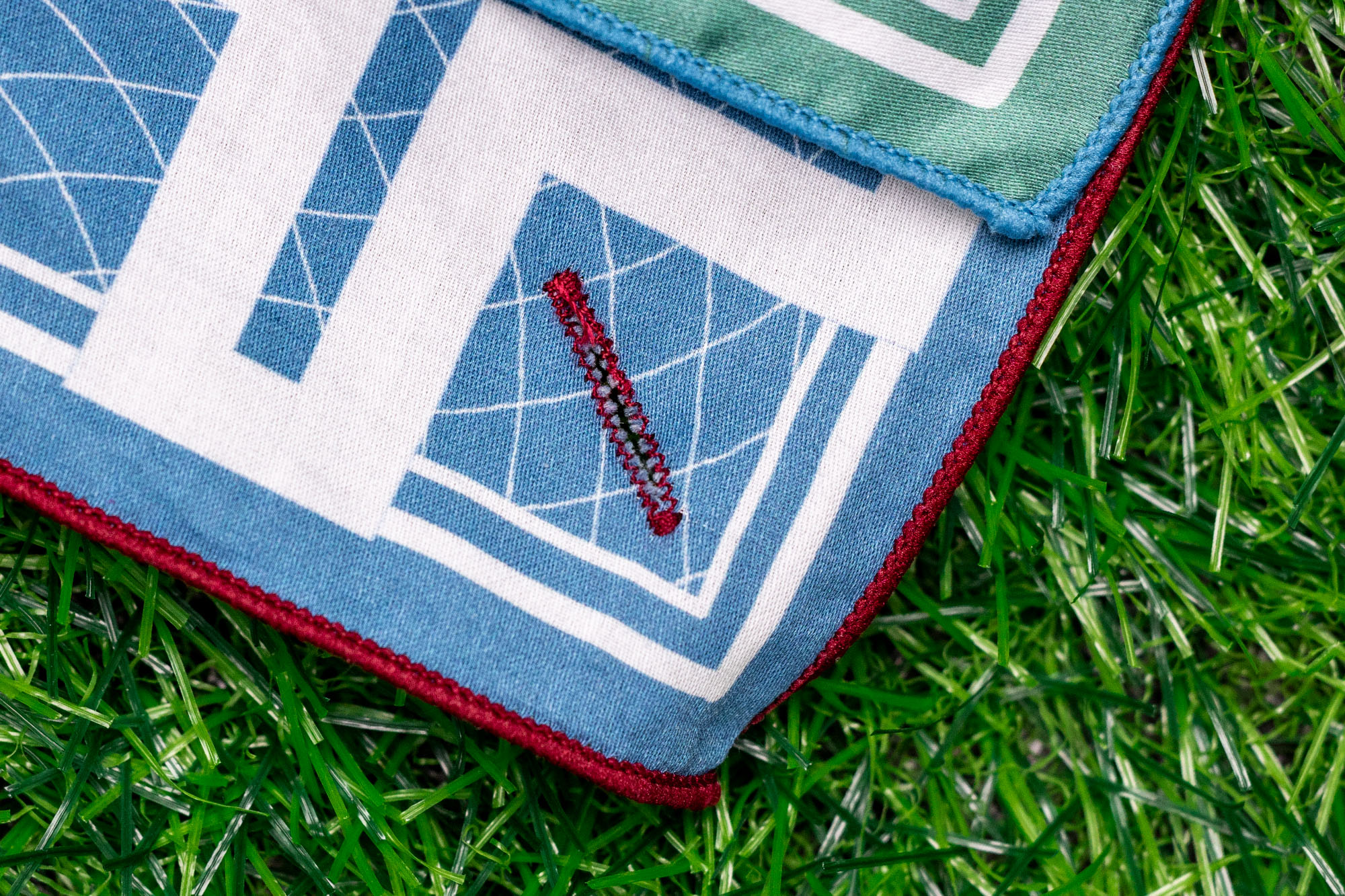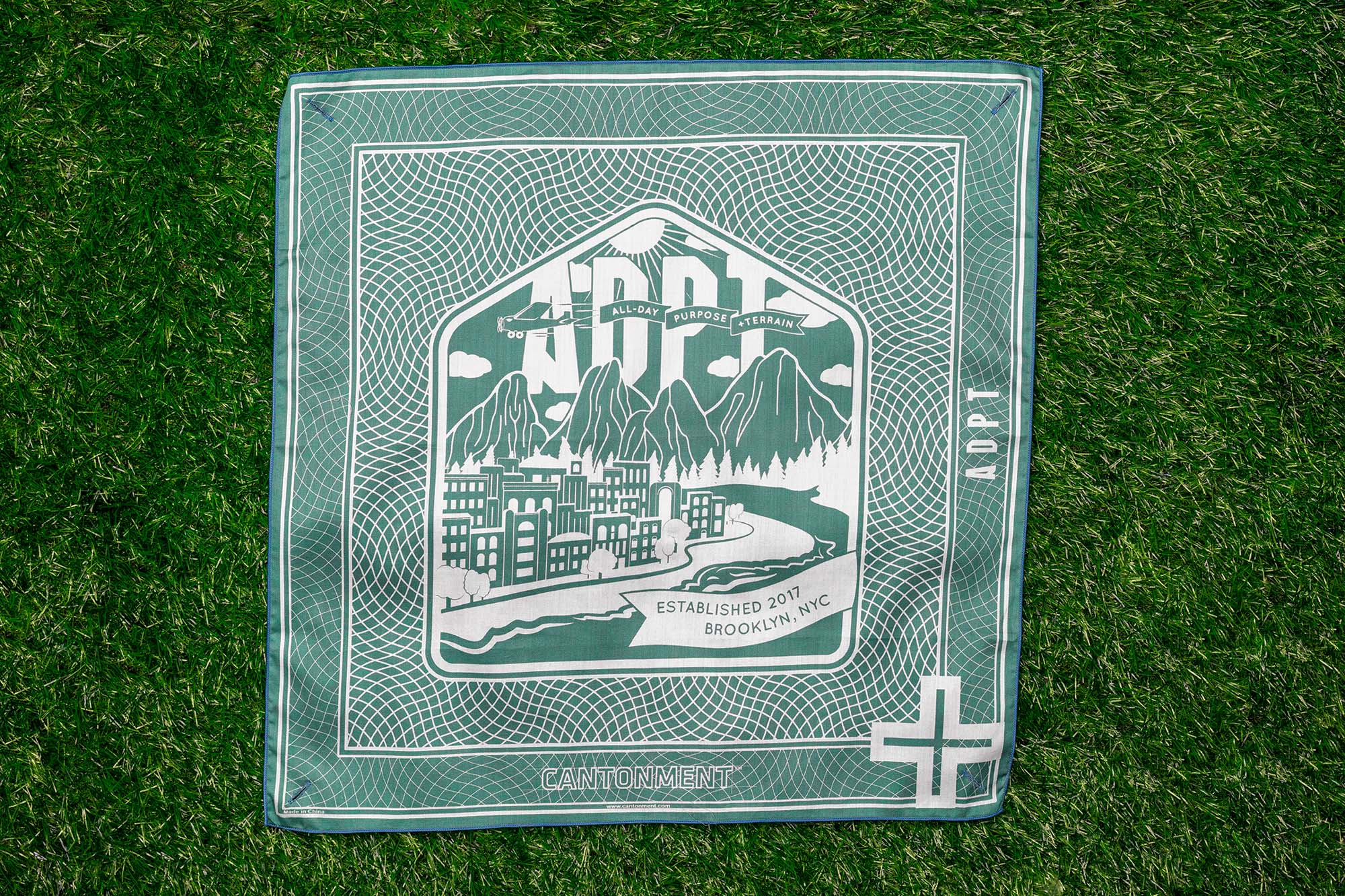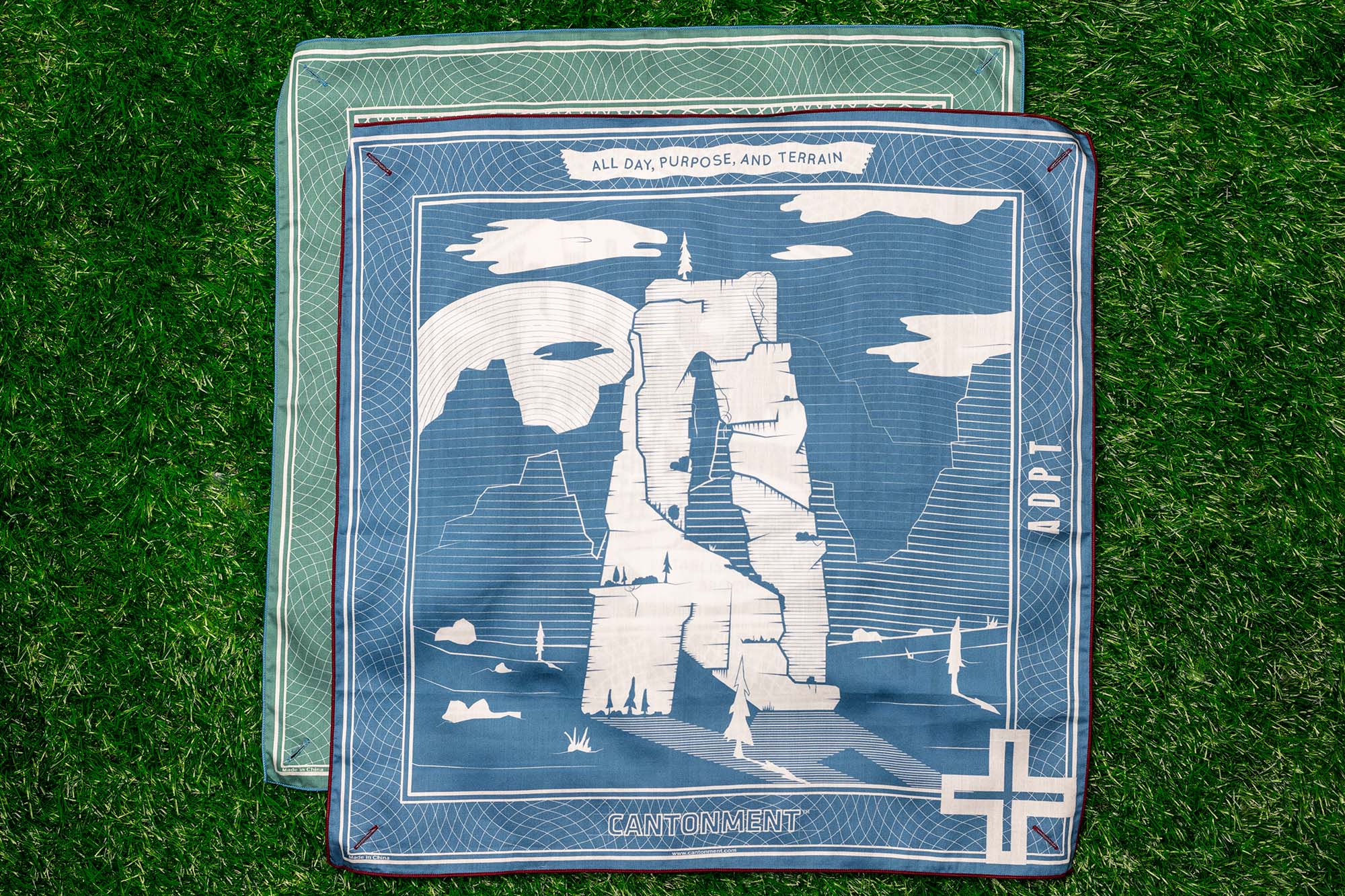 For the limited edition set, Cantonment teamed up with ADPT (All Day, Purpose, and Terrain) to create a fun duo of kerchiefs with original art. The first is called “ADPT Vista” and it’s based on the flat ADPT patch the brand has been using since launch. Instead of a flat drawing, it opens up into a view of a city on a shore, surrounded by a mountain range. This kerchief is a calming green with a teal fringe.