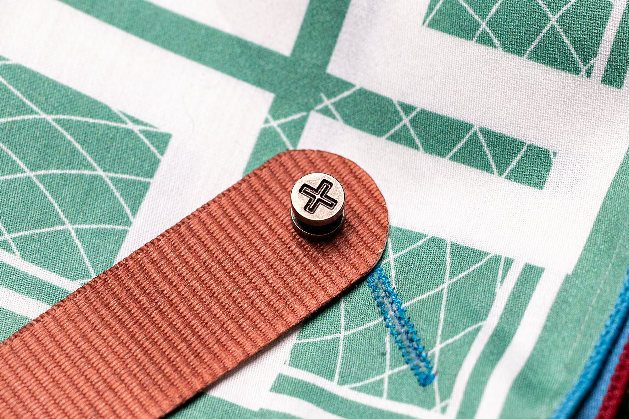 Each set comes with a super handy little contraption called a Woggle. A short strip of rugged nylon strap with a fixed button, the Woggle teams up with button holes to create the "Woggle-Toggle™" system. Together, they turn a square of fabric into a legitimately useful everyday tool.